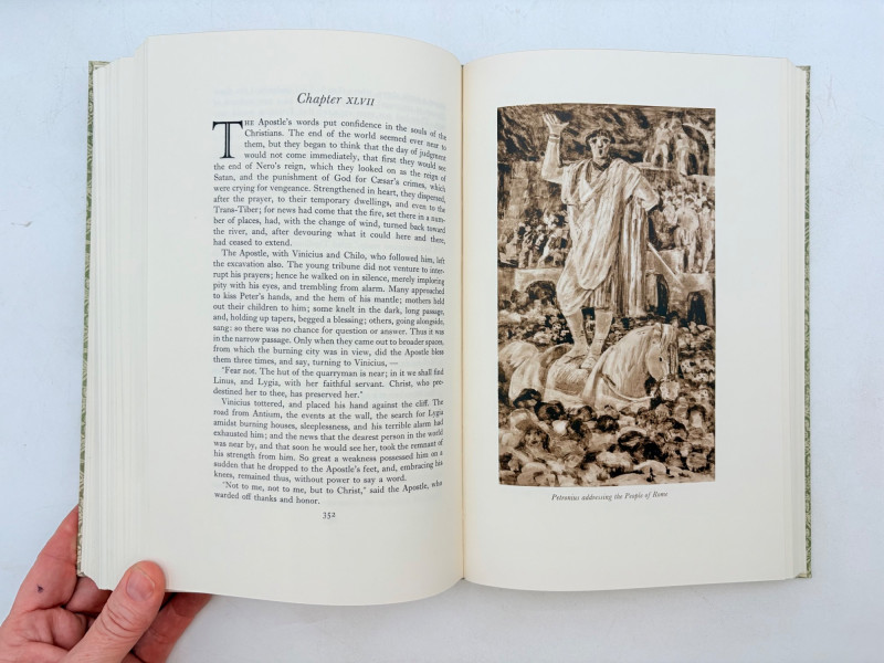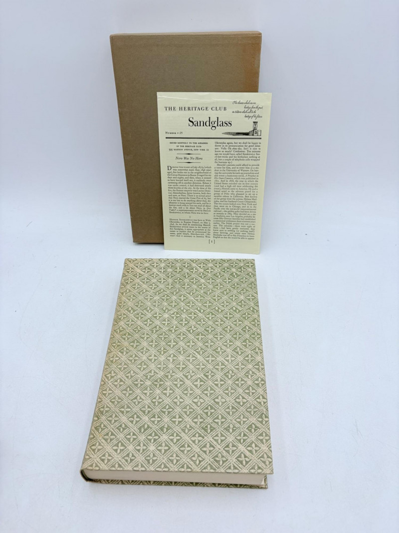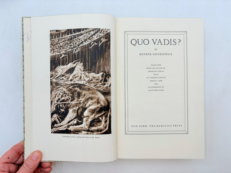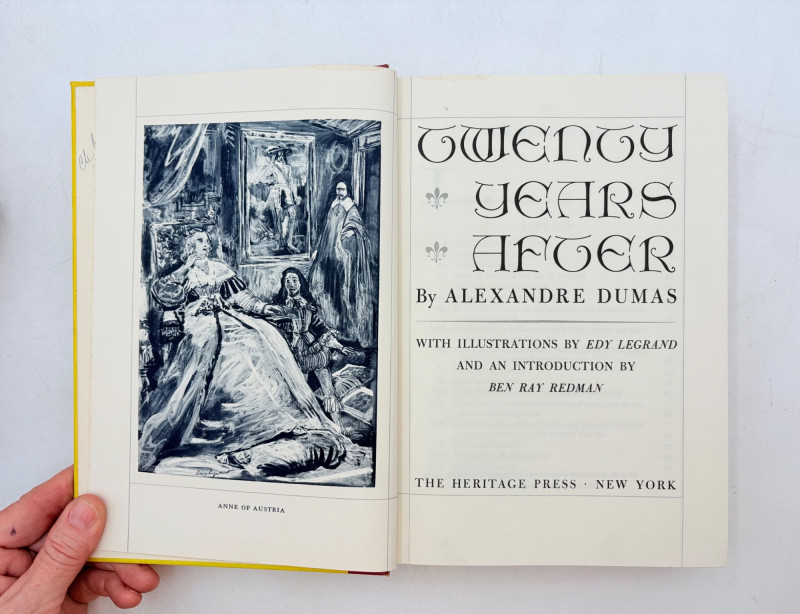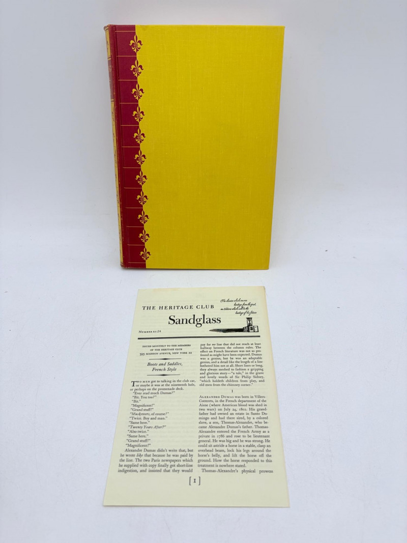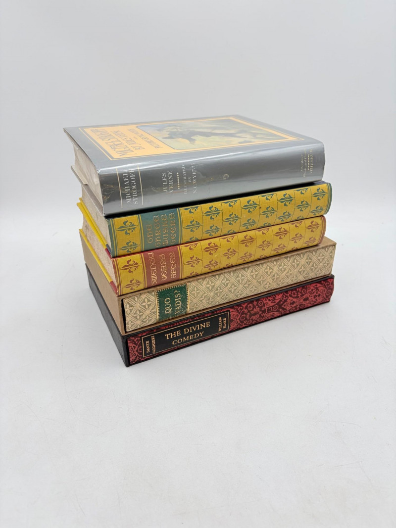 The Divine Comedy (Dante Alighieri) 1944. Heritage Press, New York. 492 p. Owner's name on inside cover. The Three Musketeers (Alexandre Dumas) 1953. Heritage Press, New York. 420 p. Owner's' name on inside cover. Michael Stroganoff (Jules Verne) 1955. Charles Scribner's Sons, New York. 397 p. Twenty Years Later (Alexandre Dumas) 1958. Heritage Press, New York. 496 p. Owner's name on inside cover. Quo Vadis? ((Henryk Sienkiewicz) 1960. Heritage Press, New York. 525 pages. Owner's name on inside cover. Heritage Press existed from 1937 - 1982. They published almost exclusively classics in literature and history. Their publications were known for terrific illustrations, quality materials, and elegant covers that were lovely without being overly precious.