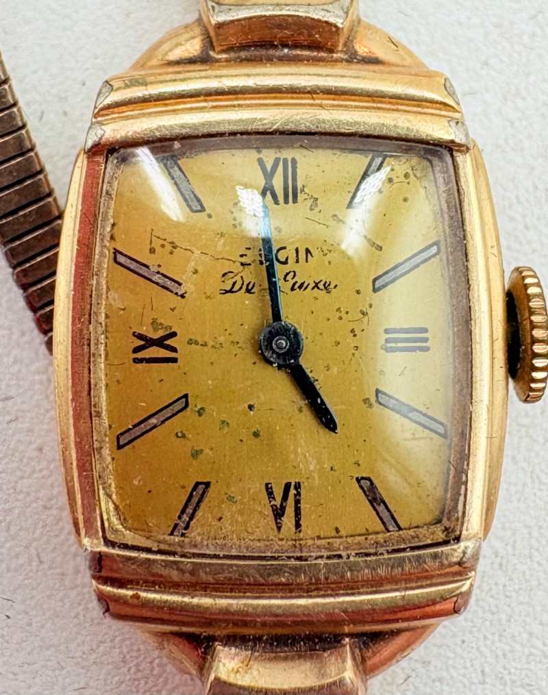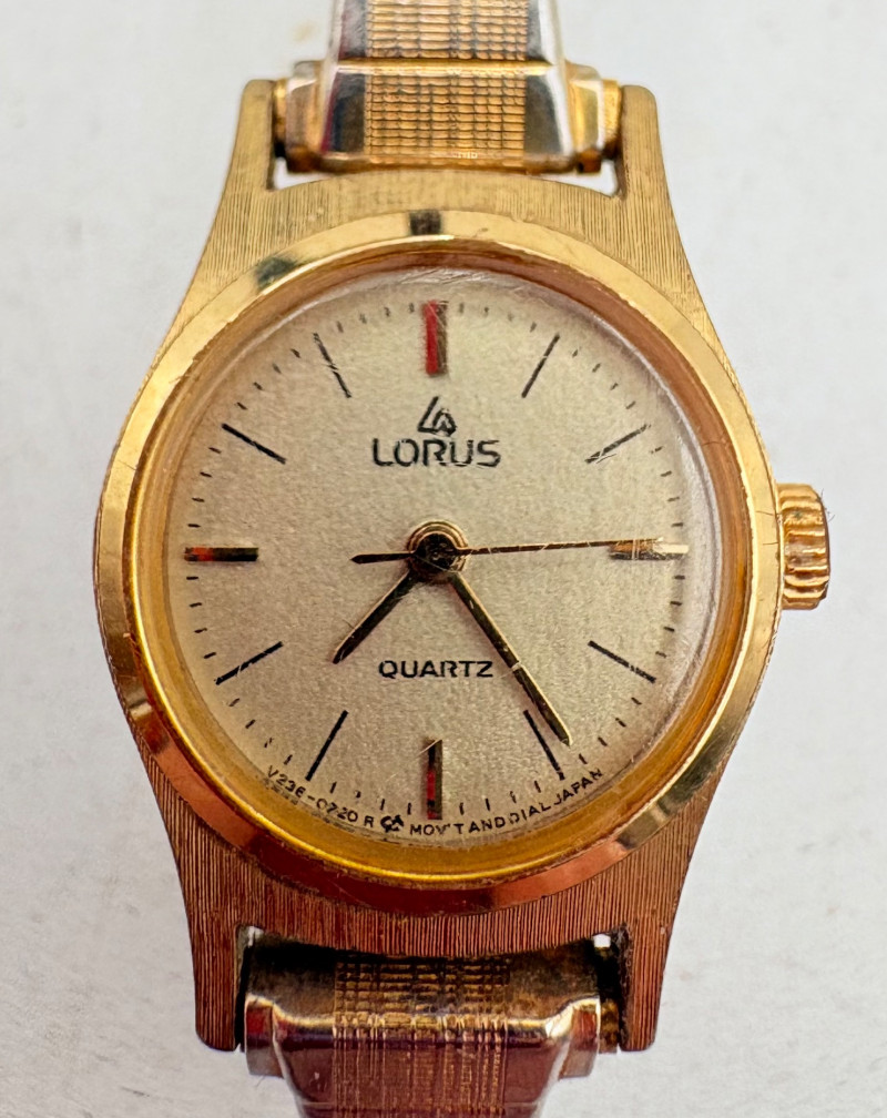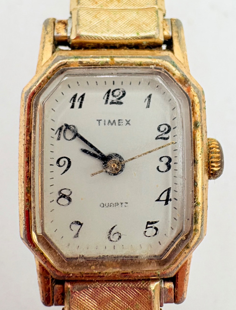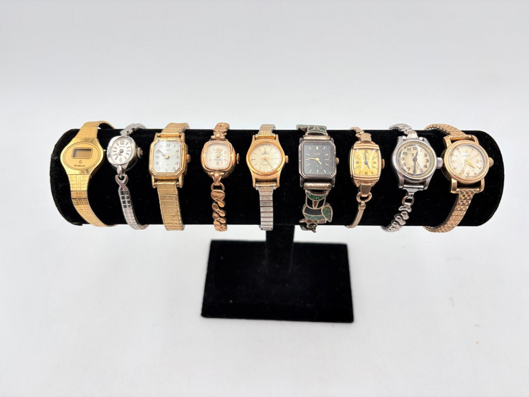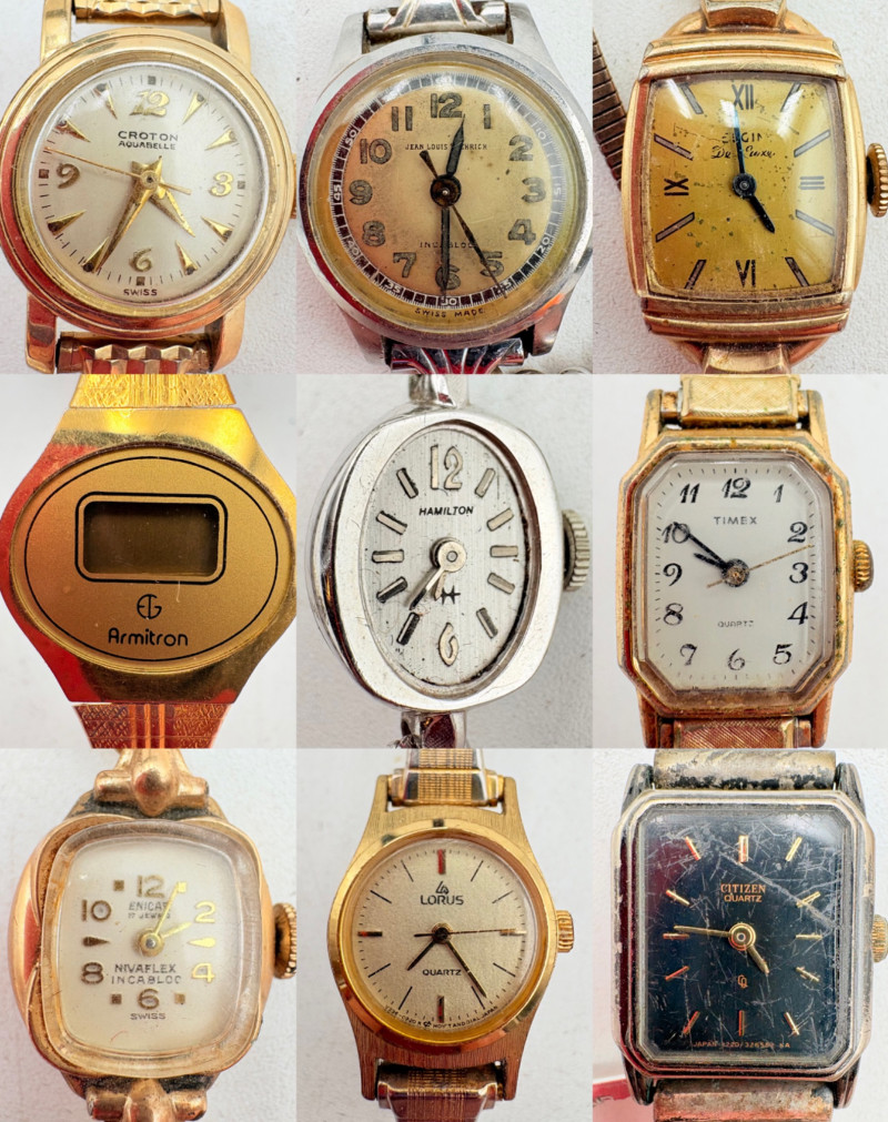 9 women's watches - all are vintage and a few are name brand: Armitron, Timex, Elgin, Lorus, etc. Please note that we have not tested any of these and they probably all need new batteries. All have been loved a lot but are still pretty smart in terms of classic styling; you should find one that will work for any outfit here.