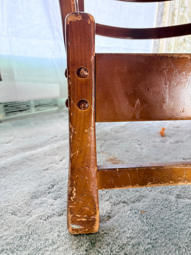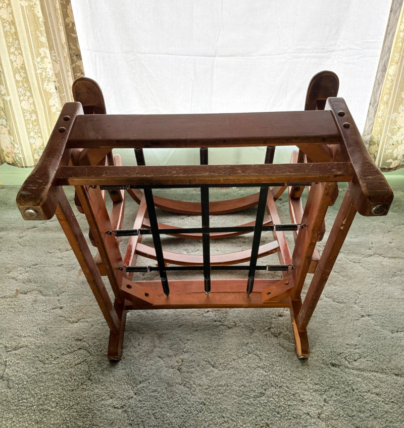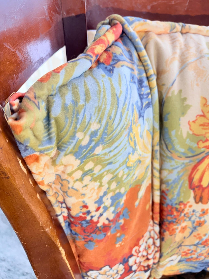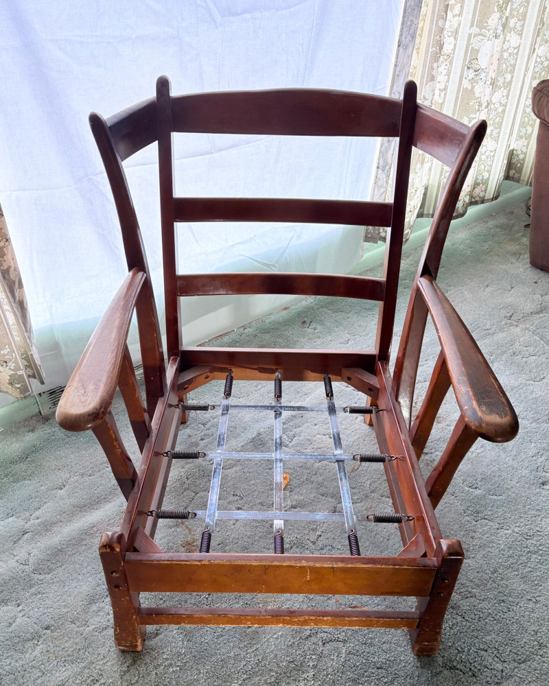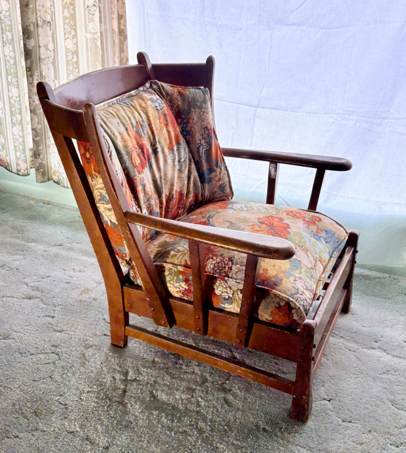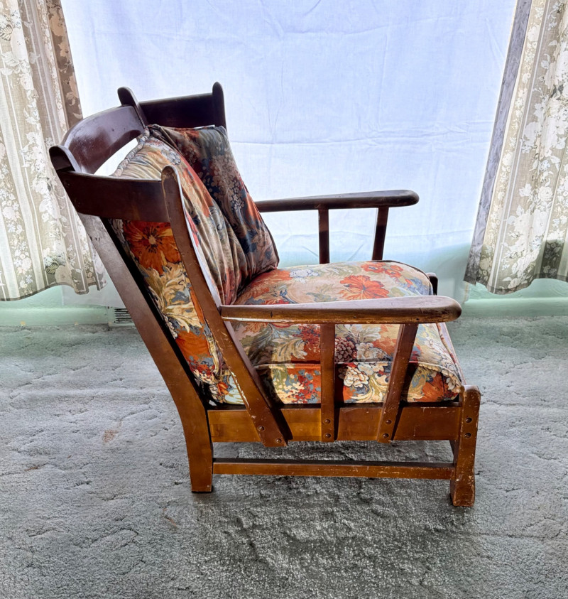 Initially, we were not going to put this chair into the auction because it is rather odd-looking and if you DO like its looks, it needs some TLC. However, we happened to sit in it and now we know why the clients kept it so many years - it's amazingly comfortable! It would be great in your cabin as is with the vintage fabric or a quick refinish of the wood and updating the fabric cushions might really make this ugly duckling turn into a swan. Solid wood construction with a modified wing back frame, splayed squarish front legs, subtle back curve with pitch, and sturdy steel springs. The vintage velveteen fabric on the cushions is partially hand-sewn and we are guessing the interior is the original horsehair stuffing given its feeling of density (we would probably reuse the stuffing for new cushions if we made them - we love the heft of the older materials as opposed to foam). Measures approx. 32" H x 29" W x 32" D.