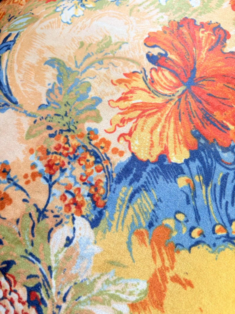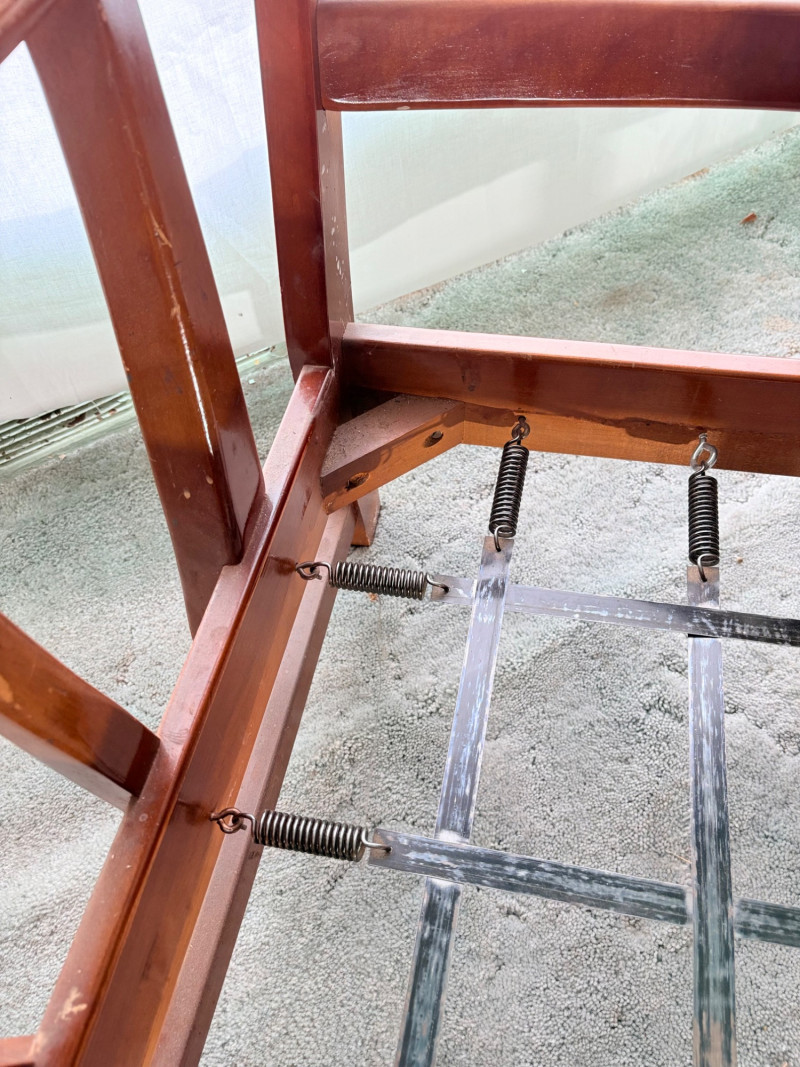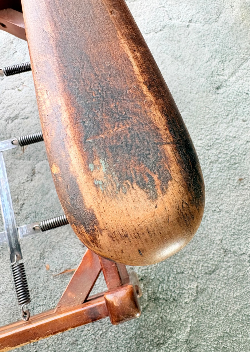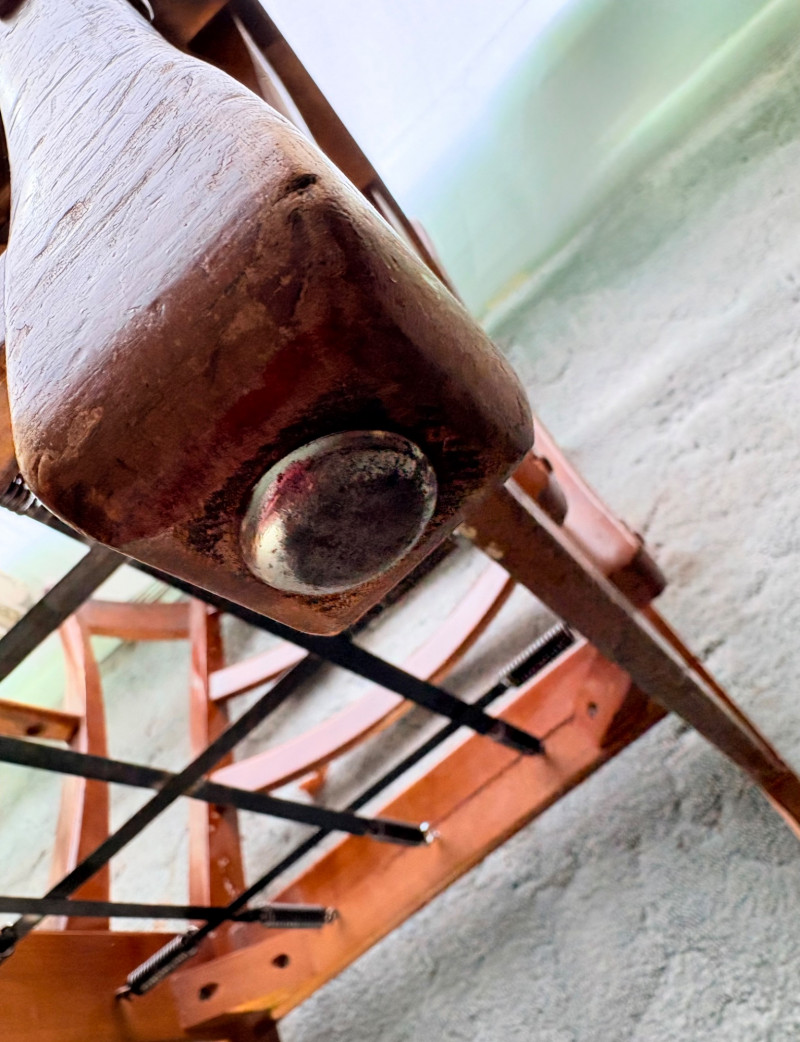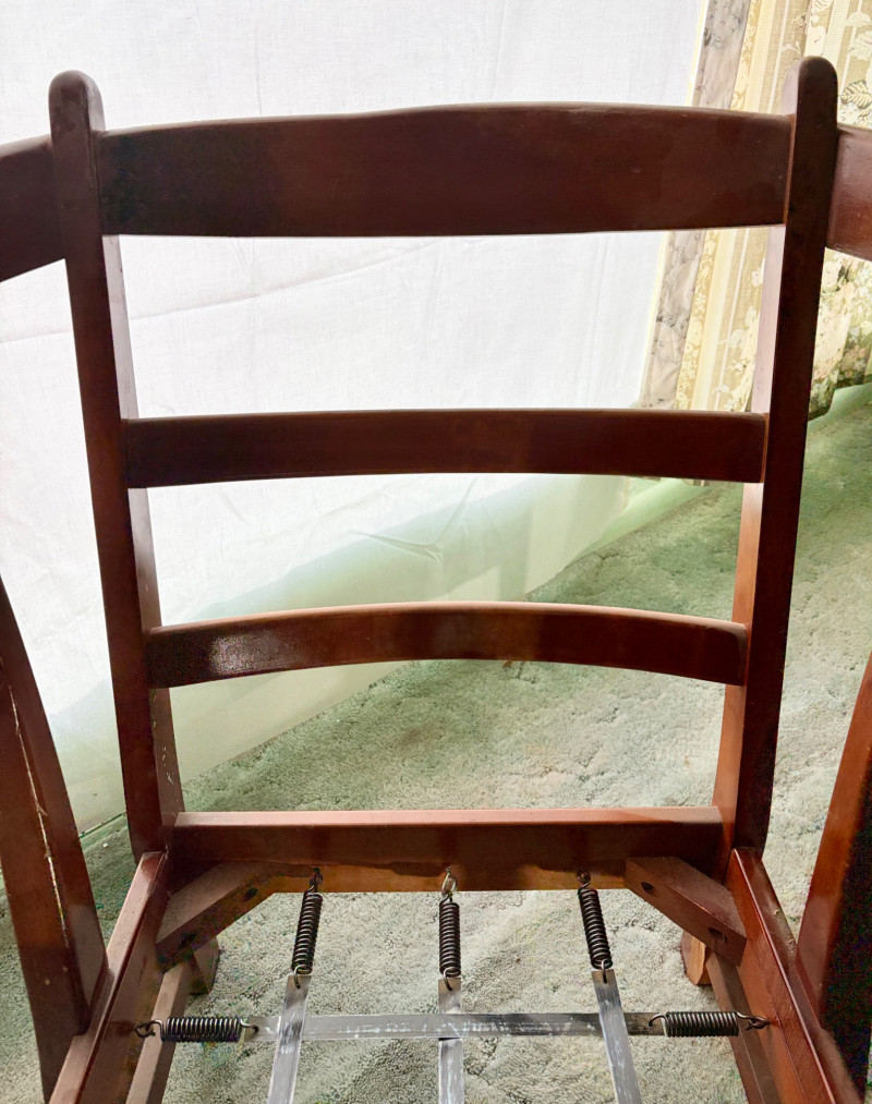 Initially, we were not going to put this chair into the auction because it is rather odd-looking and if you DO like its looks, it needs some TLC. However, we happened to sit in it and now we know why the clients kept it so many years - it's amazingly comfortable! It would be great in your cabin as is with the vintage fabric or a quick refinish of the wood and updating the fabric cushions might really make this ugly duckling turn into a swan. Solid wood construction with a modified wing back frame, splayed squarish front legs, subtle back curve with pitch, and sturdy steel springs. The vintage velveteen fabric on the cushions is partially hand-sewn and we are guessing the interior is the original horsehair stuffing given its feeling of density (we would probably reuse the stuffing for new cushions if we made them - we love the heft of the older materials as opposed to foam). Measures approx. 32" H x 29" W x 32" D.