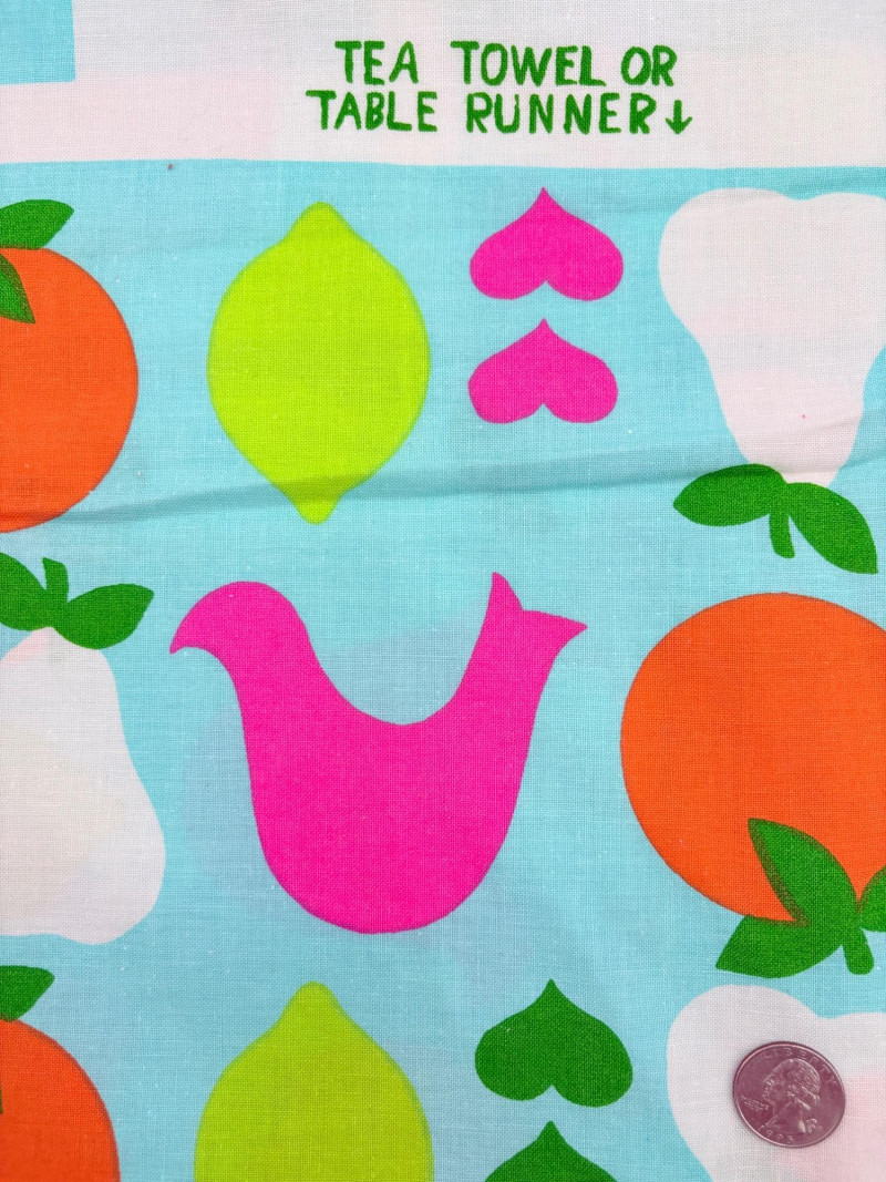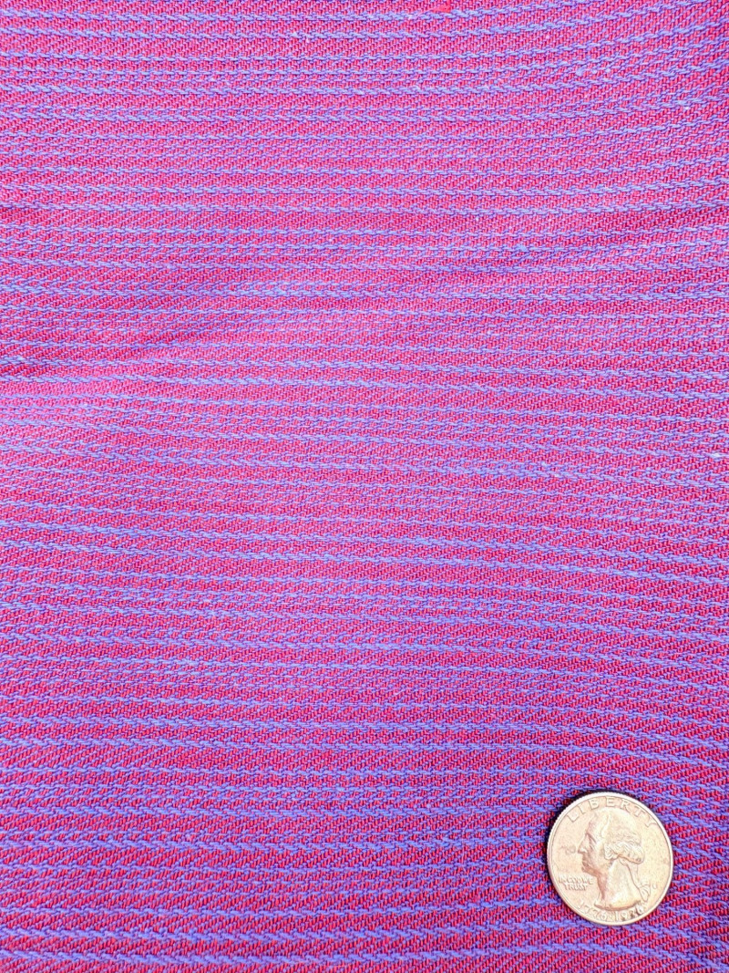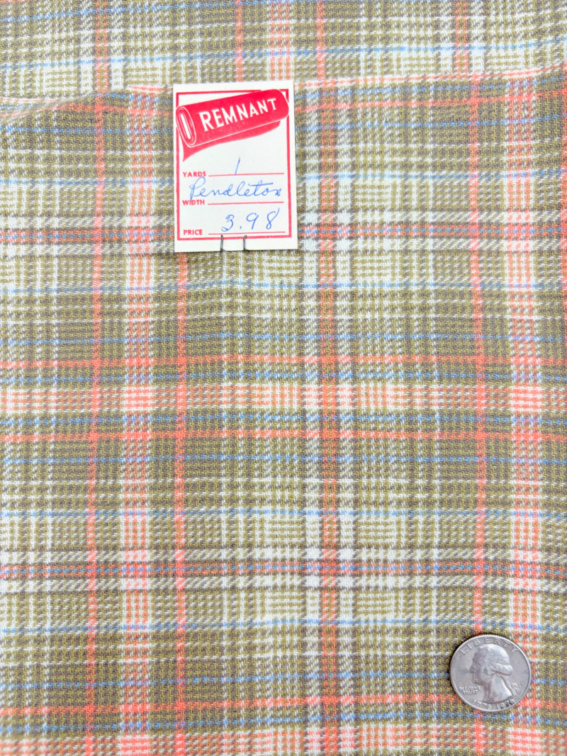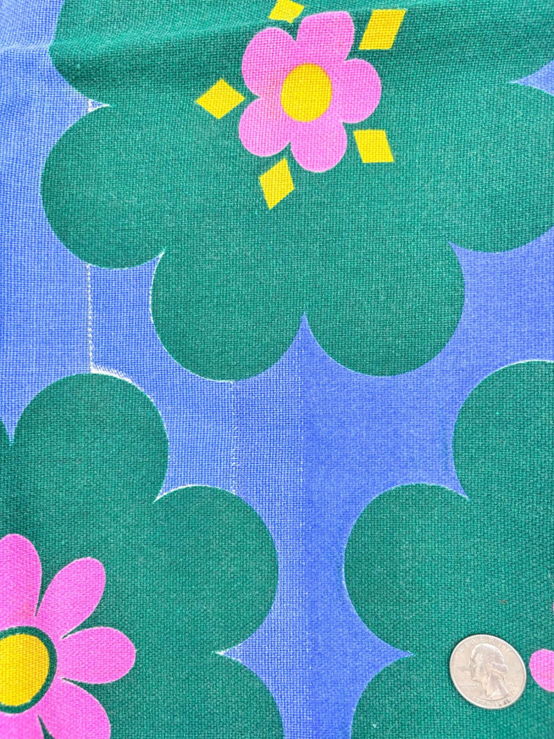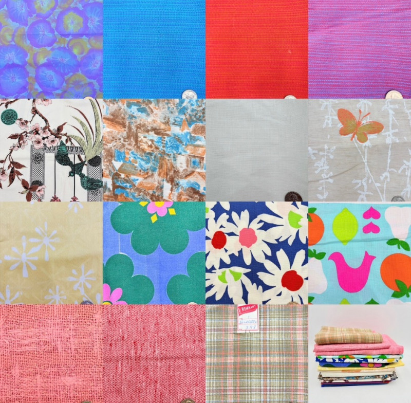 We found a stash of vintage fabrics in a large red trunk and think they are wonderful! Mixed yardage and fiber content - we did a cursory inspection of the fabric to give an estimate of the yardage - be advised that all could use a wash and they may be some stains here and there - any we noticed are noted. - dark purple, blue, and green silky fabric approx. 2.5 yards - 3 smaller pieces of striped upholstery fabric suitable for front covers of a large pillow - there a couple of dark places that might wash out. - white background with brown plants and birds/bird cage. Approx. 1.5 yards - lightweight house print in blue, brown and cream. Approx. 2 yards - solid white weave. 3+ yards - beige background with white bamboo and orange/gold butterflies. Approx. 1 yard - yellow lightweight textured cloth with white starburst. Approx. 1 yard - canvas with purple background and large green daisies. Approx. 2 yards – there are a number of flaws in this one we noticed upon cursory inspection. - white daisies on blue background with yellow, green, pink and red centers. Approx. 1 yard - napkin and tea towel/placemat print with bright fruit and birds. Approx. 1 yard - solid pink heavily slubbed weave. Approx. 1/2 yard - pink herringbone weave. Approx. 1 yard. - Pendleton wool in green and cream plaid. Approx. 1 yard