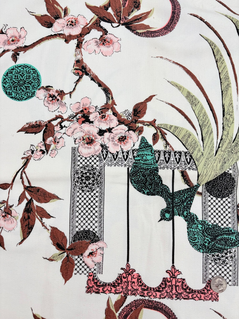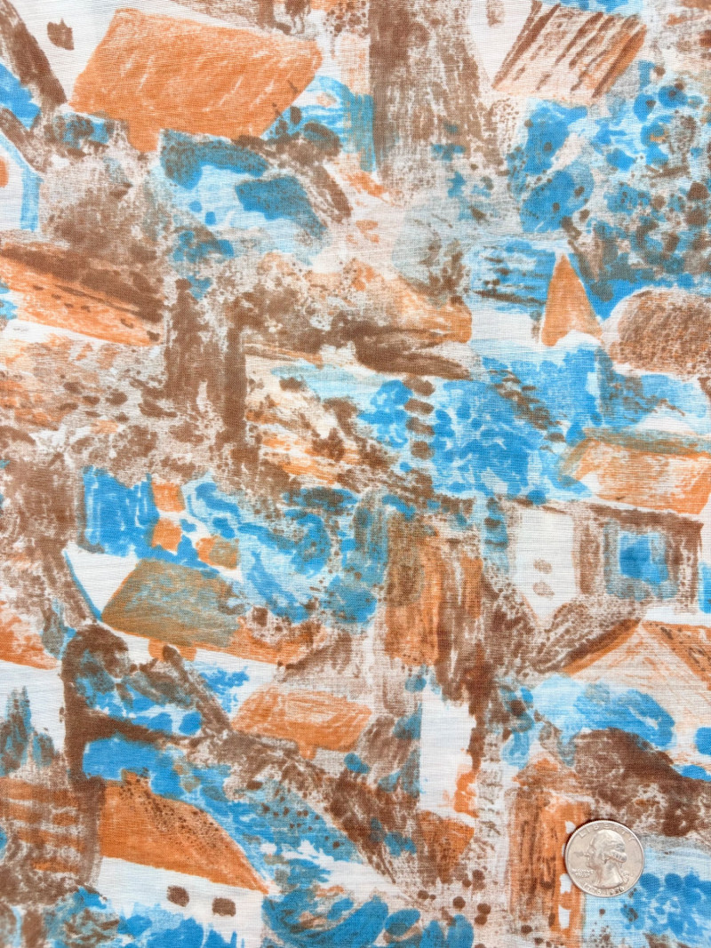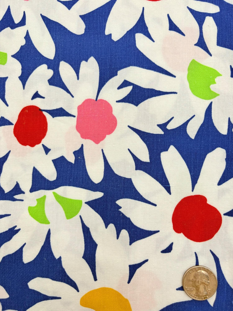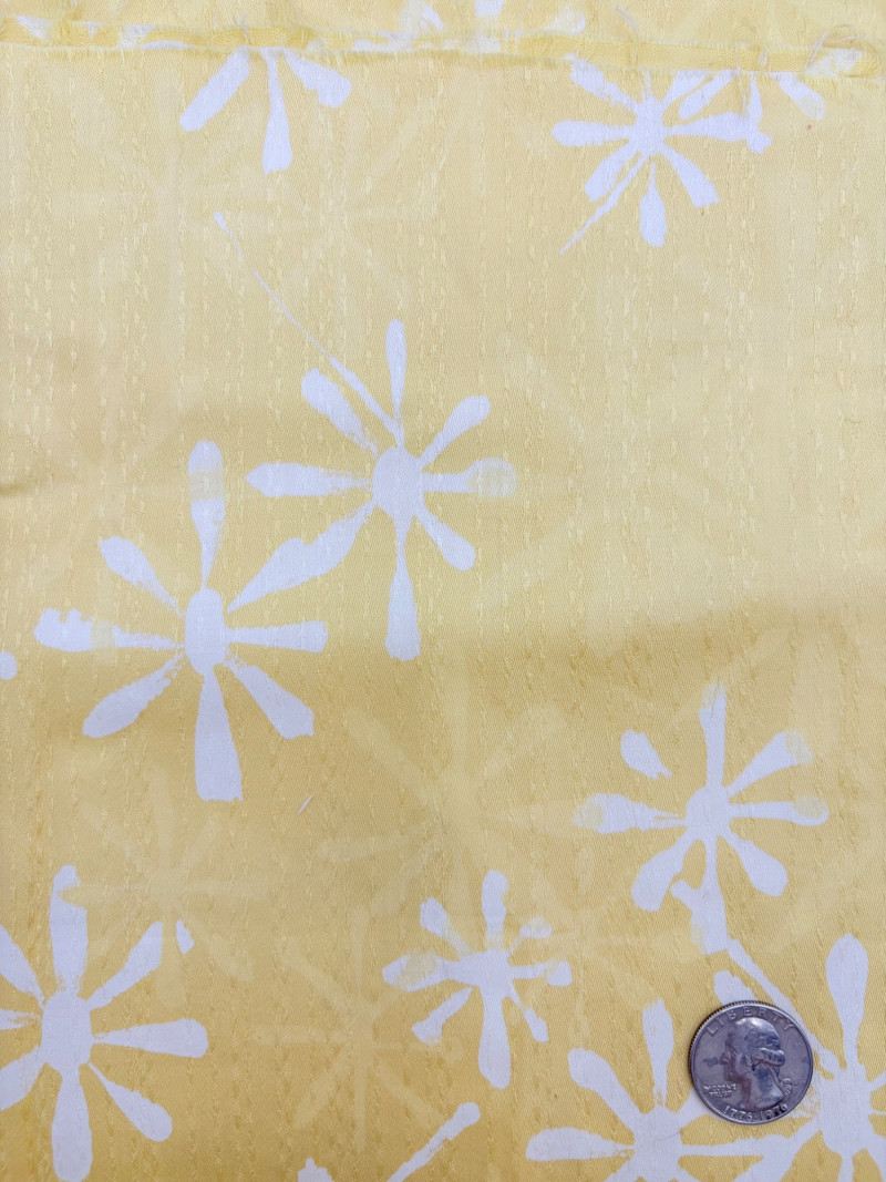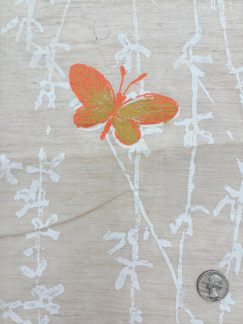 We found a stash of vintage fabrics in a large red trunk and think they are wonderful! Mixed yardage and fiber content - we did a cursory inspection of the fabric to give an estimate of the yardage - be advised that all could use a wash and they may be some stains here and there - any we noticed are noted. - dark purple, blue, and green silky fabric approx. 2.5 yards - 3 smaller pieces of striped upholstery fabric suitable for front covers of a large pillow - there a couple of dark places that might wash out. - white background with brown plants and birds/bird cage. Approx. 1.5 yards - lightweight house print in blue, brown and cream. Approx. 2 yards - solid white weave. 3+ yards - beige background with white bamboo and orange/gold butterflies. Approx. 1 yard - yellow lightweight textured cloth with white starburst. Approx. 1 yard - canvas with purple background and large green daisies. Approx. 2 yards – there are a number of flaws in this one we noticed upon cursory inspection. - white daisies on blue background with yellow, green, pink and red centers. Approx. 1 yard - napkin and tea towel/placemat print with bright fruit and birds. Approx. 1 yard - solid pink heavily slubbed weave. Approx. 1/2 yard - pink herringbone weave. Approx. 1 yard. - Pendleton wool in green and cream plaid. Approx. 1 yard
