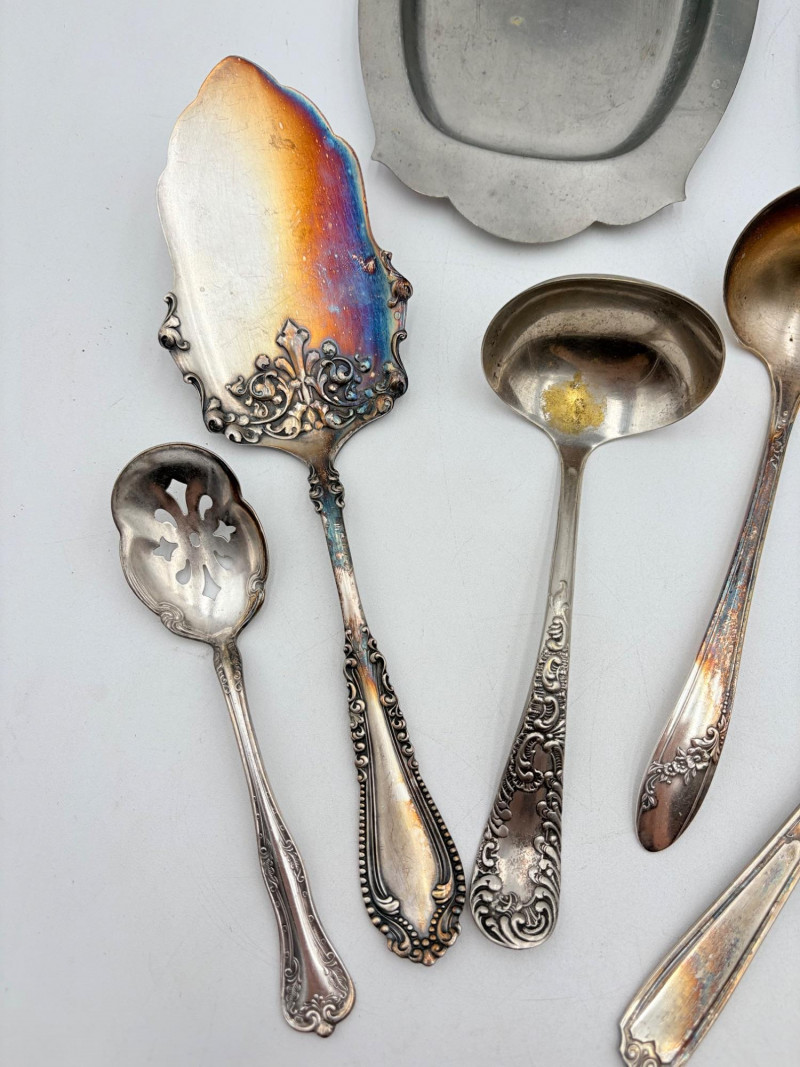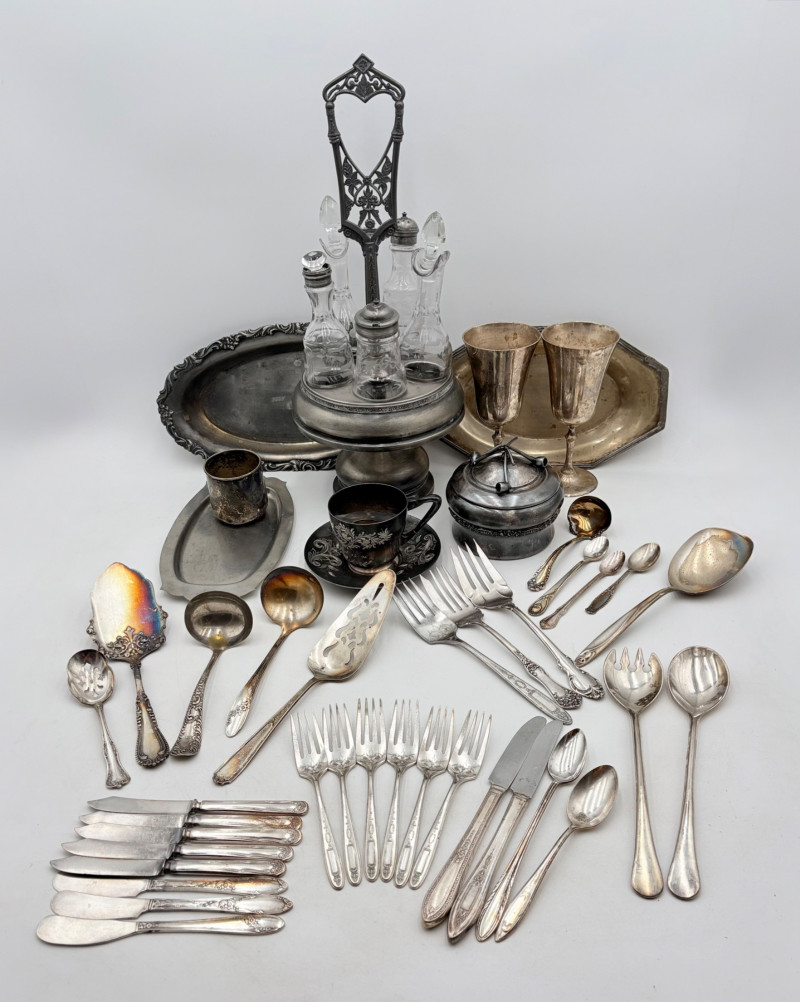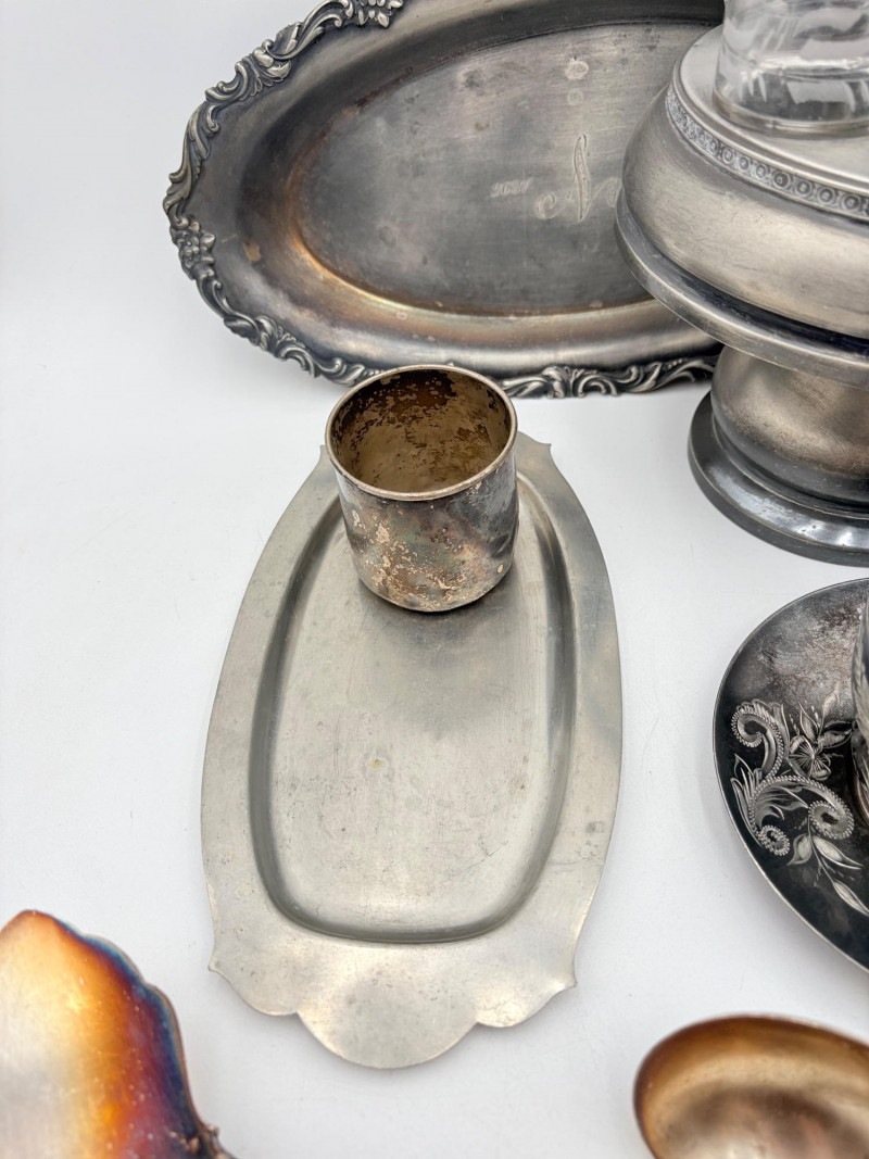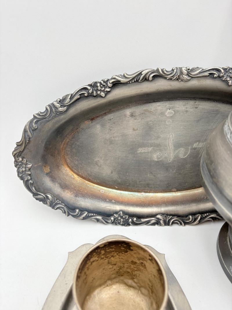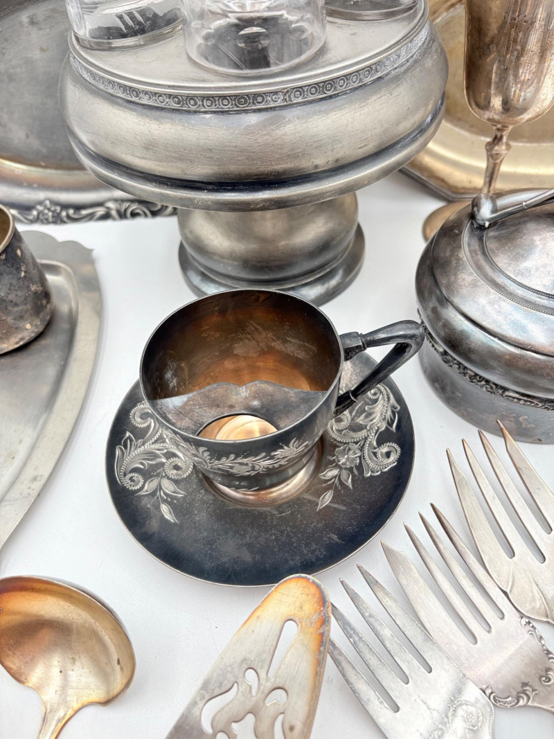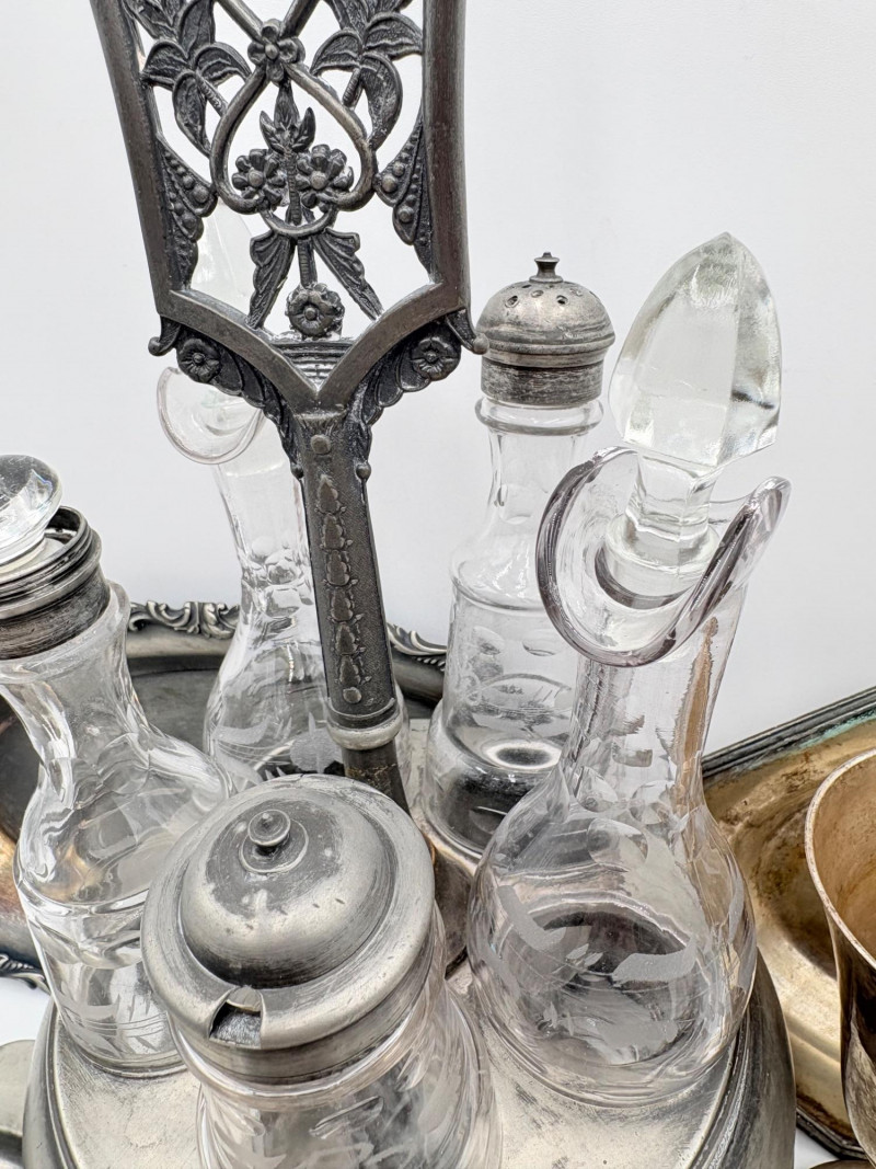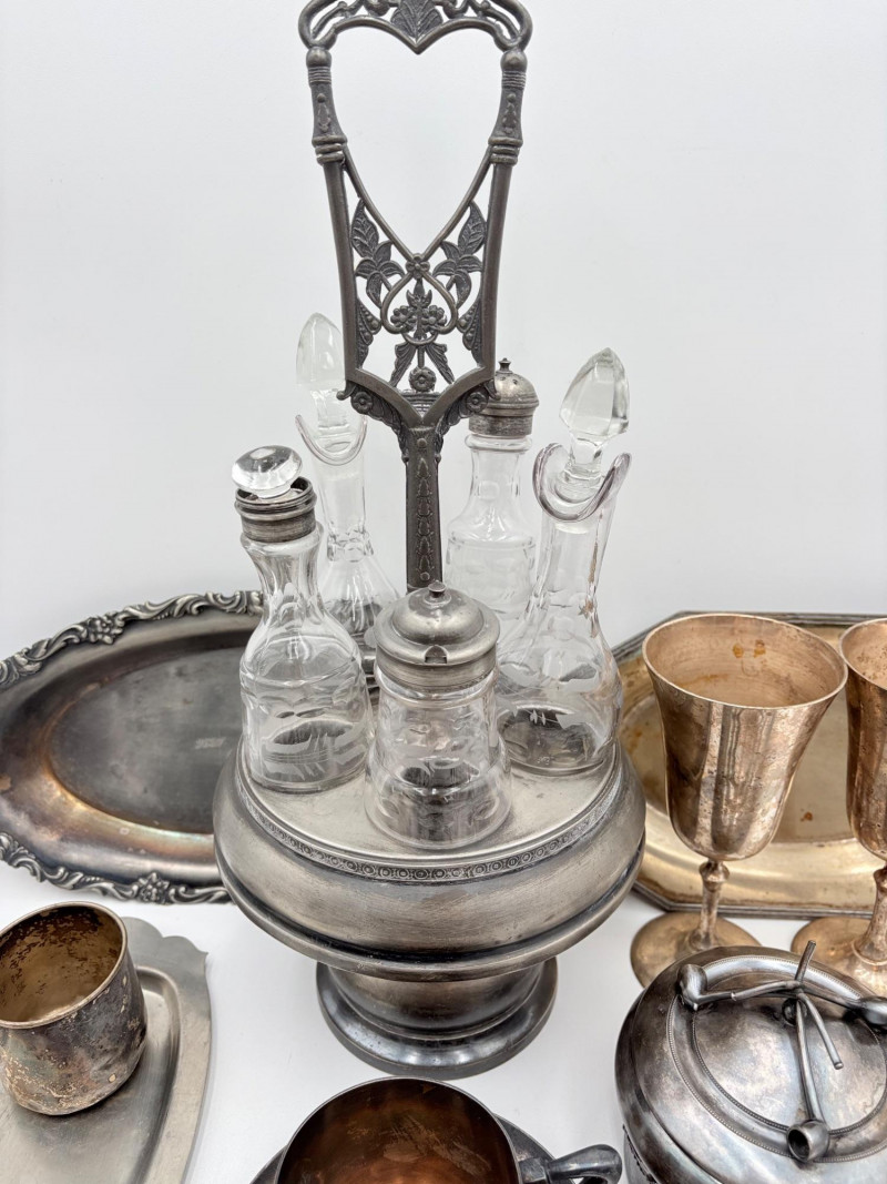 Mixed lot of pewter and siliverplate. Several items are quite old (the tray in the left back is dated 1871-1896) and there is some elegant Victorian-style design in some of the pieces - they would be great for mixed serving sets or one-off uses. All items are in need of a polishing and you may just find that some of them are worth the expense of replating. Please look closely at the photos for details. Note that on the cruet set there are a couple of chips on spouts and one of the shaker tops is missing - client put a glass stopper in it for use.