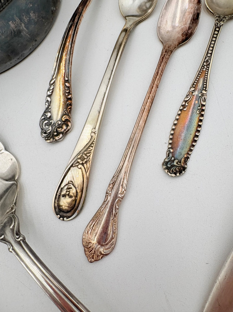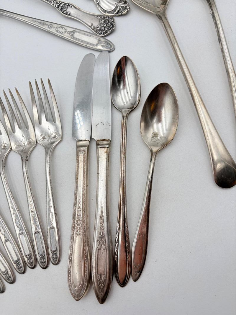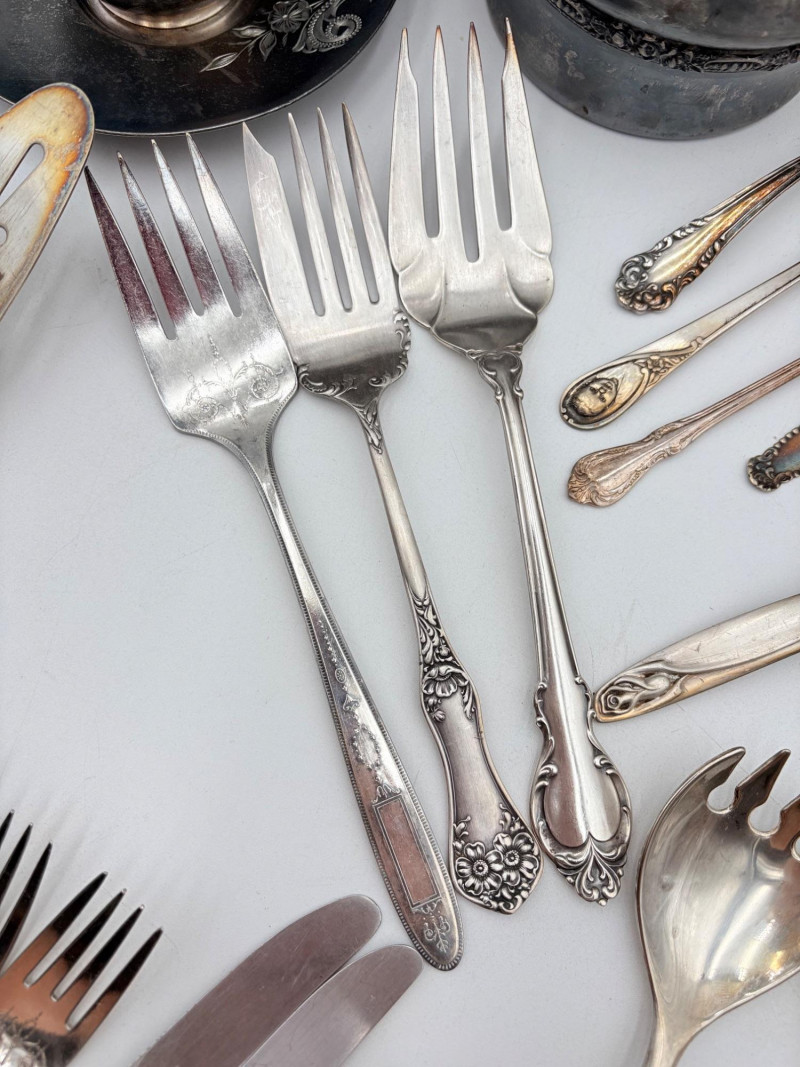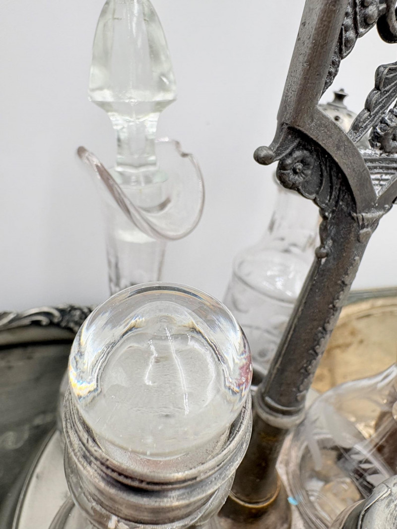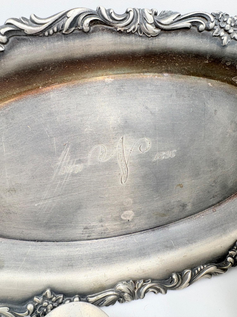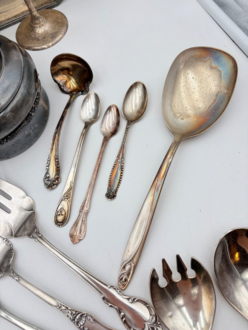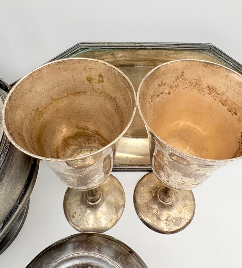 Mixed lot of pewter and siliverplate. Several items are quite old (the tray in the left back is dated 1871-1896) and there is some elegant Victorian-style design in some of the pieces - they would be great for mixed serving sets or one-off uses. All items are in need of a polishing and you may just find that some of them are worth the expense of replating. Please look closely at the photos for details. Note that on the cruet set there are a couple of chips on spouts and one of the shaker tops is missing - client put a glass stopper in it for use.