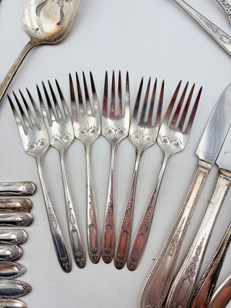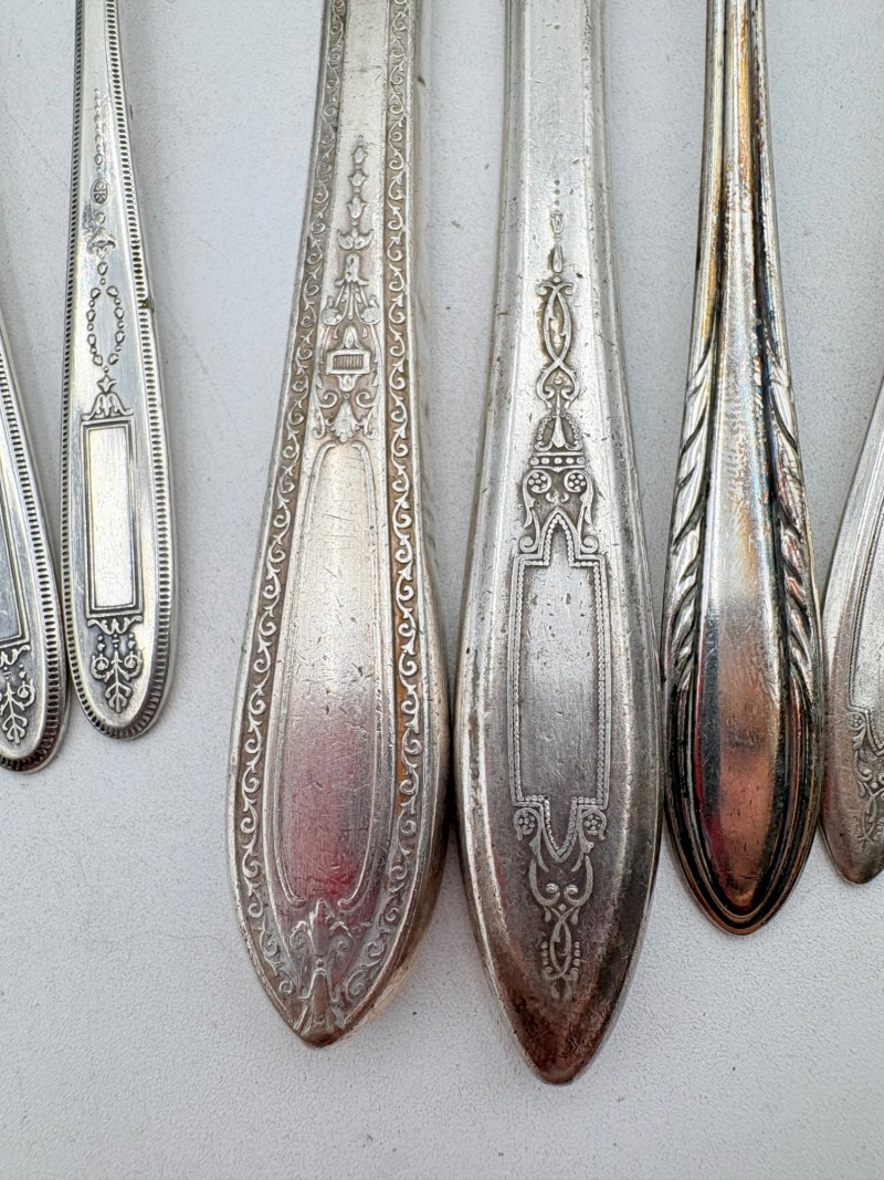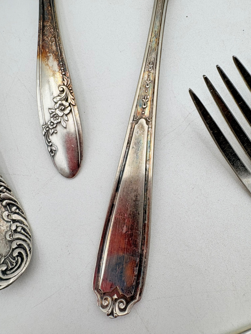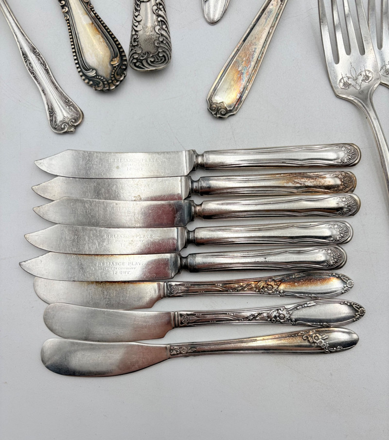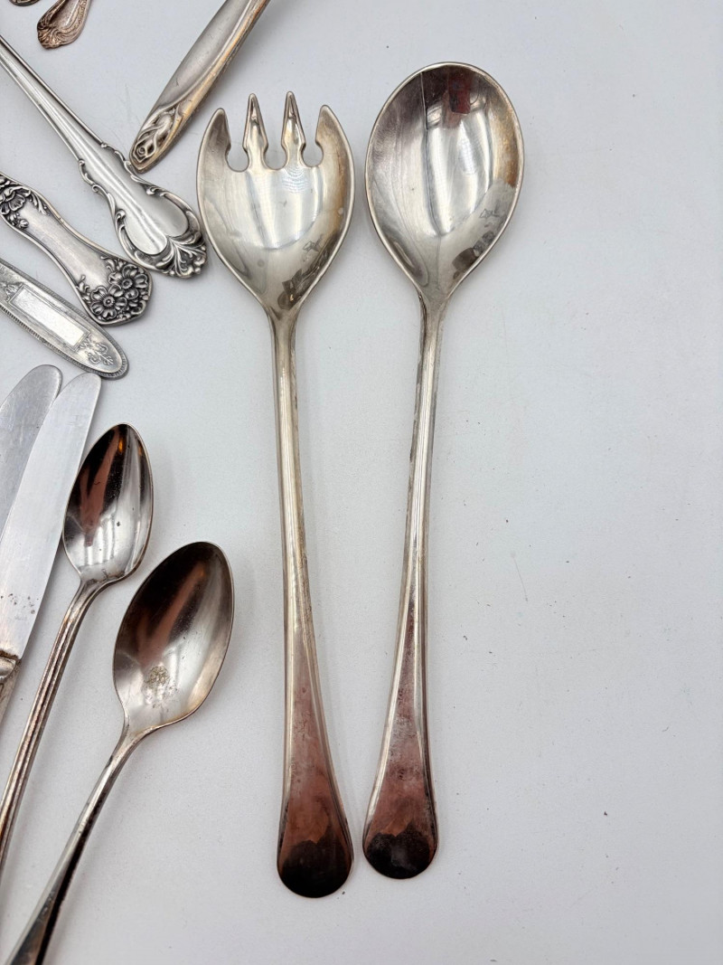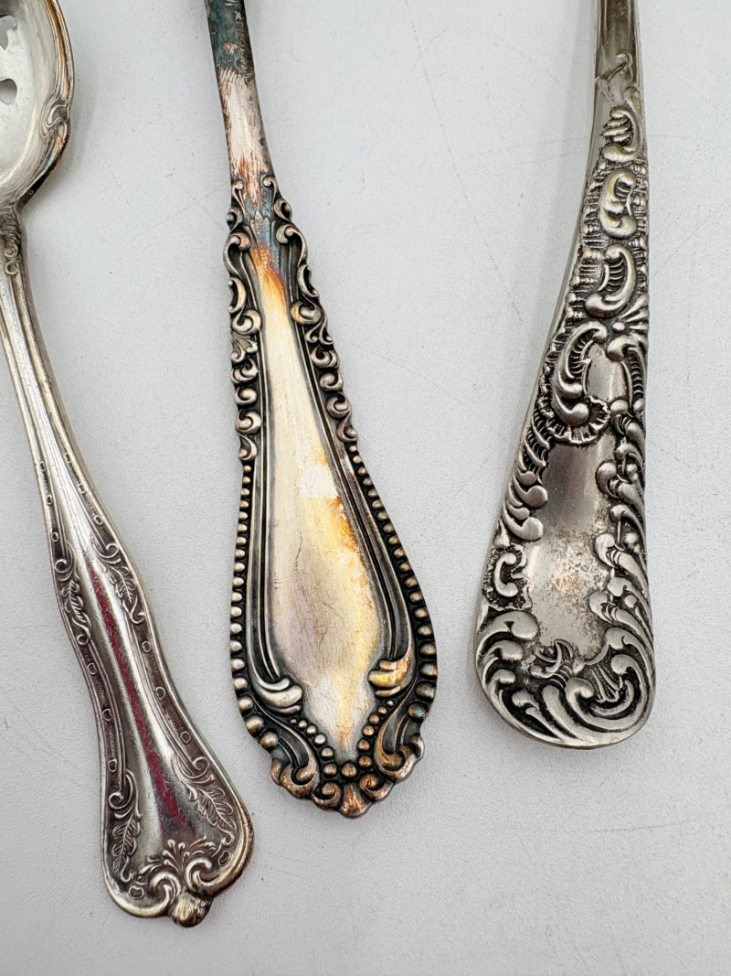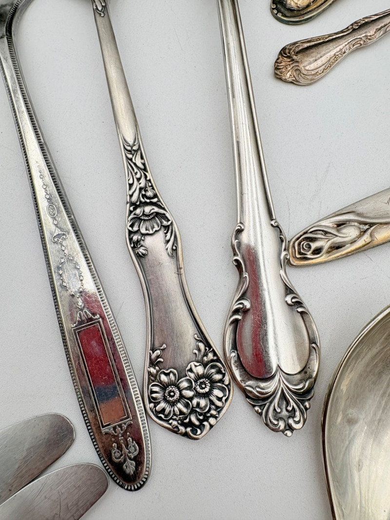 Mixed lot of pewter and siliverplate. Several items are quite old (the tray in the left back is dated 1871-1896) and there is some elegant Victorian-style design in some of the pieces - they would be great for mixed serving sets or one-off uses. All items are in need of a polishing and you may just find that some of them are worth the expense of replating. Please look closely at the photos for details. Note that on the cruet set there are a couple of chips on spouts and one of the shaker tops is missing - client put a glass stopper in it for use.