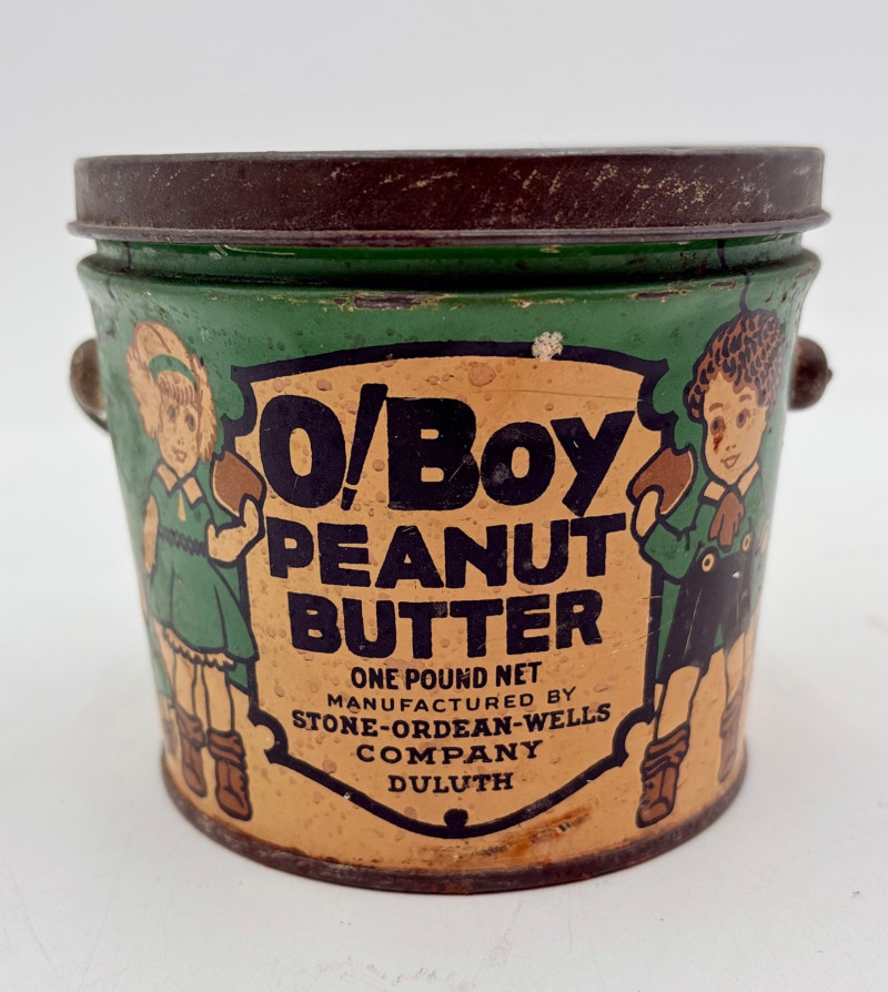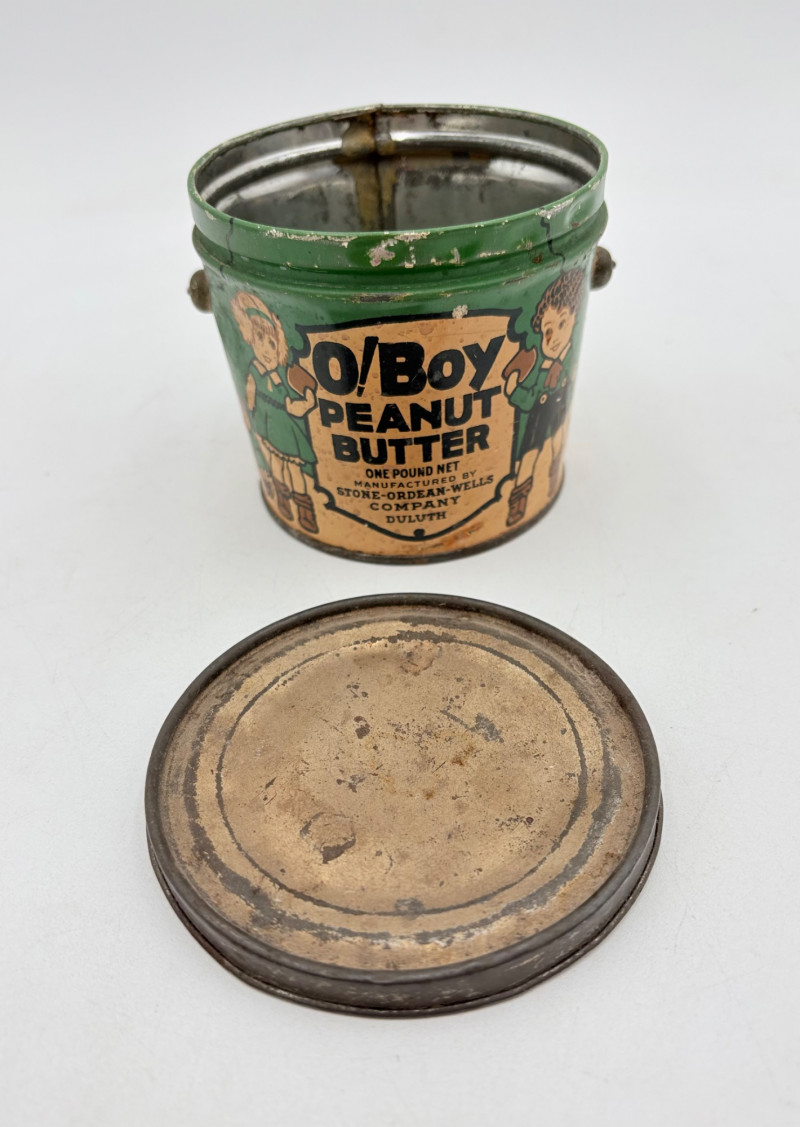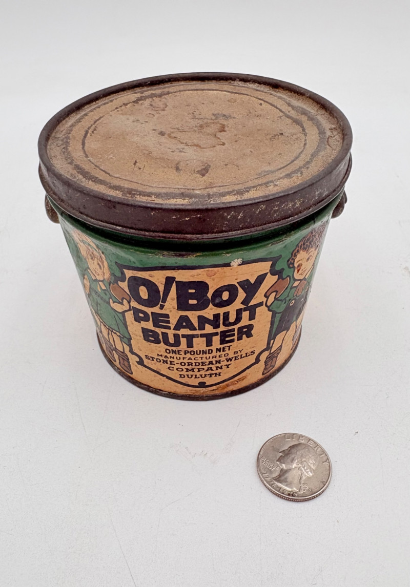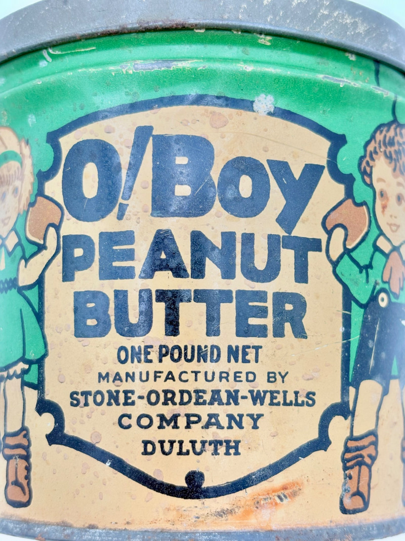Pair of metal boxes for storage - one large & one small Antique insulated milk/dairy box for home deliveries. Galvanized metal and it appears to be well-sealed (we rinsed it out and the water didn't leak out). Embossed "Property of Sanitary Cloverleaf Farms". Measures 13.5" H x 13" W x 11" D. O! Boy Peanut Butter tin can with lid from the Stone-Odean-Wells Company of Duluth, MN. We believe it is from the 1930s. Measures 3.25" H x 3.75" W. 20s/30s O!boy Peanut Butter Pail - 2 Lb Tin Litho - Stone Ordean Wells Co. Duluth MN - Old Advertising - Etsy this one is for a 2lb. size; ours is for a 1lb. size which appears to be more rare