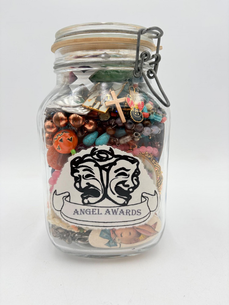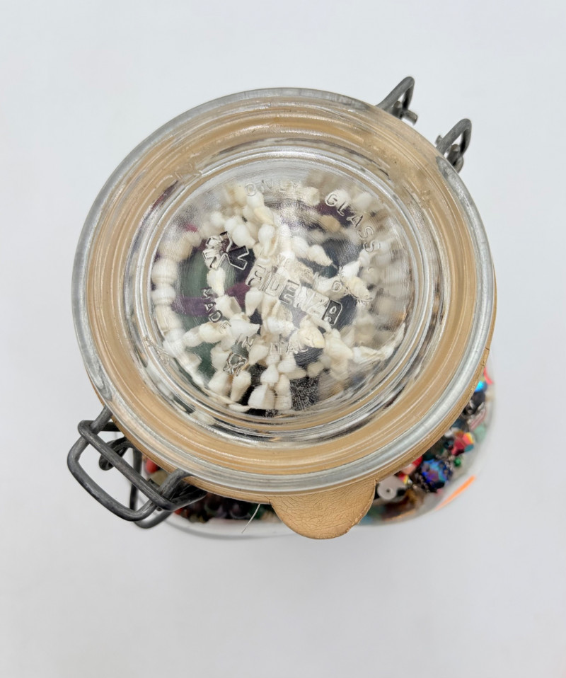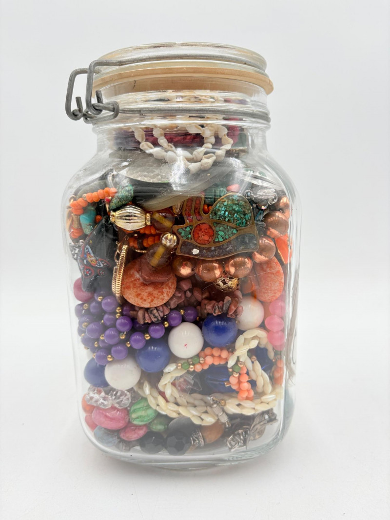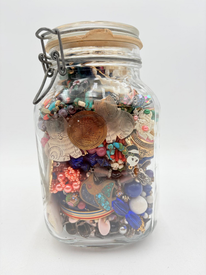 You made it almost to the end of the auction - remember that good things come to those who wait! This jar is full of misc. jewelry of many kinds - enjoy! Jar measures 9" H.