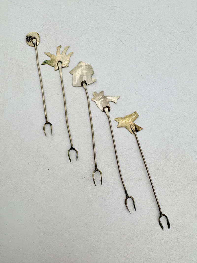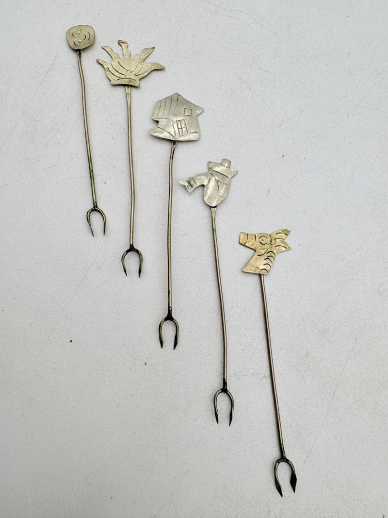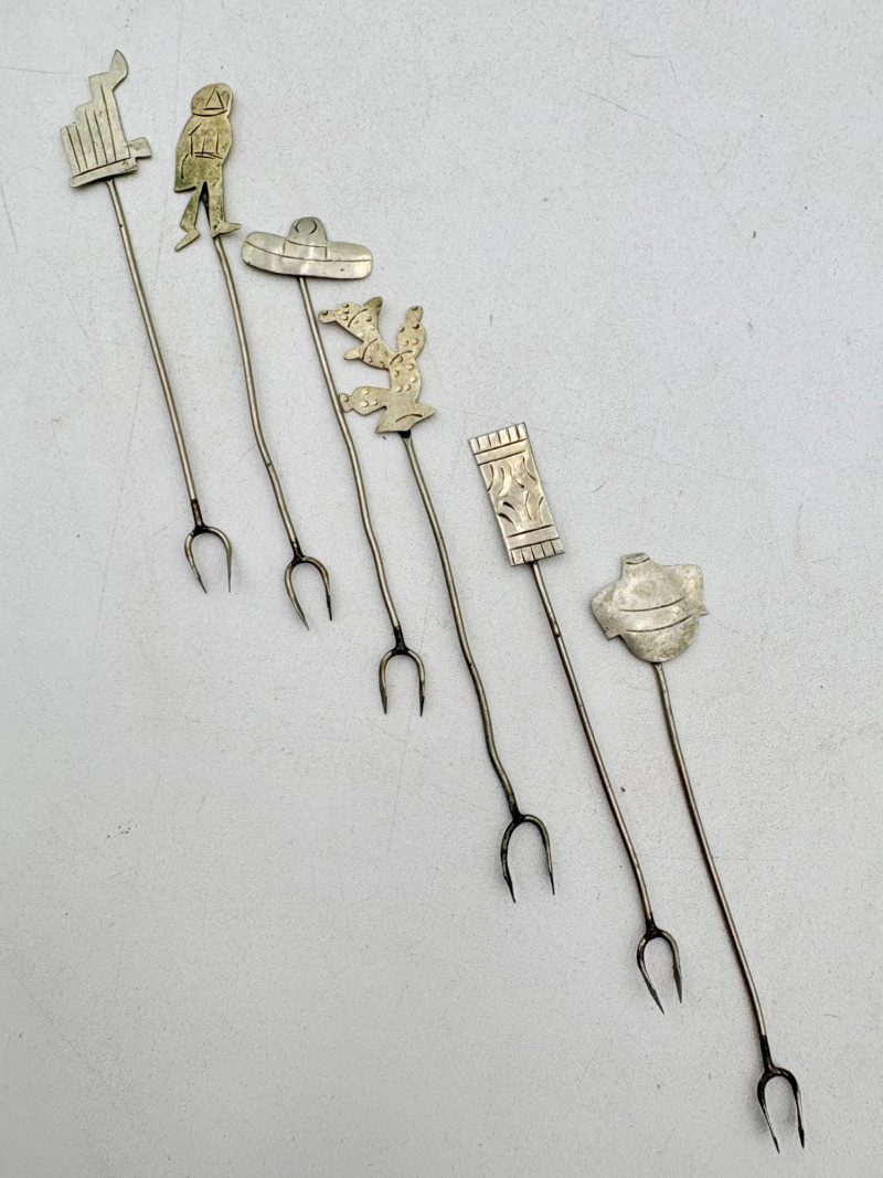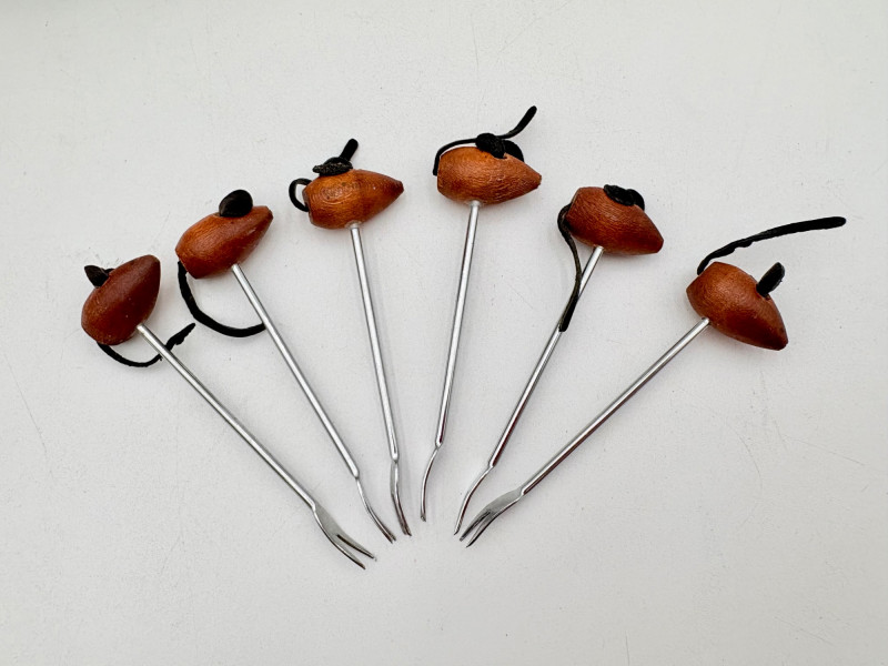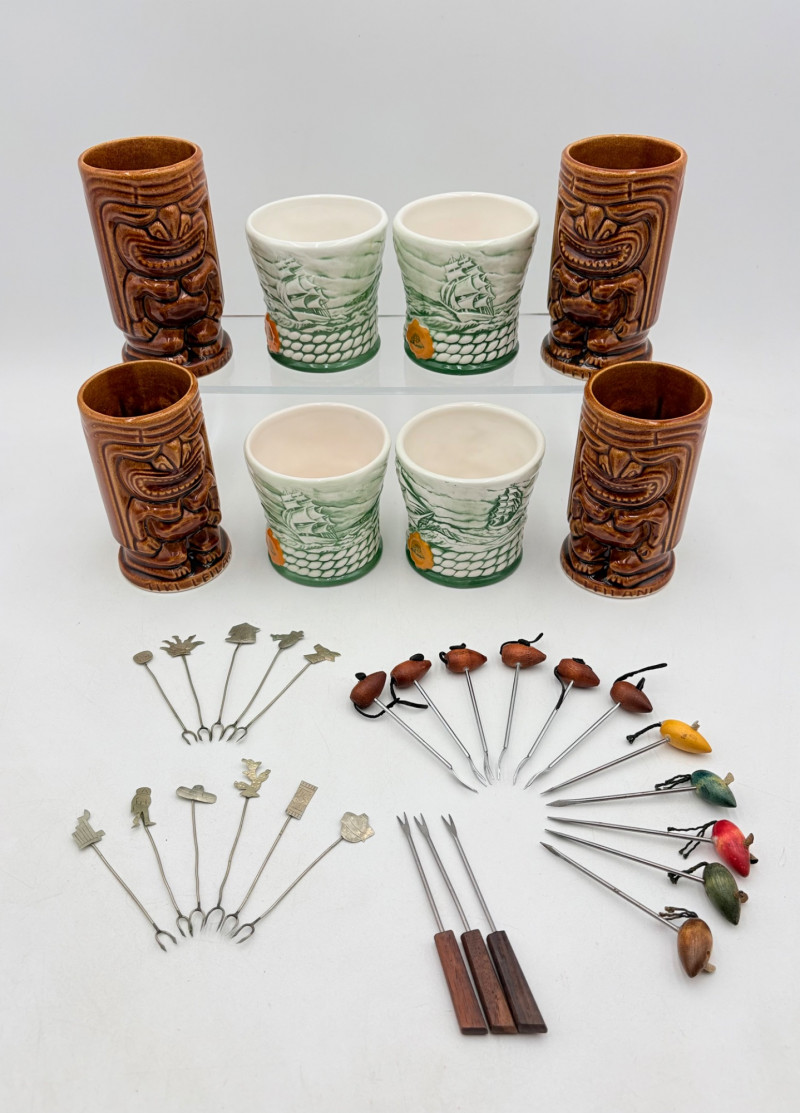 Get ready for a cocktail party with these vintage & semi-vintage cups and cheese tray supplies. 4 Cutty Sark ceramic cups in green and white* (special edition from 1998) 4 ceramic tiki cups Lots of cheese forks - we think the hand-made ones may actually be real silver, but they are not marked. Note that there is an ear missing from one mouse - see last photo. Cutty
