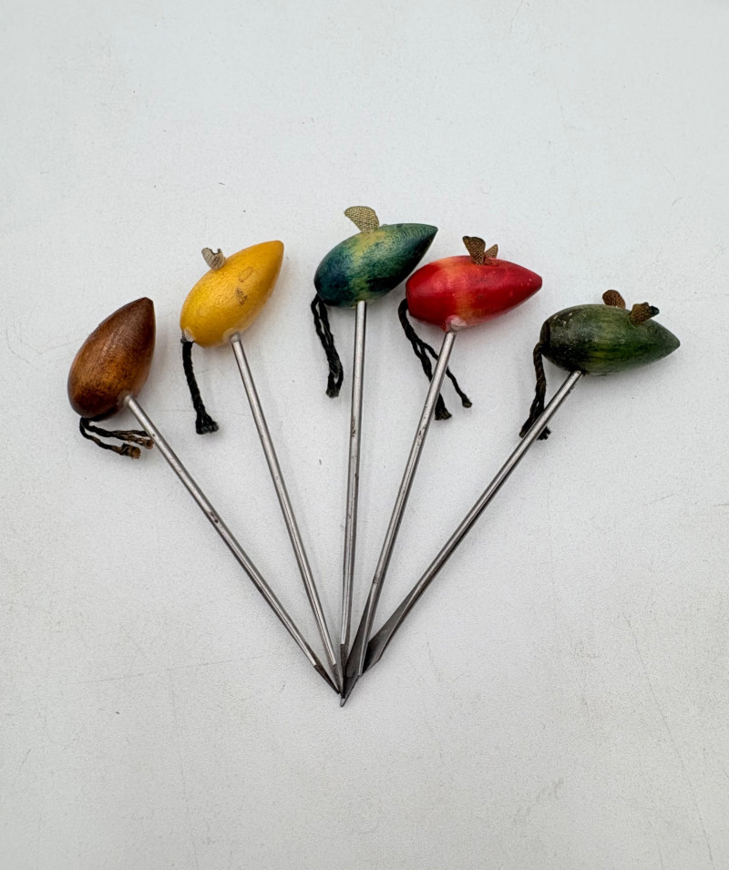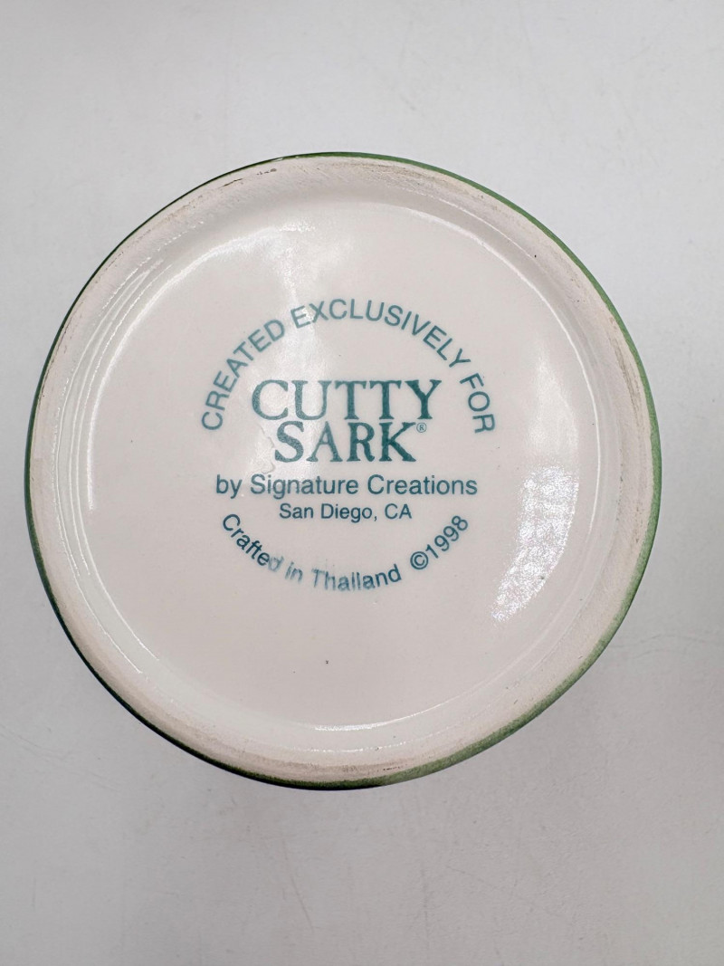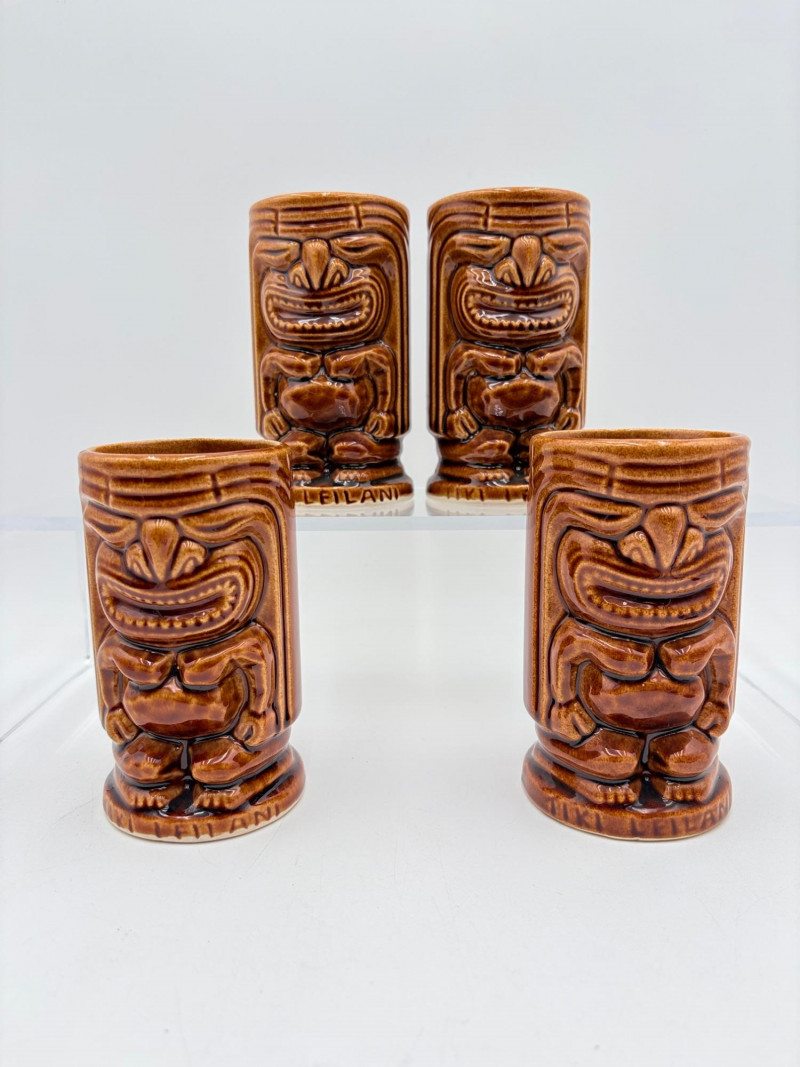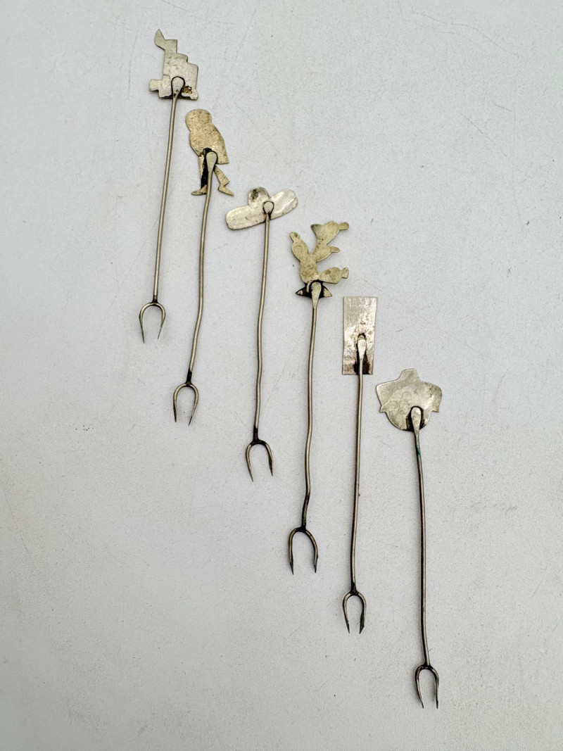 Get ready for a cocktail party with these vintage & semi-vintage cups and cheese tray supplies. 4 Cutty Sark ceramic cups in green and white* (special edition from 1998) 4 ceramic tiki cups Lots of cheese forks - we think the hand-made ones may actually be real silver, but they are not marked. Note that there is an ear missing from one mouse - see last photo. Cutty