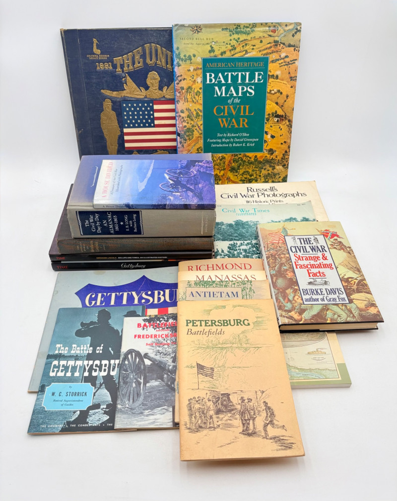Wide variety of materials on the Civil War with special focus on specific battles - many small booklets that appear to have been purchased at the locations of the battles. Also includes an interesting book/record album combination from Columbia Records - the binding on the book is broken, but we included it as a novelty (last 3 photos). Please see photos for titles.