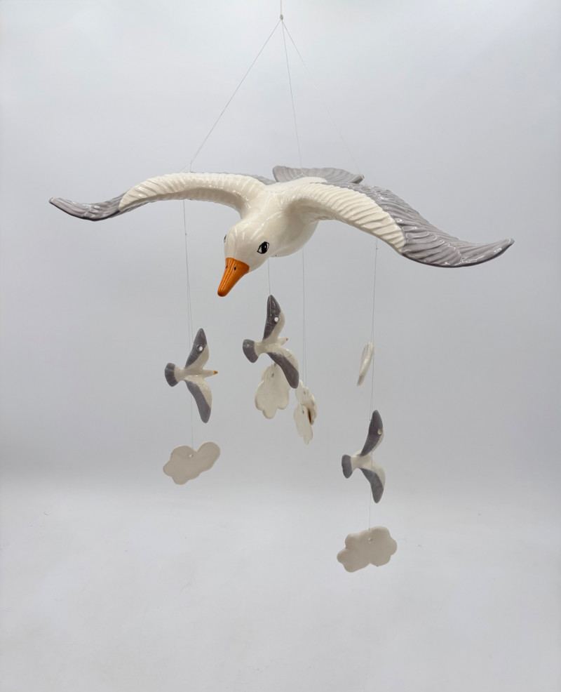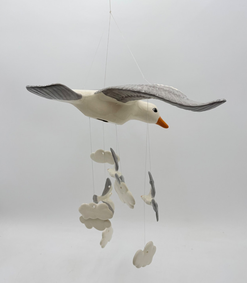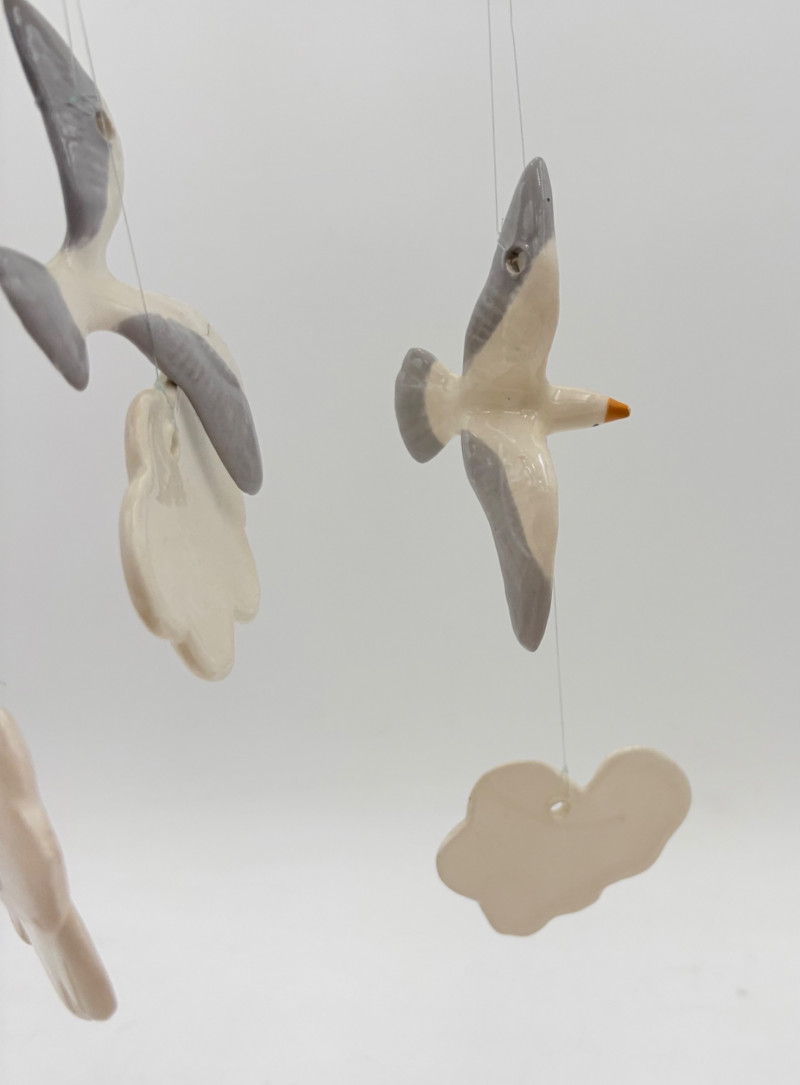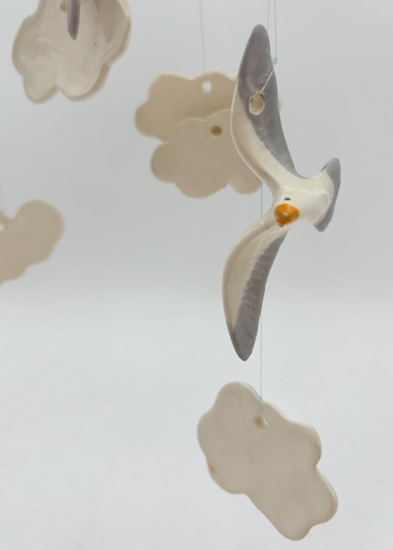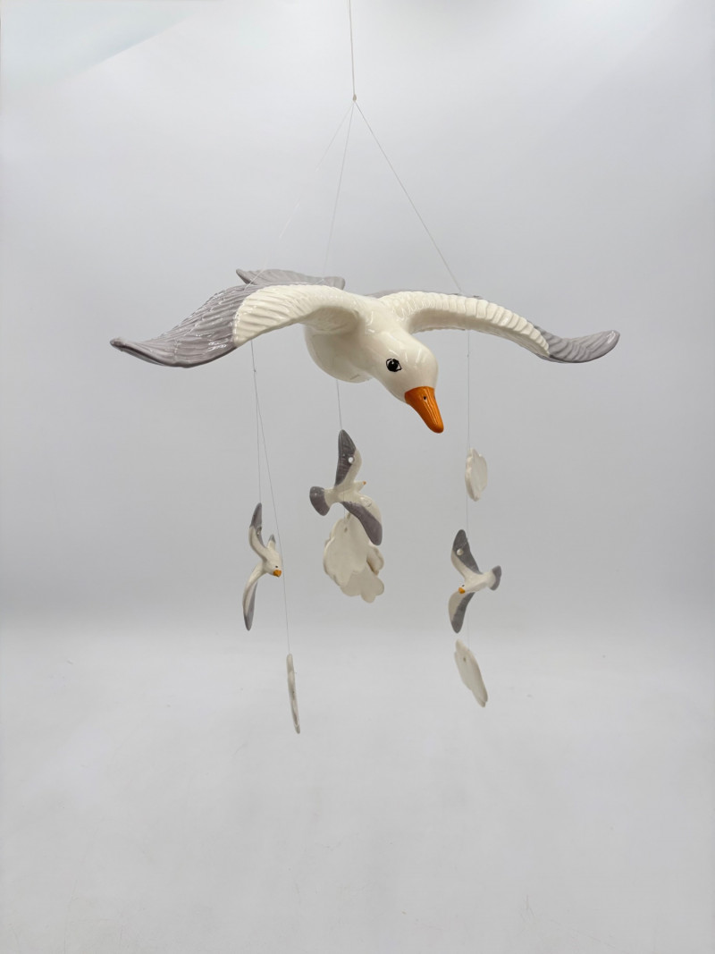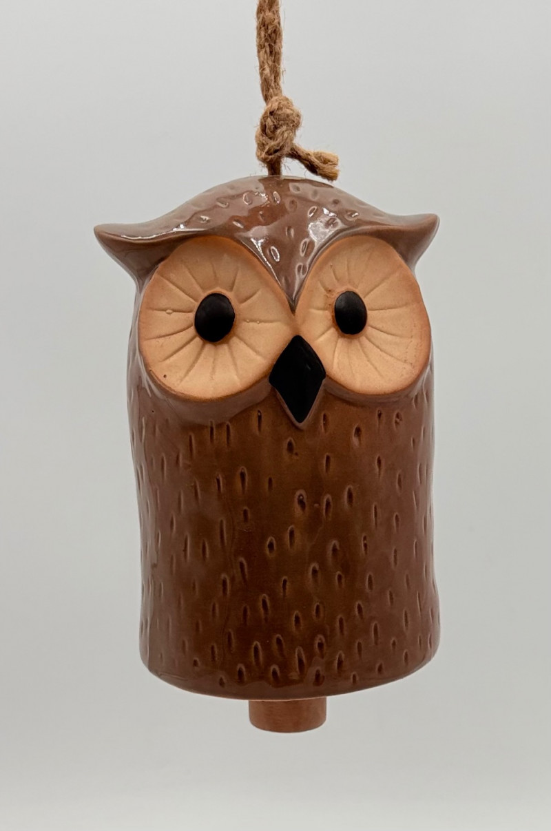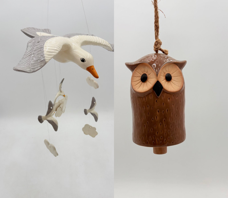 Two vintage windchime sets: Large white & grey ceramic seagull with smaller gulls and clouds that tinkle together. Measures 15" wingtip to wingtip and 11" from beak to tail. Brown ceramic owl windchime with a single large ringer - sound is rich and resonates well. The owl's body measures approx. 7" H.