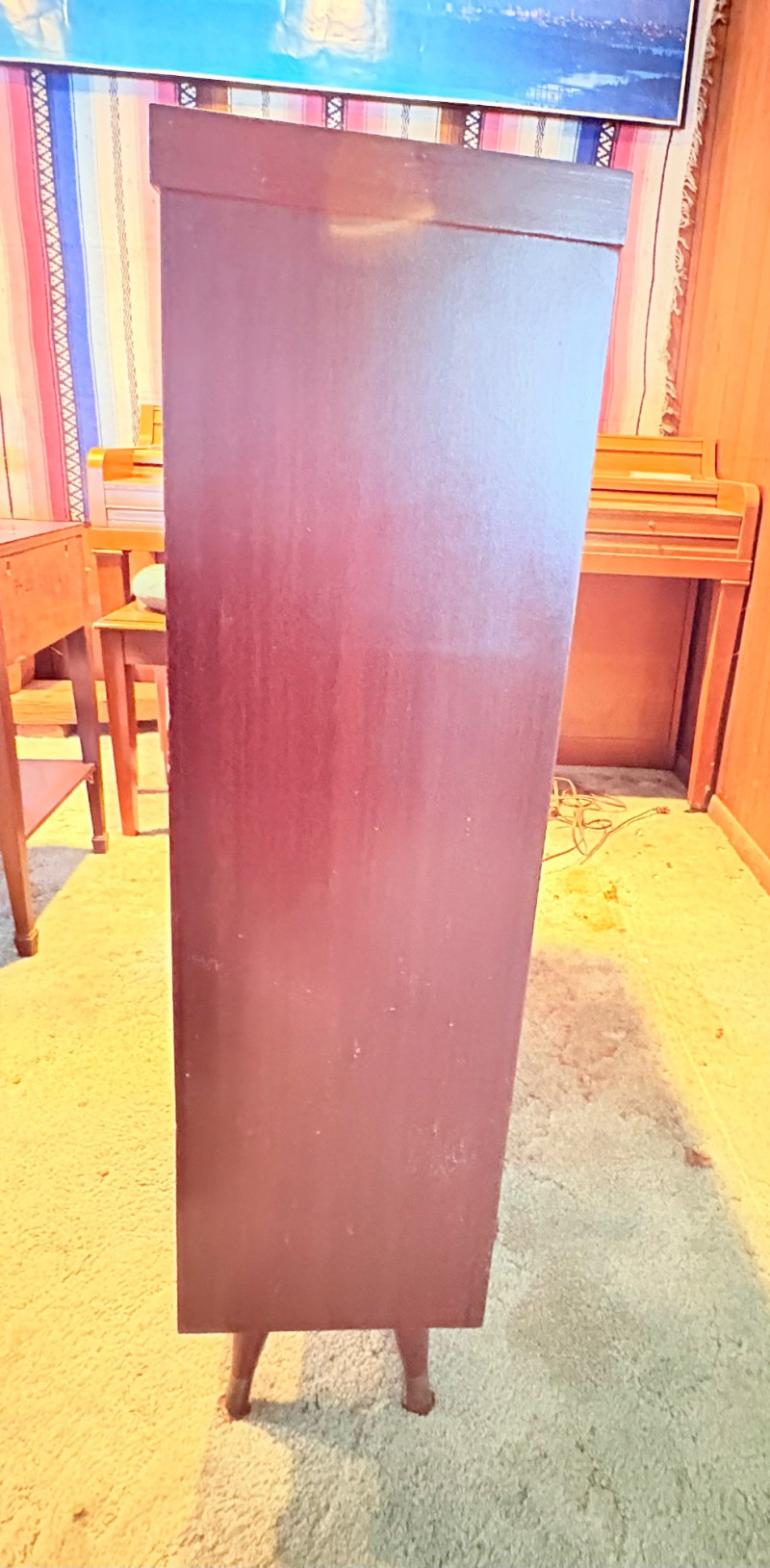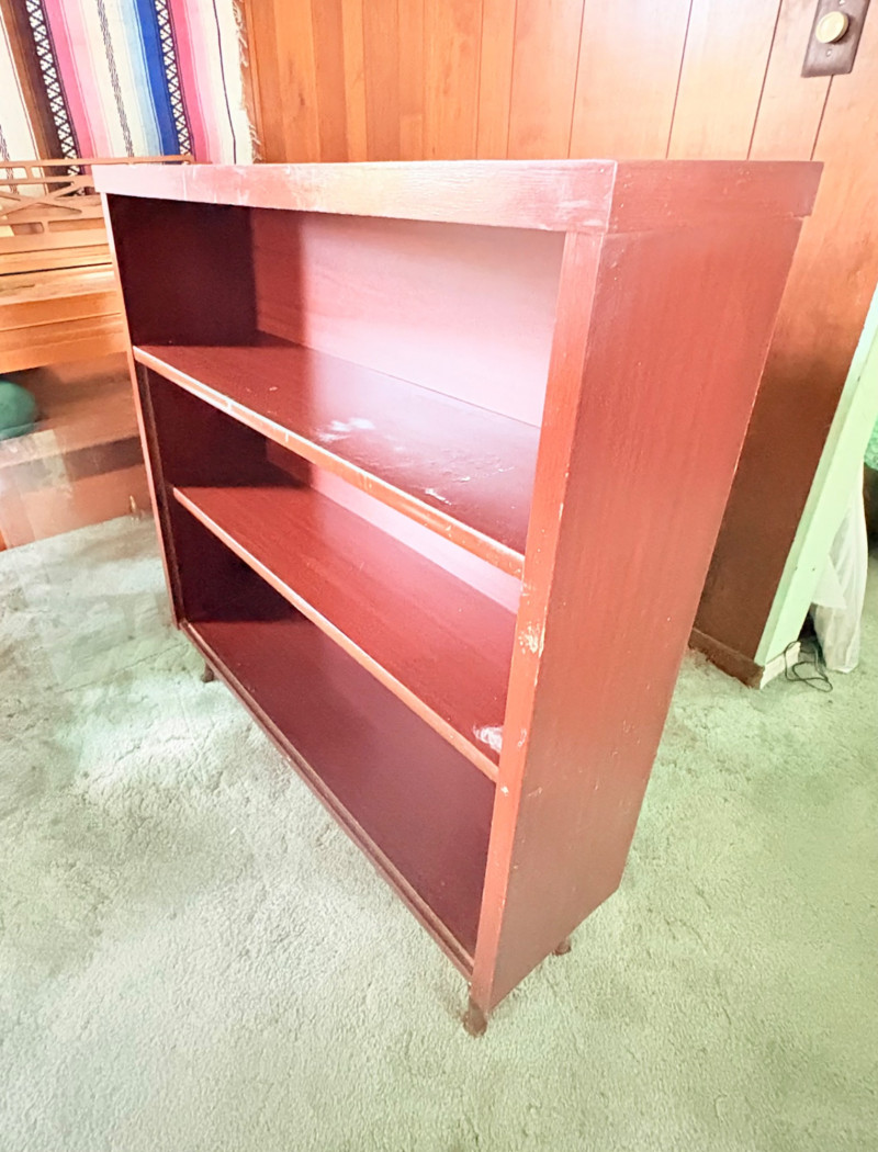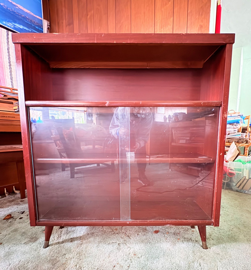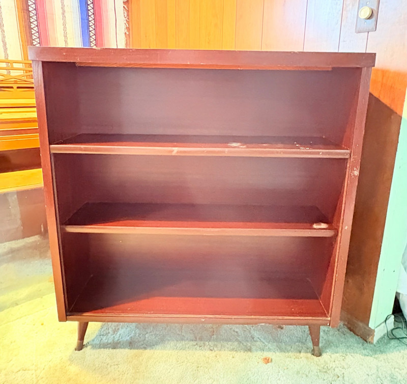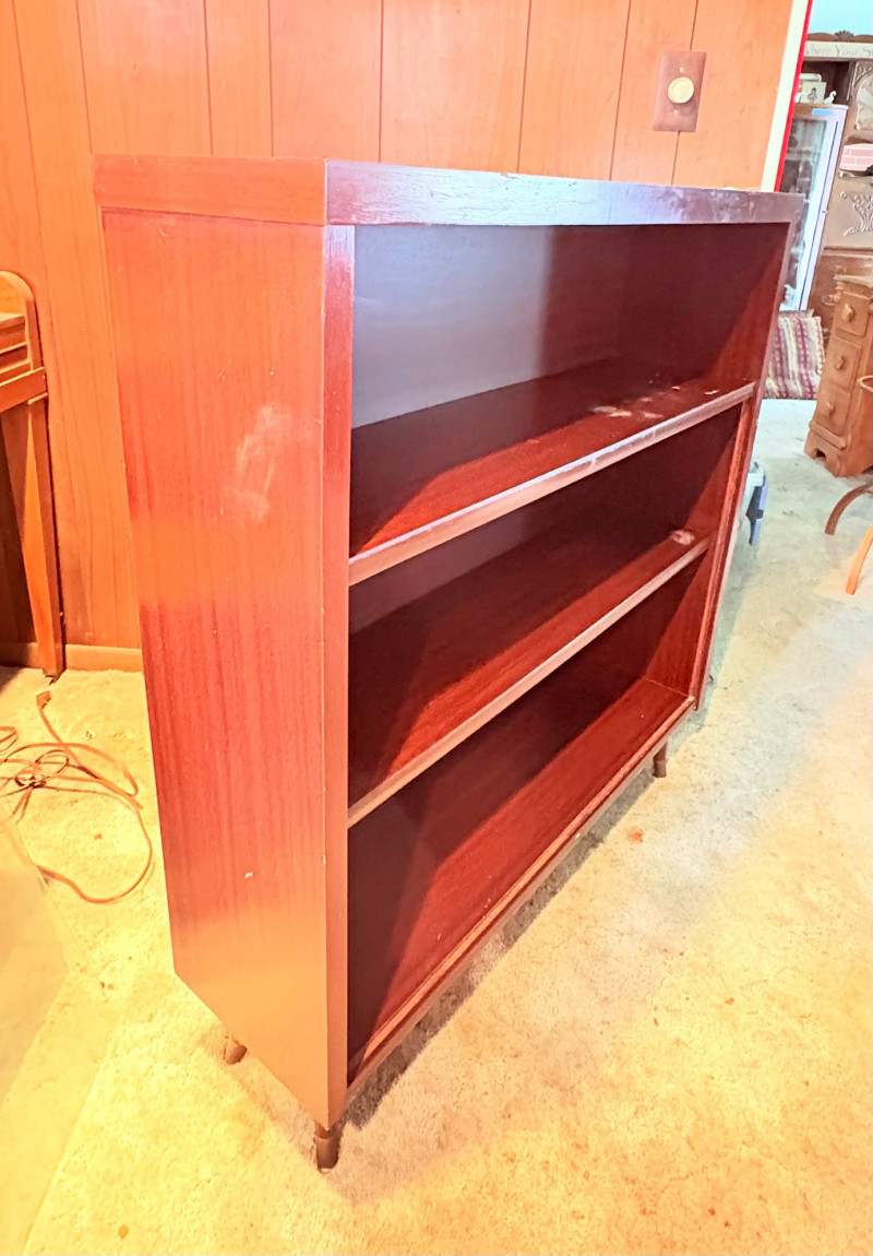 3-shelf bookcase in dark brown tone with a reddish cast. Clean lines and splayed short legs with brass feet. Glass slider panels run across two of the three shelves and the bookshelves are fixed. Vintage pressboard back. Staining on shelves and wear in numerous spots. This piece needs a lot of TLC but could be a looker - we would refinish it/paint it and put some pull tabs on the glass. Measures 39.5" H x 36.25" WX 10" D.