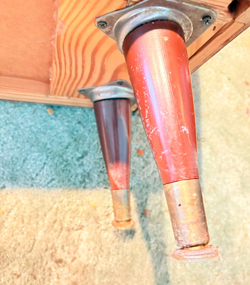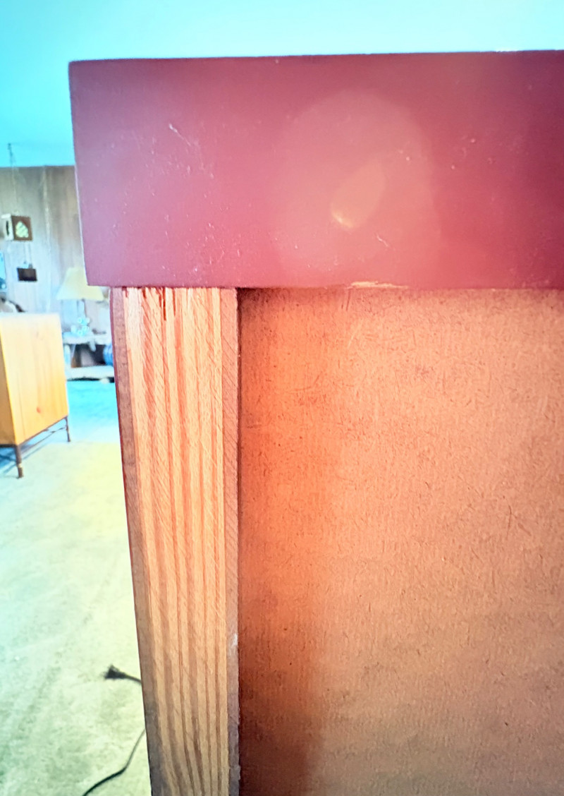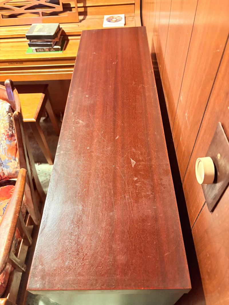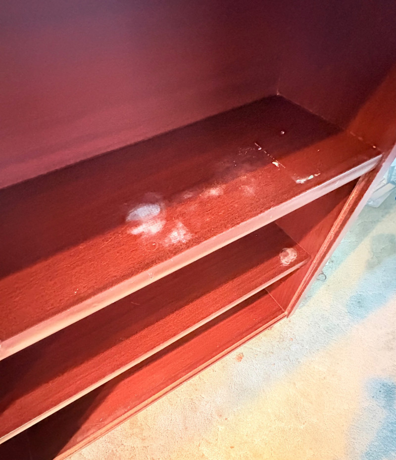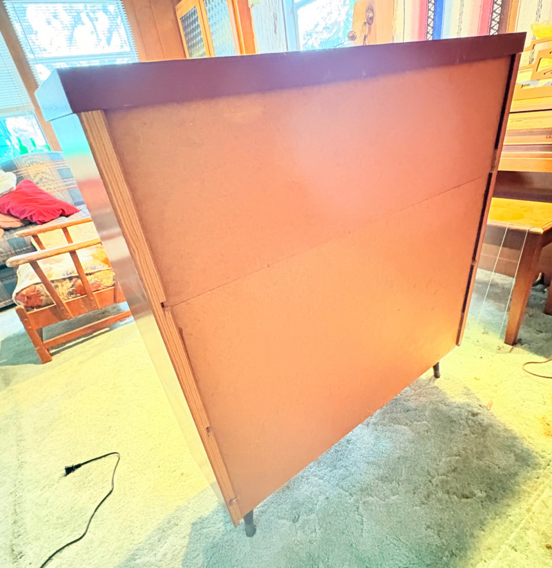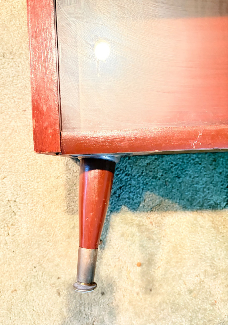 3-shelf bookcase in dark brown tone with a reddish cast. Clean lines and splayed short legs with brass feet. Glass slider panels run across two of the three shelves and the bookshelves are fixed. Vintage pressboard back. Staining on shelves and wear in numerous spots. This piece needs a lot of TLC but could be a looker - we would refinish it/paint it and put some pull tabs on the glass. Measures 39.5" H x 36.25" WX 10" D.