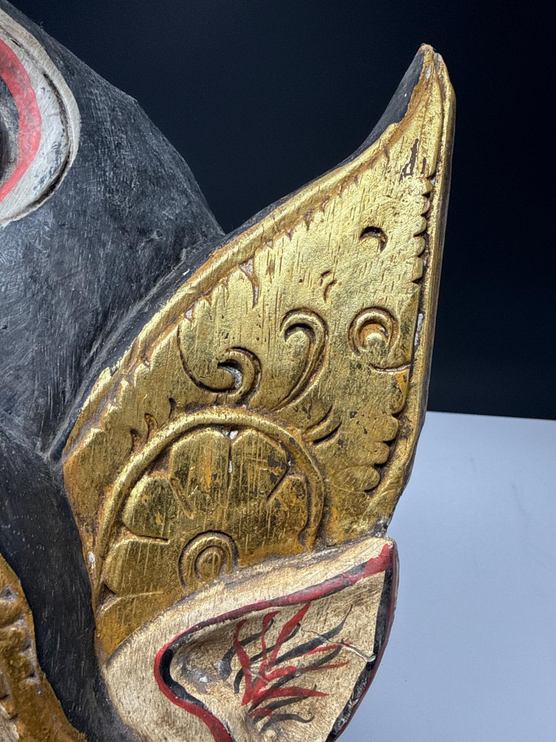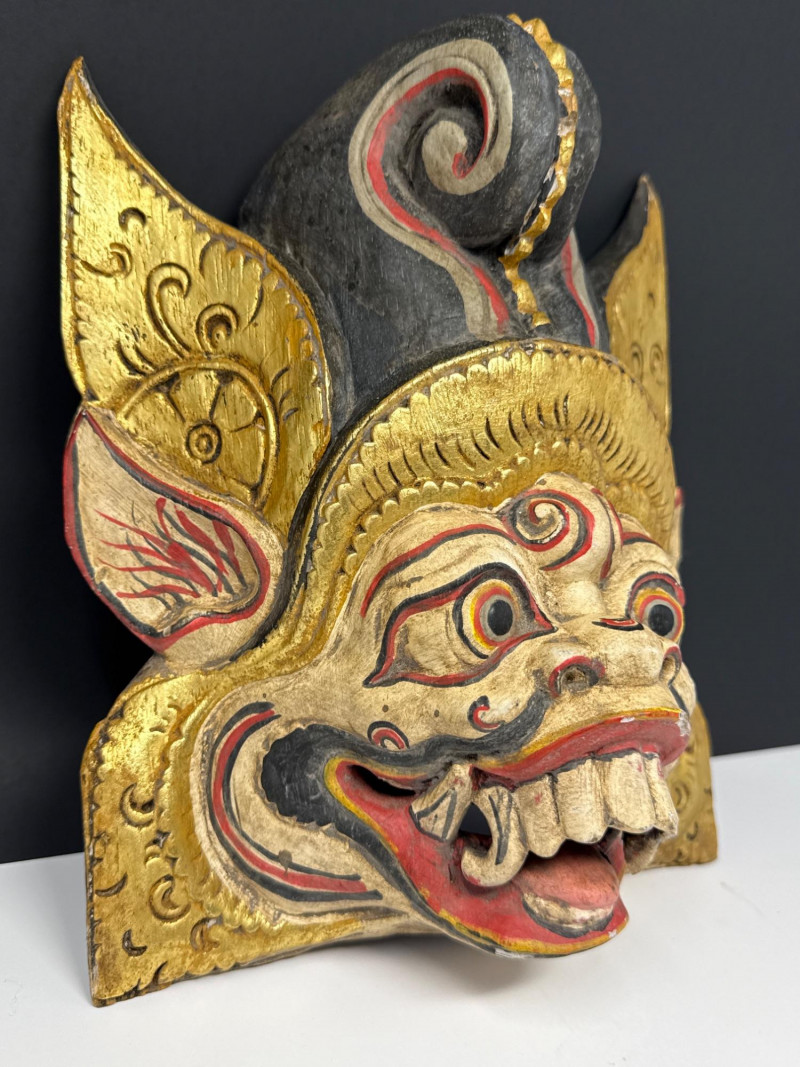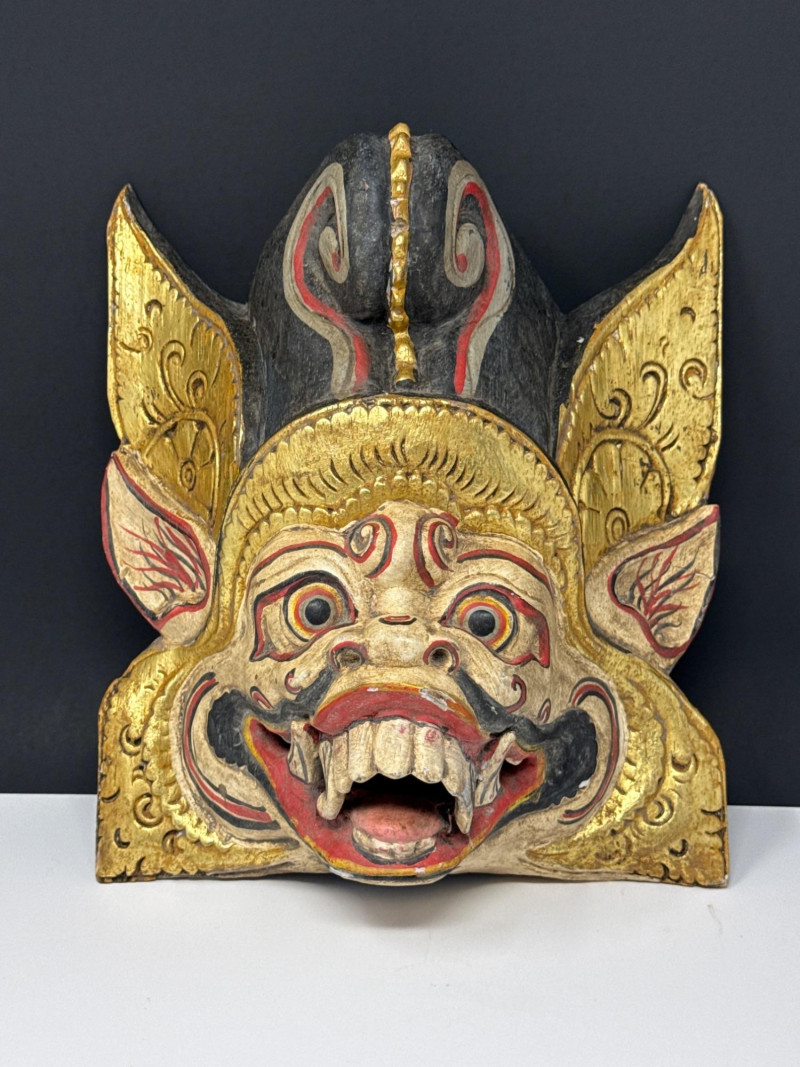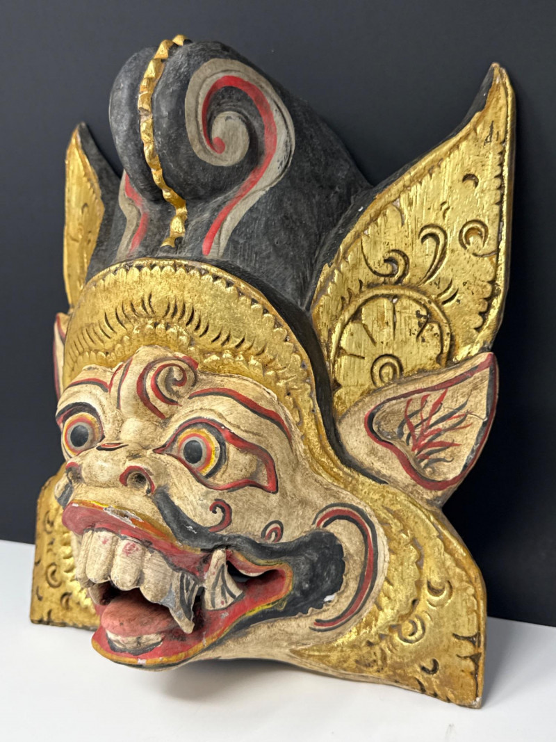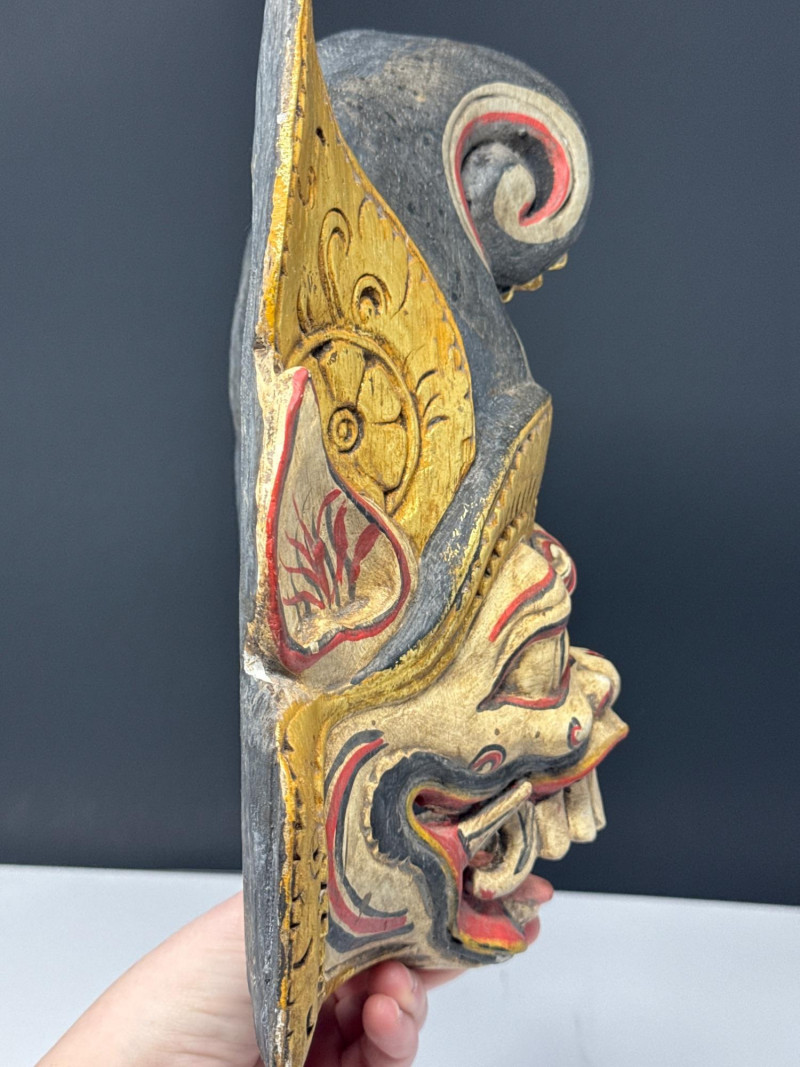 Folk Art Balinese Topeng Wooden Dance Mask This Balinese Topeng dance mask is a striking example of Indonesian folk art, hand-carved from wood with intricate detailing. It depicts a character with traditional "Barong-style" features, characterized by bulging eyes, prominent tusks, and an open, expressive mouth. The mask is adorned with vibrant gold leaf accents and elaborate floral carvings on the crown and ears, while the weathered patina on the back suggests it may have been used in traditional performances. Please note photos for more details on condition.