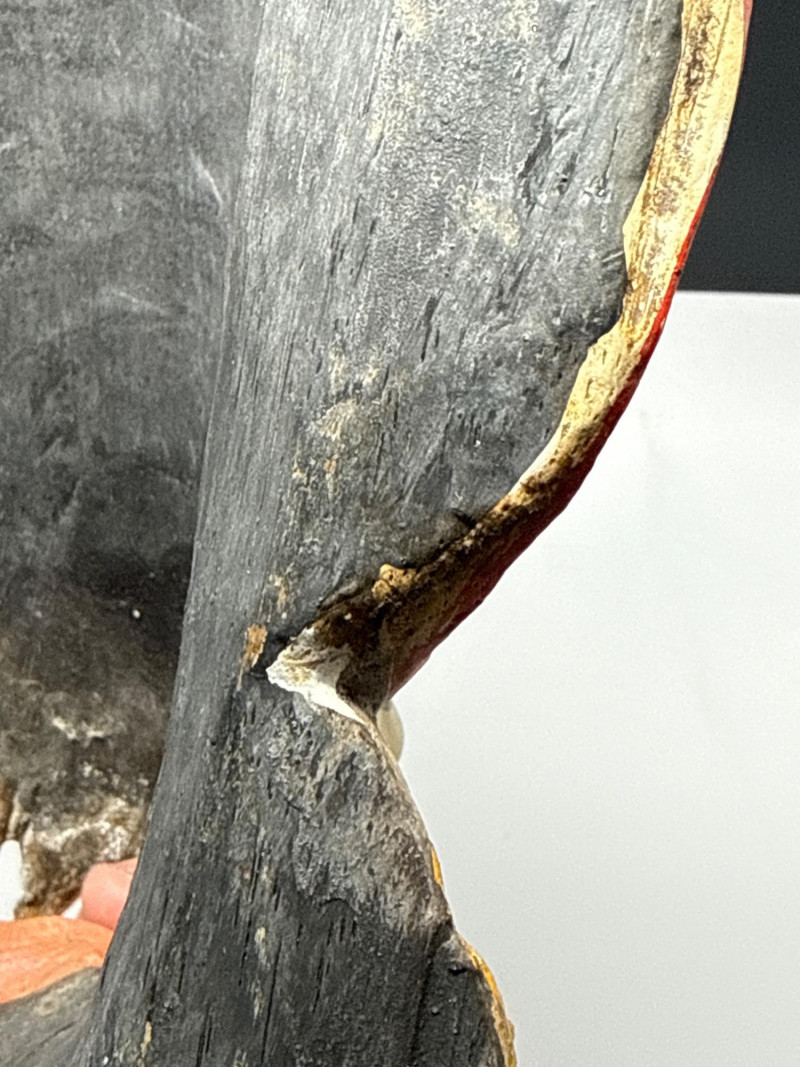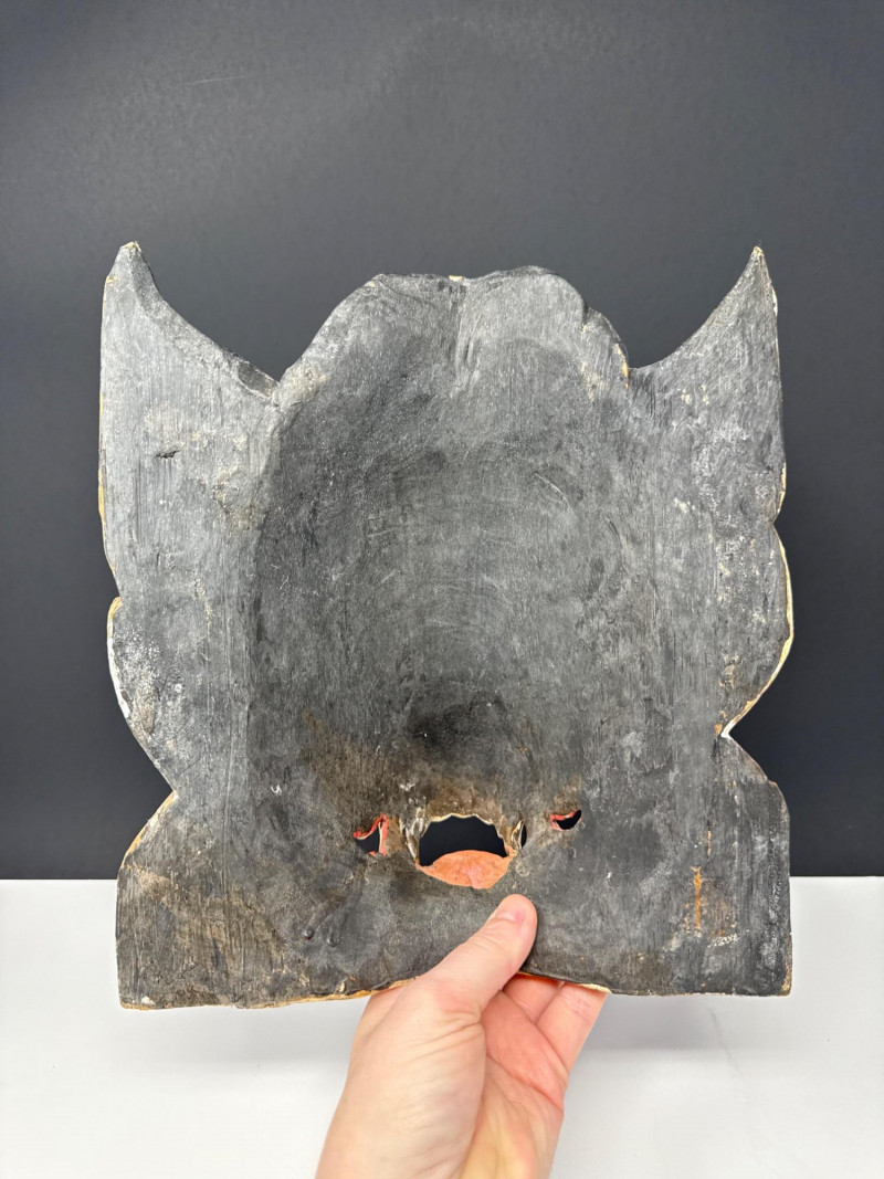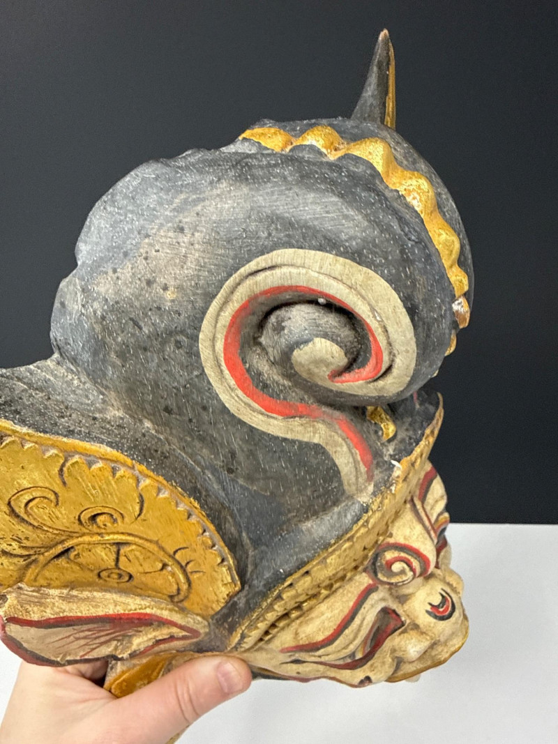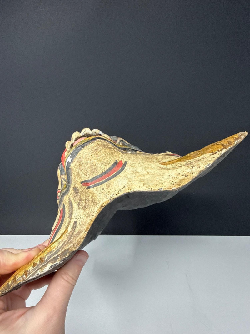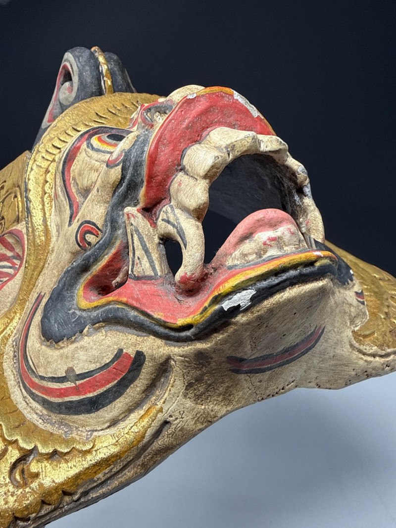 Folk Art Balinese Topeng Wooden Dance Mask This Balinese Topeng dance mask is a striking example of Indonesian folk art, hand-carved from wood with intricate detailing. It depicts a character with traditional "Barong-style" features, characterized by bulging eyes, prominent tusks, and an open, expressive mouth. The mask is adorned with vibrant gold leaf accents and elaborate floral carvings on the crown and ears, while the weathered patina on the back suggests it may have been used in traditional performances. Please note photos for more details on condition.