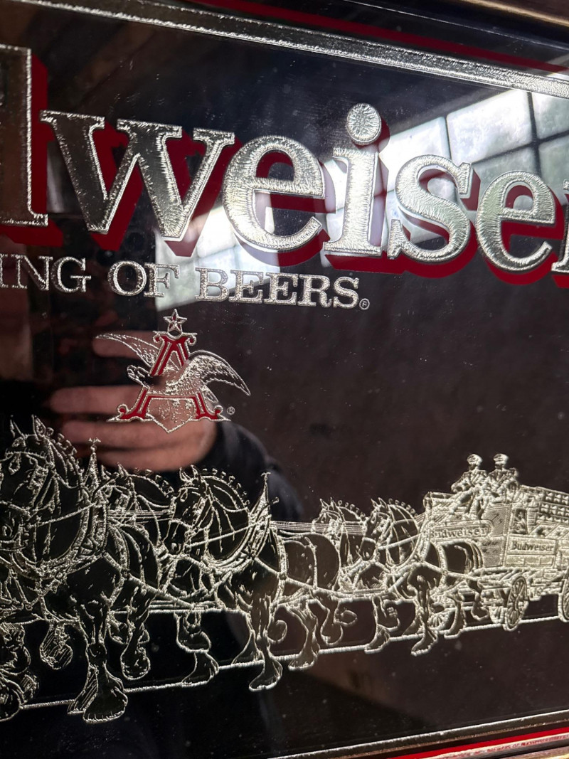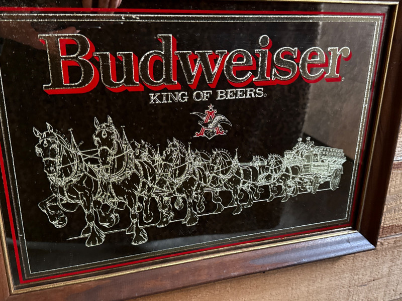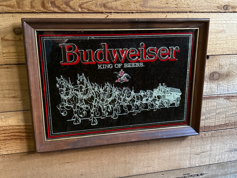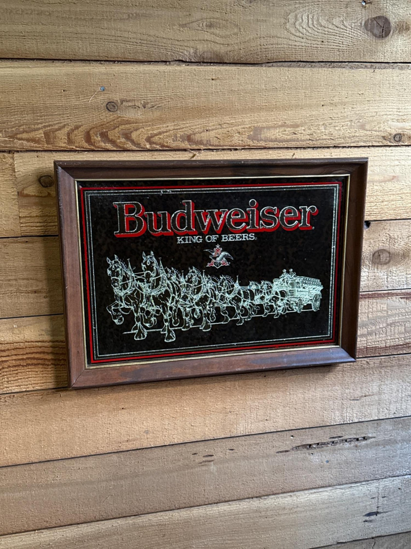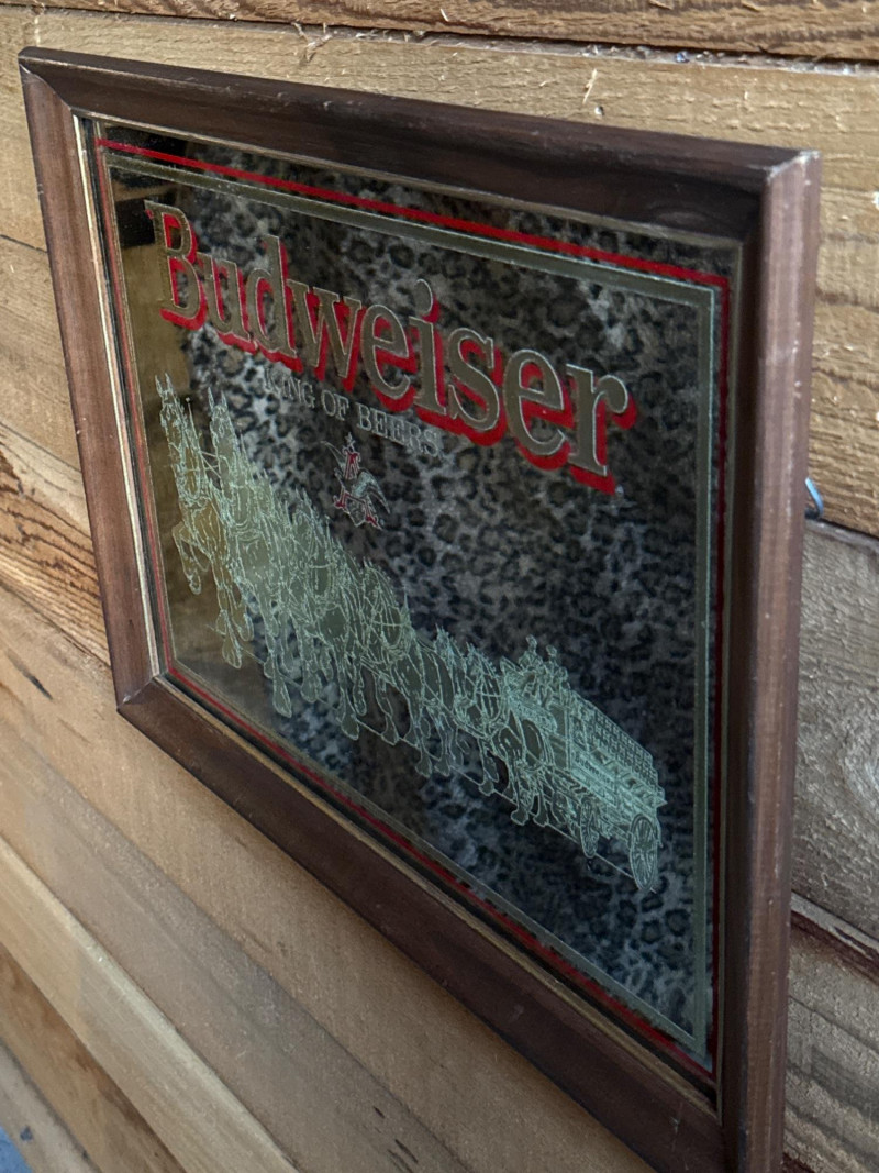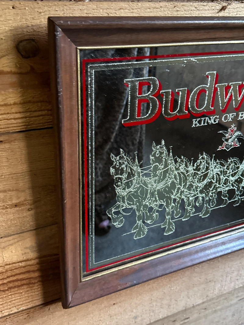 1980's Vintage Budweiser Bar Mirror in Wooden Frame This vintage Budweiser bar mirror is a classic piece of breweriana featuring the iconic World Famous Budweiser Clydesdales 8-horse hitch and wagon. The artwork is preserved under mirrored glass and showcases the "King of Beers" branding with vibrant red and gold accents. Good, vintage condition.
