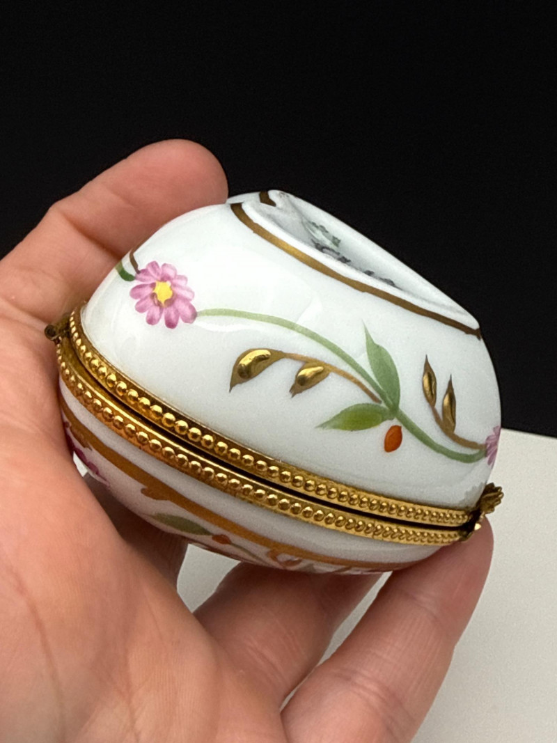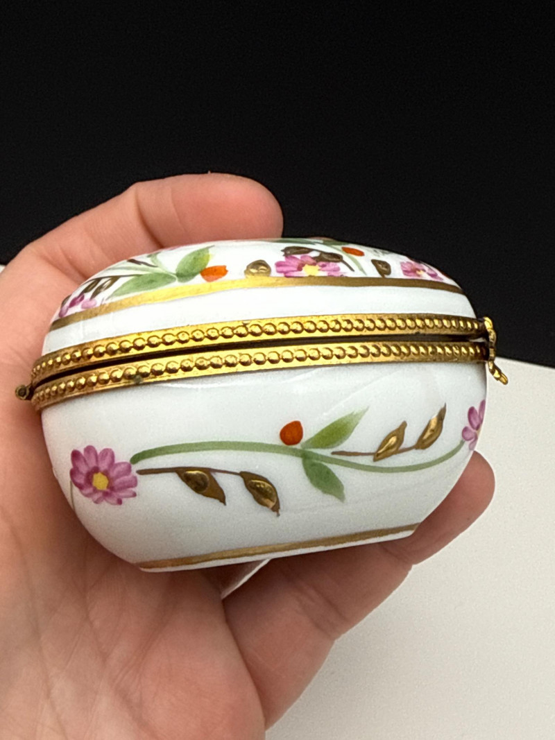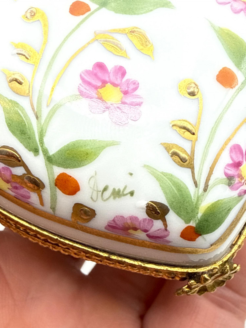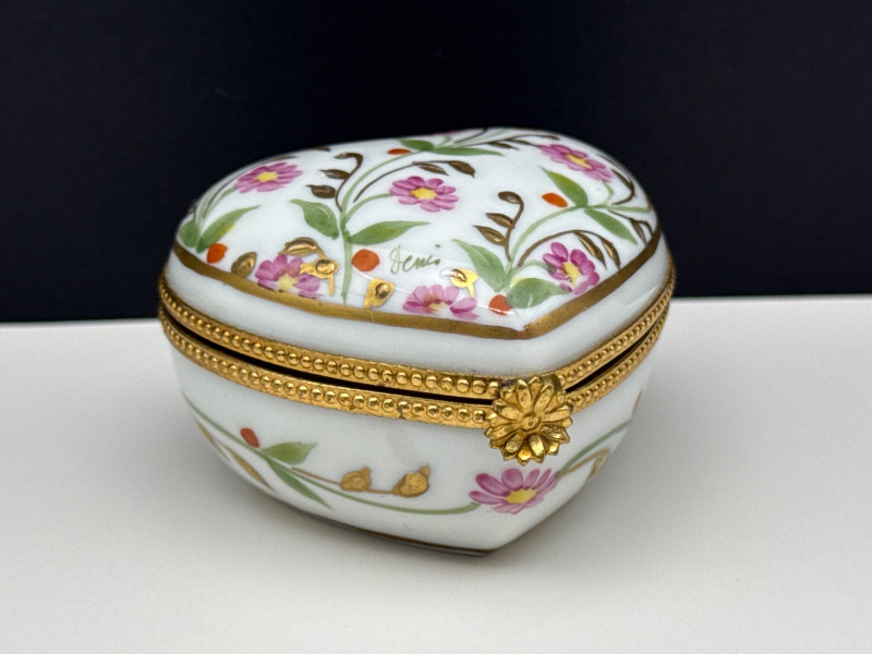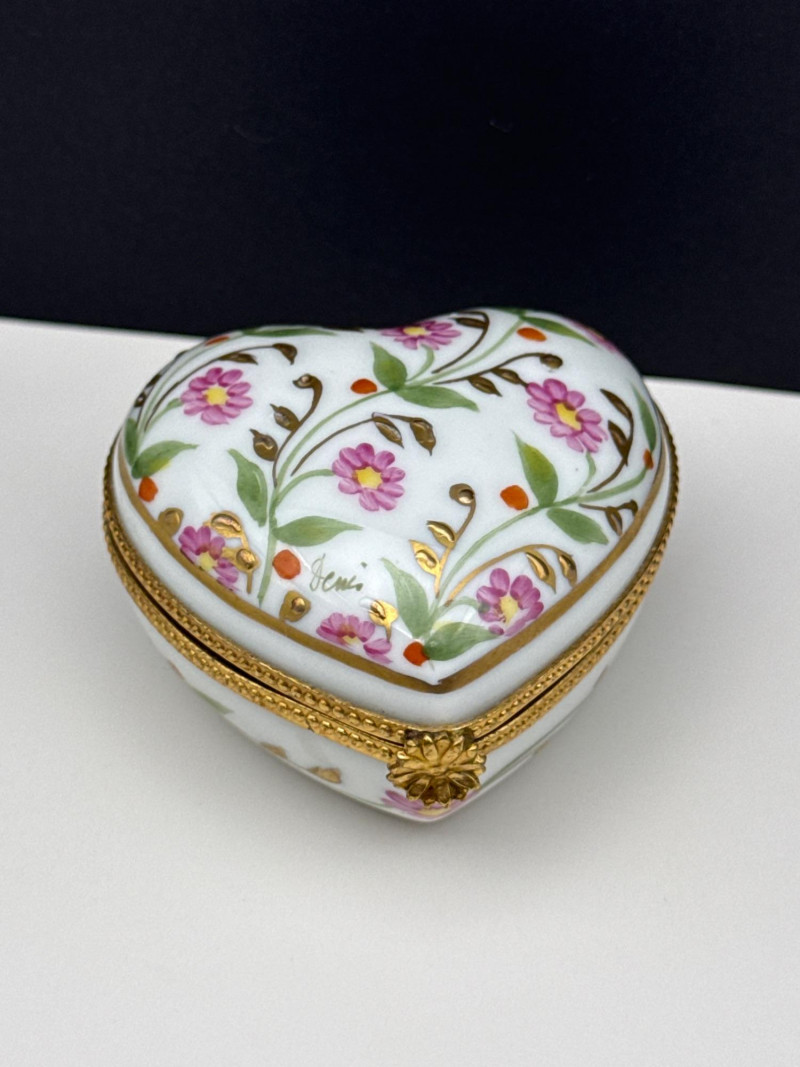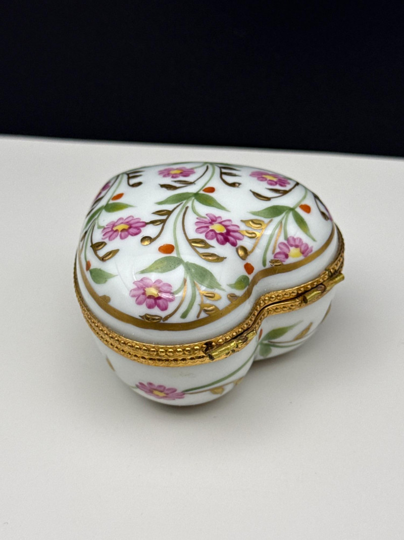 Limoges France Painted Porcelain Heart Trinket Box This Limoges France heart-shaped trinket box is a delicate example of fine French porcelain, meticulously hand-painted with vibrant floral patterns. Crafted from pure white hard-paste porcelain in the historic Limoges region, this piece features a hinged lid secured with a decorative gold-toned metal clasp, a hallmark of traditional "tabatière" (snuff box) design. Good vintage condition