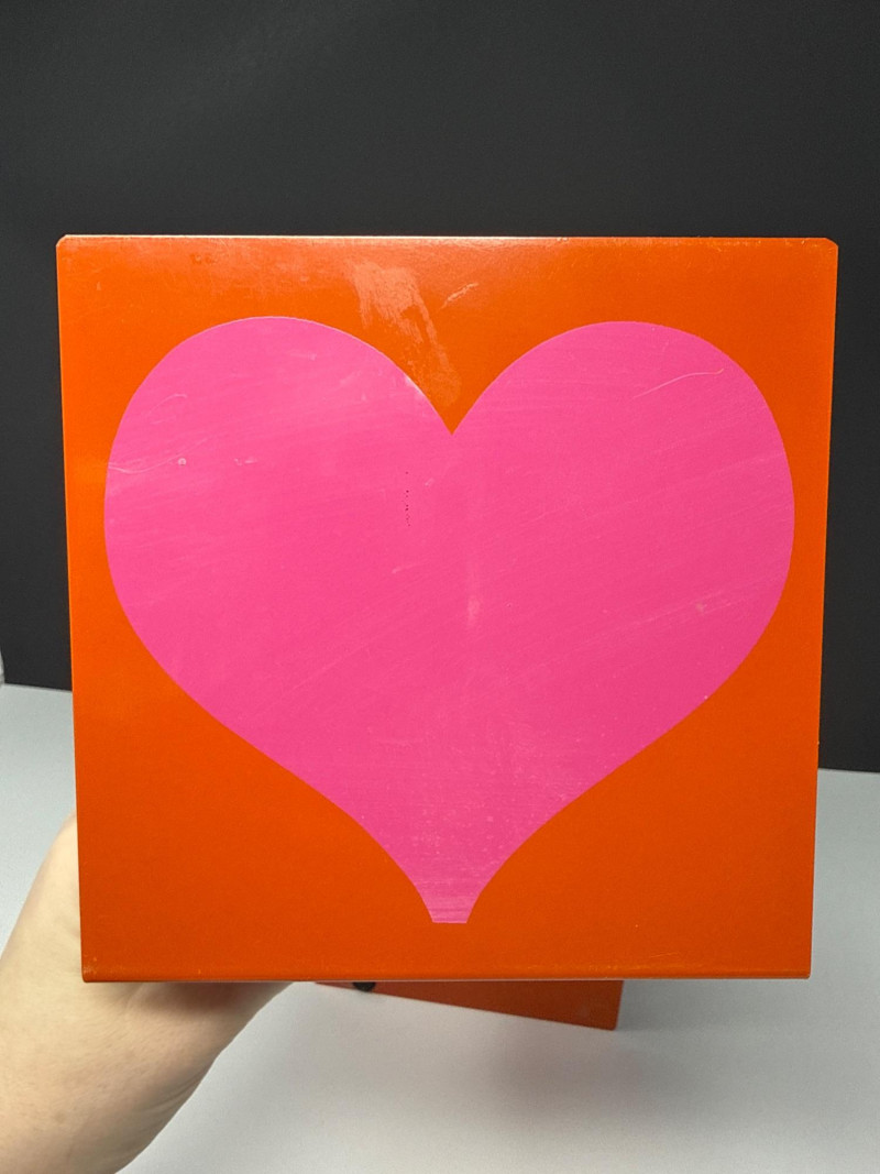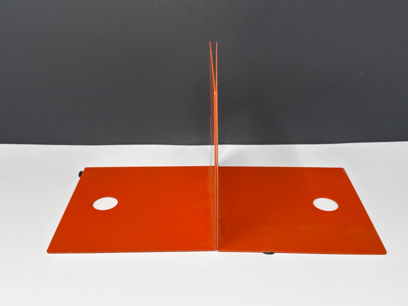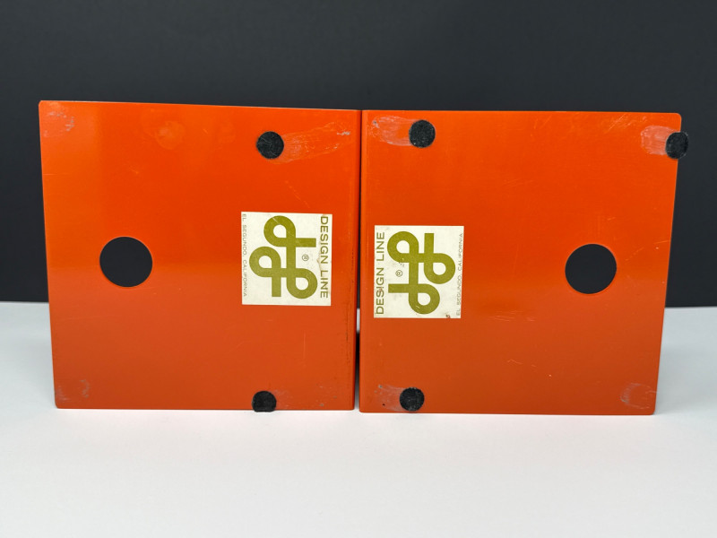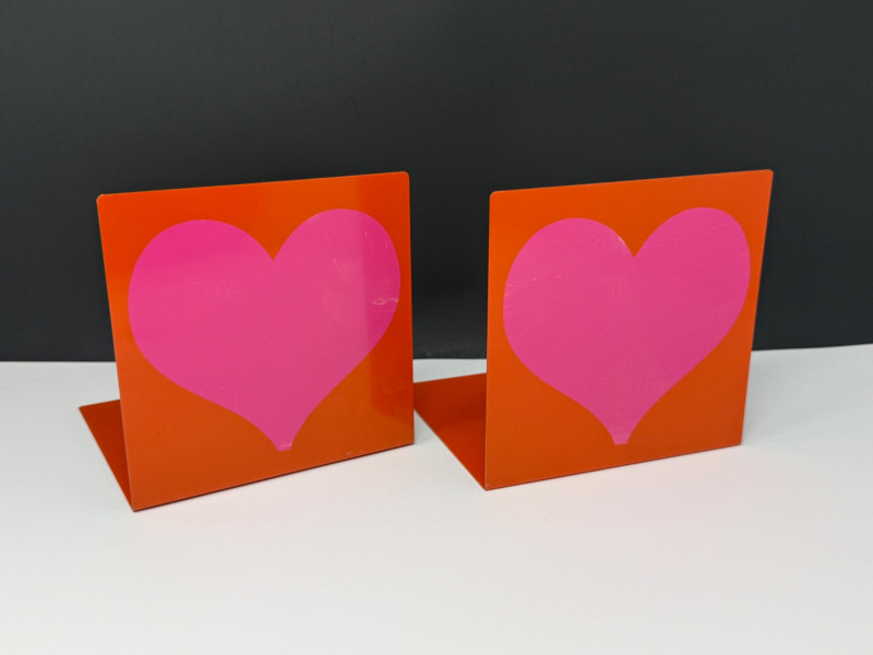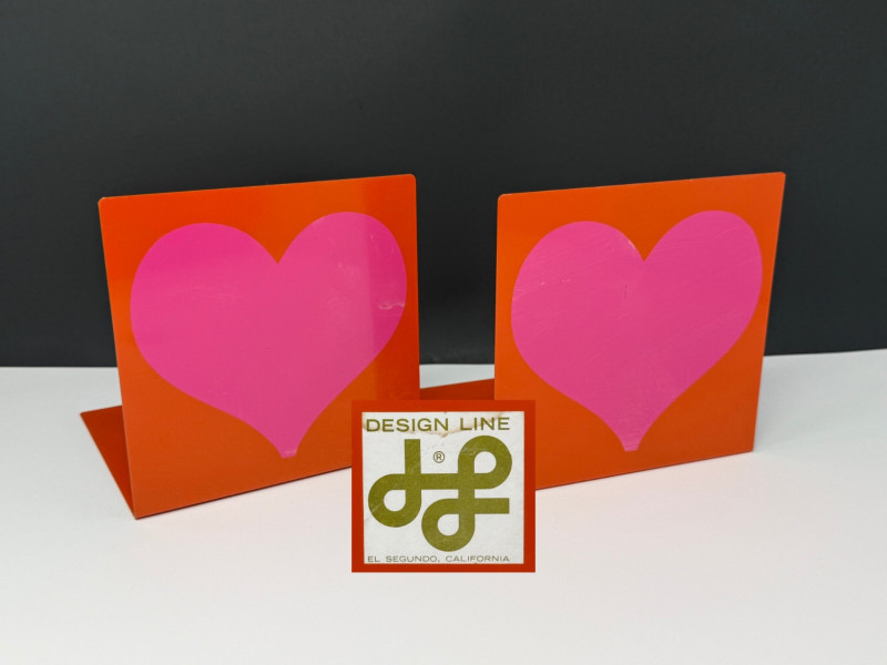 Mid Century “Heart" Pop Art Bookends by Bill Curry Design Line These Mid-Century Modern "Heart Bookends" are a vibrant example of 1960s pop-art design by Bill Curry for Design Line. Featuring a bold orange and pink color palette, these bookends are crafted from bent metal with a minimalist, geometric silhouette that captures the playful "Atomic Age" aesthetic. Each piece measures 6 inches in height, width, and length, making them a functional yet high-impact decorative statement for any vintage-inspired bookshelf or desk.