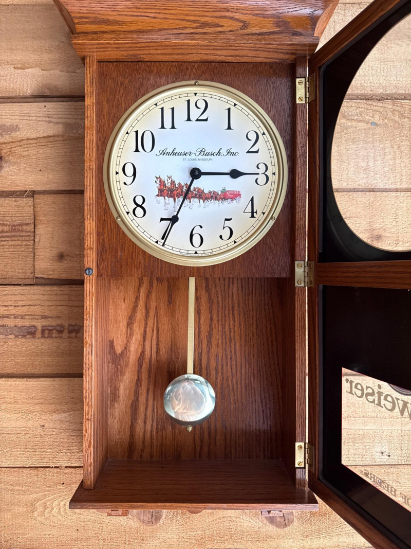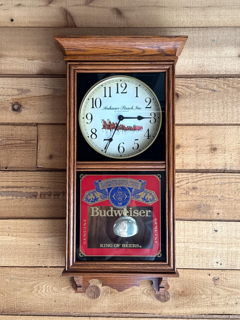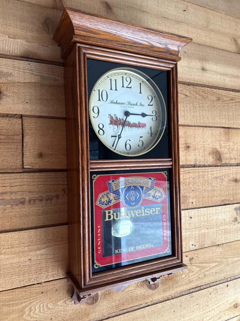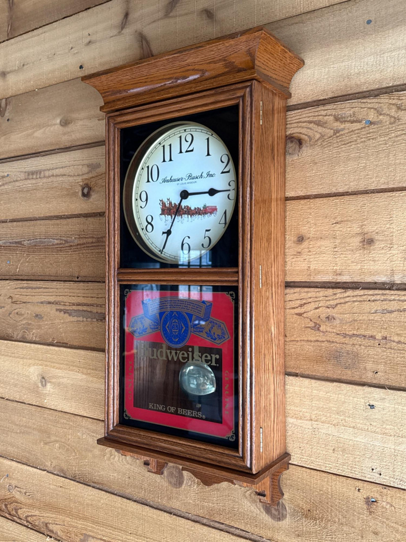 Vintage Wall Budweiser Pendulum Clock This vintage Budweiser pendulum wall clock is a quintessential piece of breweriana, designed to bring a classic "King of Beers" aesthetic to any home bar or man cave. The clock is housed in a handsome dark wood-finished case that frames an analog clock face at the top and a decorative glass door at the bottom. The lower glass panel prominently features the iconic Budweiser label graphics, and the internal brass-toned pendulum is visible as it swings. Have the booklet about the clock mechanism. *Not tested