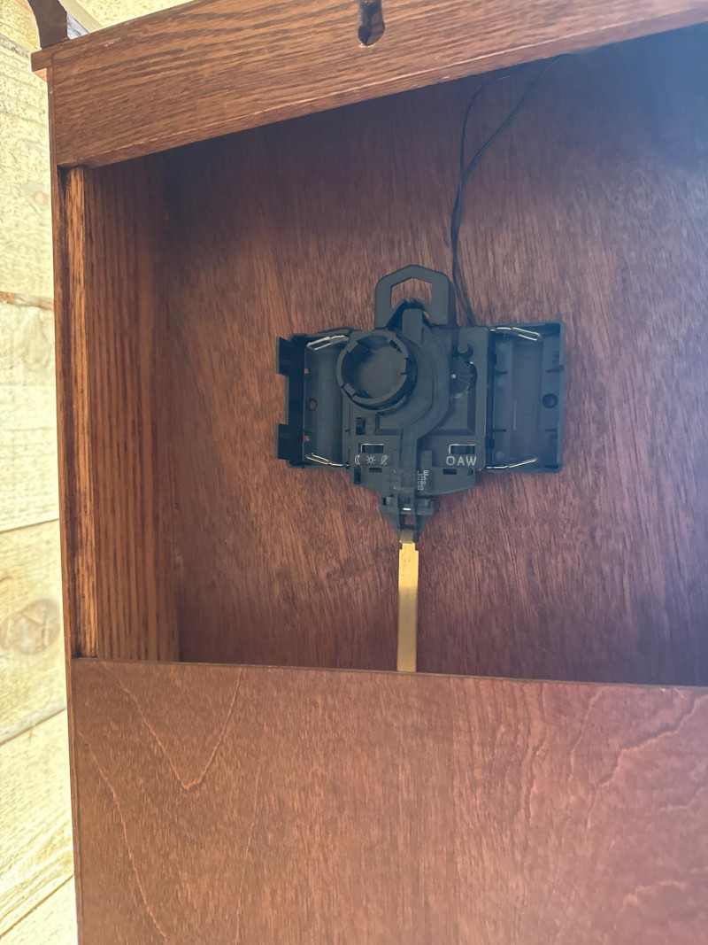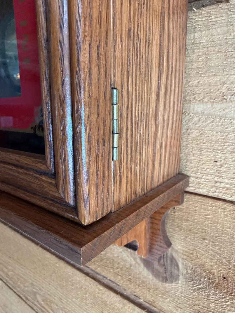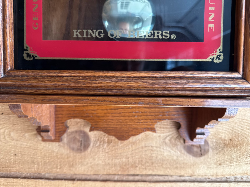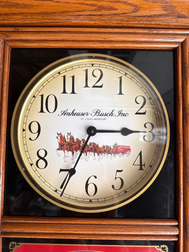 Vintage Wall Budweiser Pendulum Clock This vintage Budweiser pendulum wall clock is a quintessential piece of breweriana, designed to bring a classic "King of Beers" aesthetic to any home bar or man cave. The clock is housed in a handsome dark wood-finished case that frames an analog clock face at the top and a decorative glass door at the bottom. The lower glass panel prominently features the iconic Budweiser label graphics, and the internal brass-toned pendulum is visible as it swings. Have the booklet about the clock mechanism. *Not tested