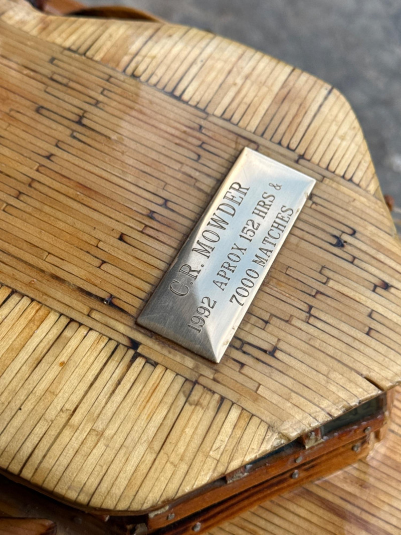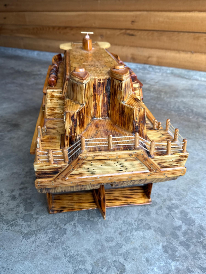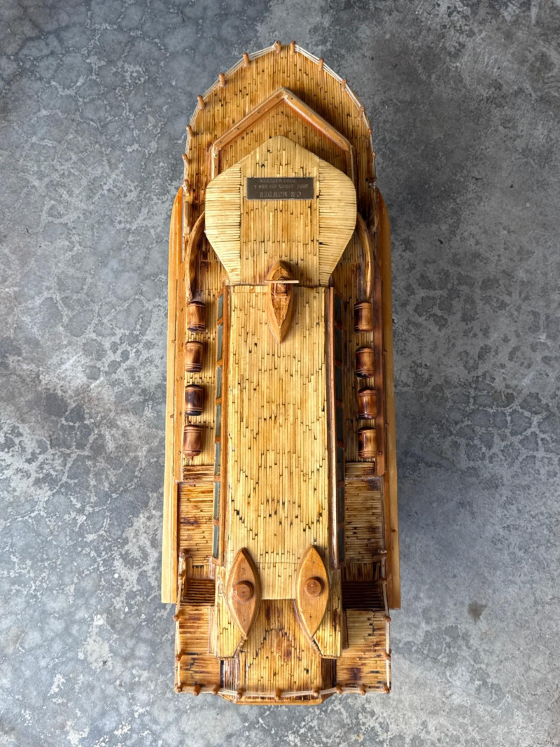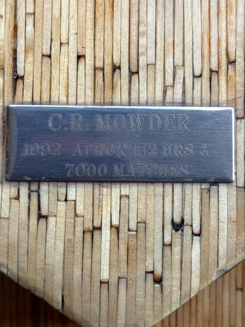 Large Folk Art Matchstick Ship Model by C.E. Mowder - 32" Long This unique folk art ship model is a creative hand-crafted piece, meticulously constructed from thousands of individual wooden matchsticks. The model features a multi-decked vessel design with a smooth, lacquered finish that enhances the natural wood tones while providing a protective sheen. It sits on a simple wooden stand and includes a dedicated nameplate identifying the creator as C.E. Mowder, noting that it took approximately 7,000 matches to complete.