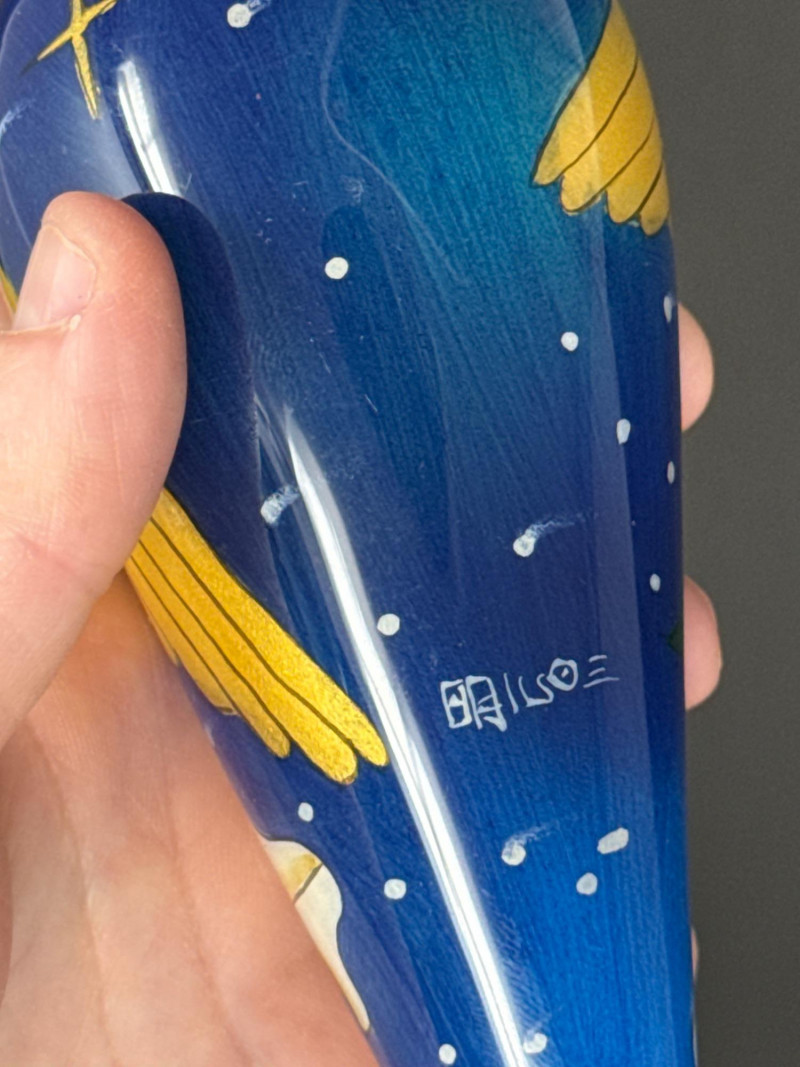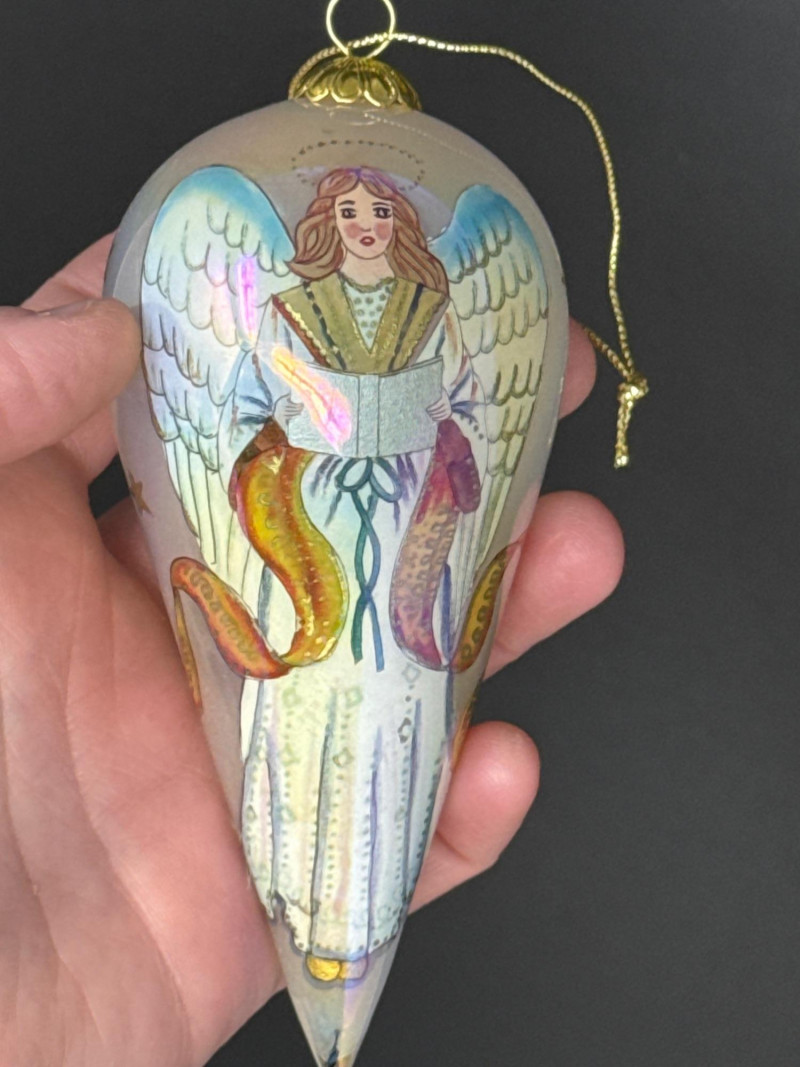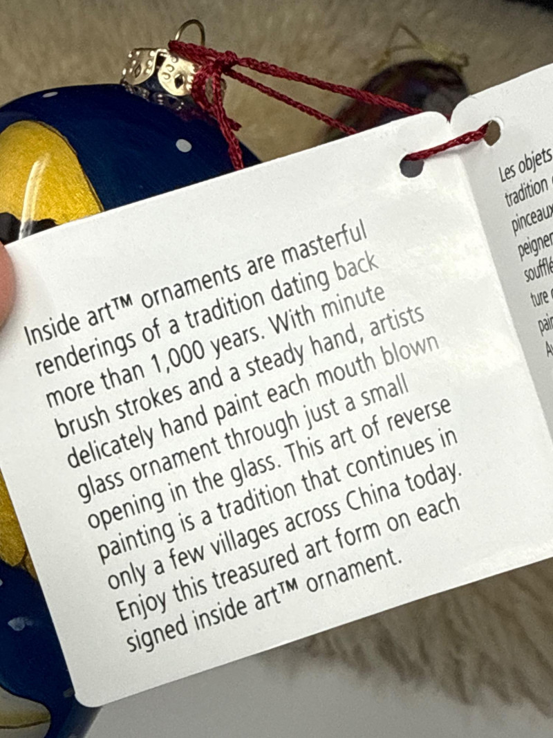 This collection of Li Bien glass art ornaments features the exquisite 200-year-old Chinese tradition of "inside painting". Each piece is crafted from hand-blown glass and meticulously hand-painted in reverse through a tiny opening at the top. This delicate technique ensures that every ornament is a unique, one-of-a-kind treasure, with the artwork protected inside the glass bulb. The set includes a variety of elegant shapes and themes, such as: Angels & Nativity Scenes: Detailed spiritual motifs often adorned with shimmering gold paint. Whimsical Holiday Characters: Hand-painted Santas and snowmen that bring festive charm to any tree. Varied Sizes: The ornaments range from approximately 4.5 to 6 inches in height, providing a dramatic and varied display.