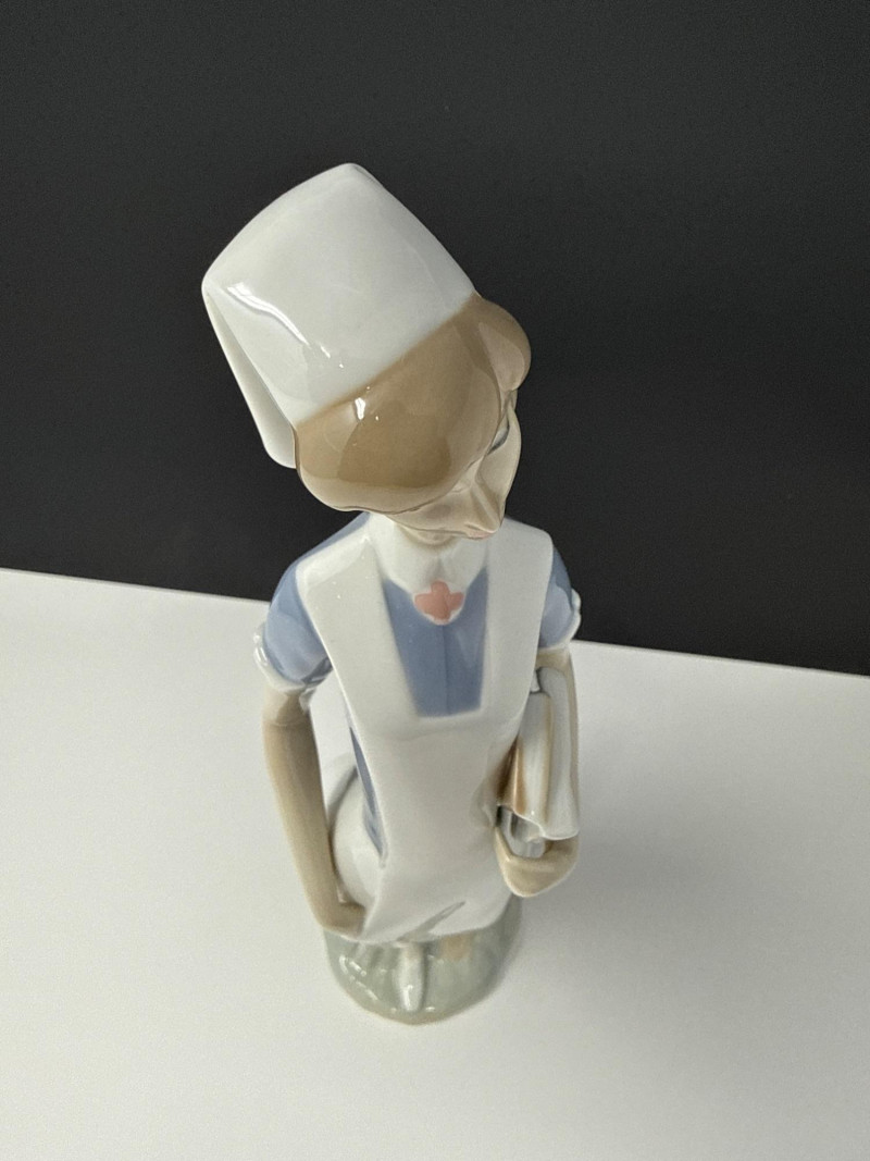 This Lladro "Nurse Standing" figurine (model #4603) is a classic piece of Spanish porcelain artistry from the brand's Professions Collection. Sculpted by Salvador Furió and first introduced in 1971, this elegant statue depicts a nurse in a traditional white and blue uniform holding patient medical charts. Standing approximately 14.25 to 14.5 inches tall, the figurine is celebrated for its graceful, slender silhouette and signature glossy glazed finish. While it was officially retired in some markets during the late 1970s, it remains a highly sought-after collectible for health professionals and Lladro enthusiasts alike due to its timeless portrayal of the nursing profession.