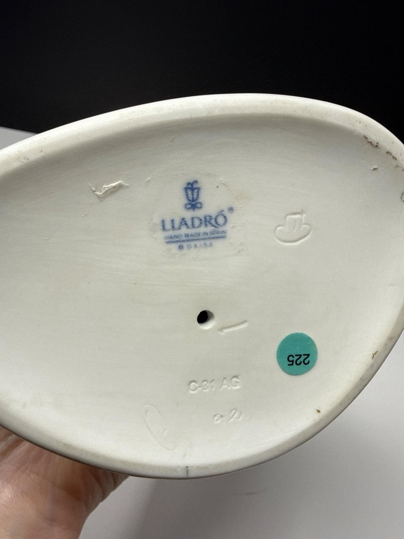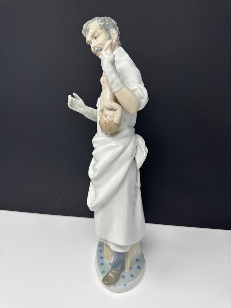 This Lladro "Obstetrician" figurine (model #4763) is a distinguished and collectible piece of Spanish porcelain from the brand’s professional series. Sculpted by the renowned artist Salvador Furió and first issued in 1971, the sculpture portrays a doctor in a long white medical smock and gray trousers, gently cradling a nude newborn baby. Standing approximately 14.25 inches tall, the figurine features the subtle, muted color palette and meticulous detail—such as the doctor's compassionate expression—that Lladro is known for. Officially retired in the 1990s, it remains a meaningful gift for medical professionals and a prized find for fine porcelain collectors.