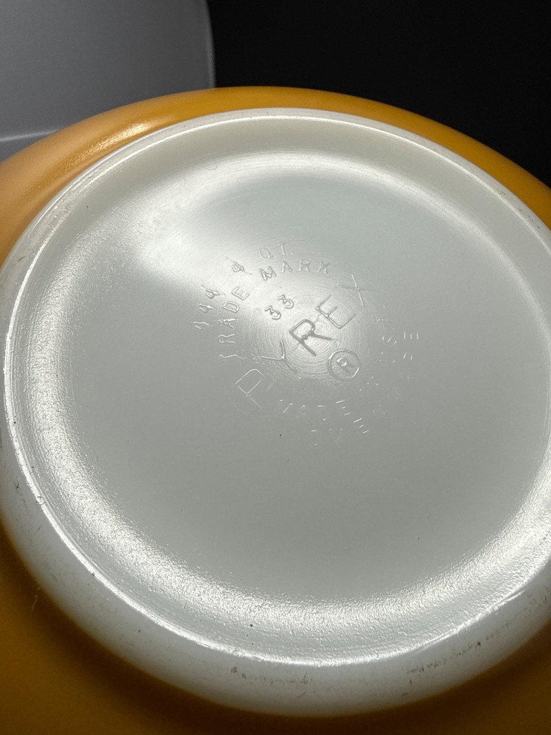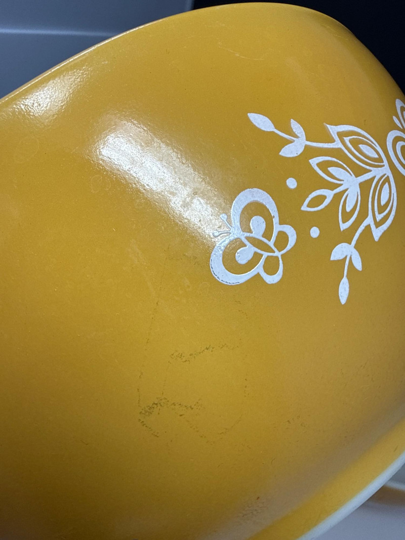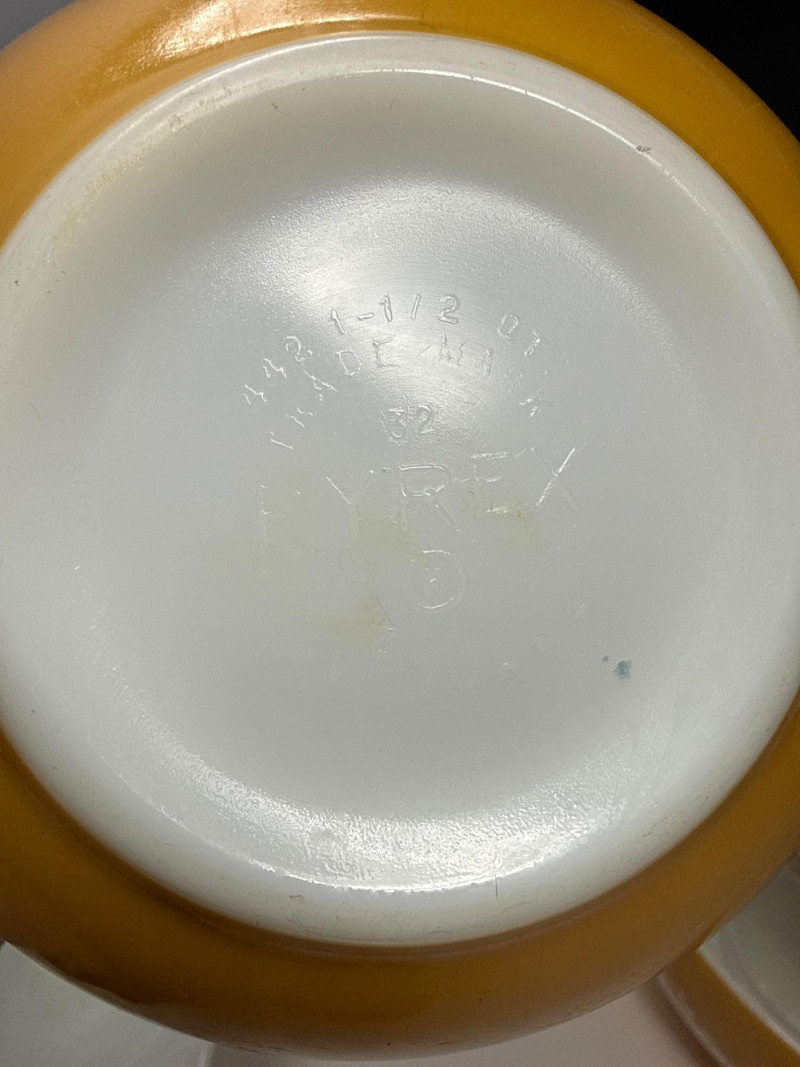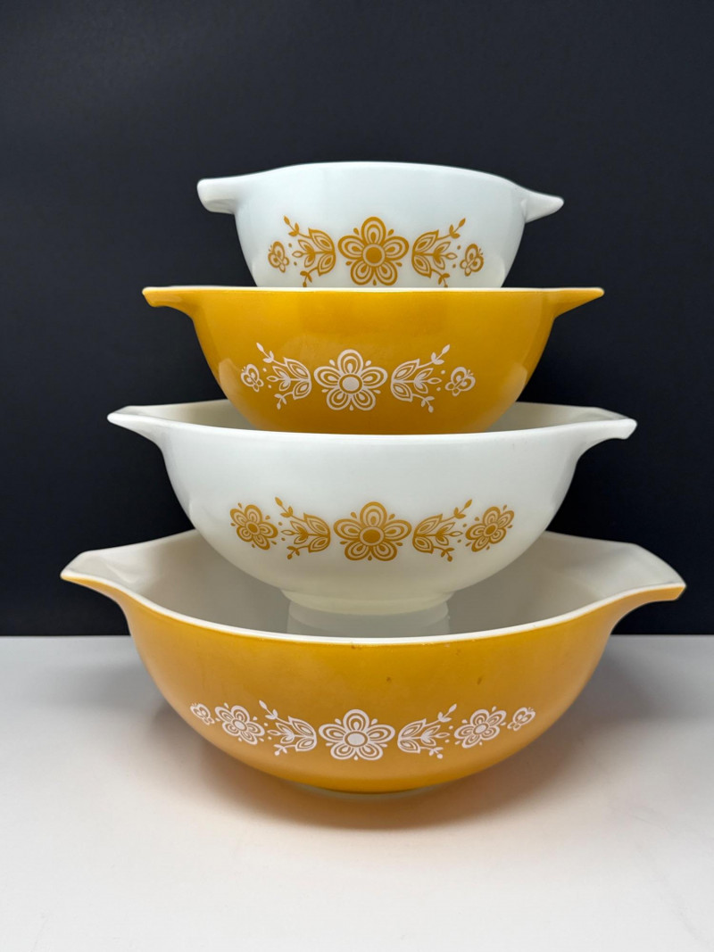 Vintage Pyrex "Butterfly Gold" 4-Piece Cinderella Nesting Bowl Set #441-444 This collection of vintage Pyrex Cinderella mixing bowls is a classic set of four nesting pieces known for their iconic "Cinderella" style, which features wide and narrow spouts and handles on both sides for easy pouring and handling. Each set typically includes four graduated sizes designed to nest perfectly within one another for efficient storage: 4-Quart (#444): The largest bowl, ideal for massive mixing tasks. 2.5-Quart (#443): A versatile mid-sized option. 1.5-Quart (#442): Perfect for side dishes or smaller batters. 1.5-Pint (#441): The smallest "chip-and-dip" size. Introduced in 1958, these bowls are crafted from durable opal glass (white opaque glass) and were released in various decorative patterns and colors, from the floral "Daisy" to the Americana "Early American". Celebrated for their "bake, serve, store" versatility, they remain highly collectible for both their mid-century aesthetic and their legendary resistance to thermal shock.