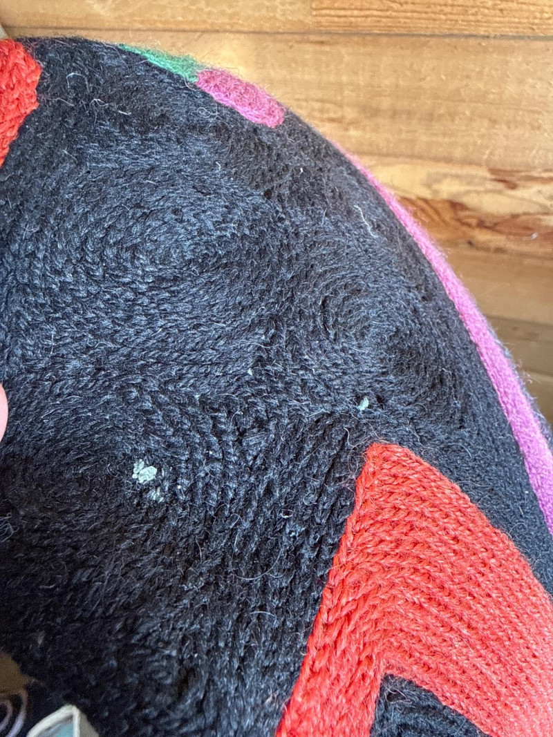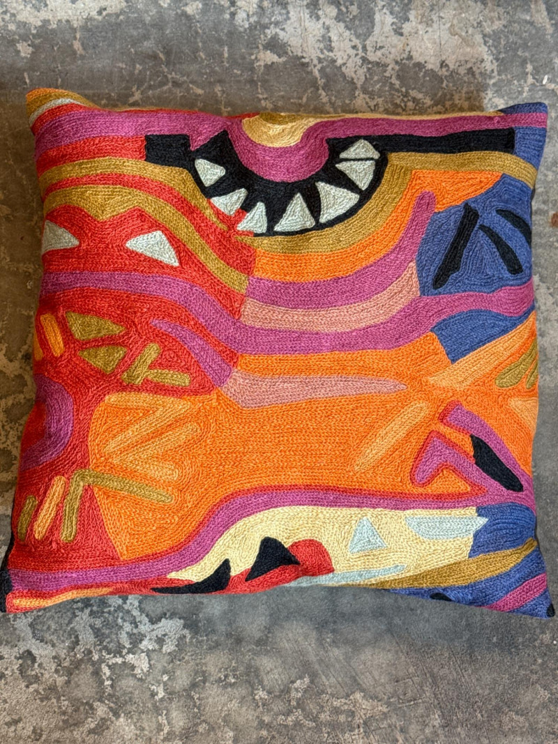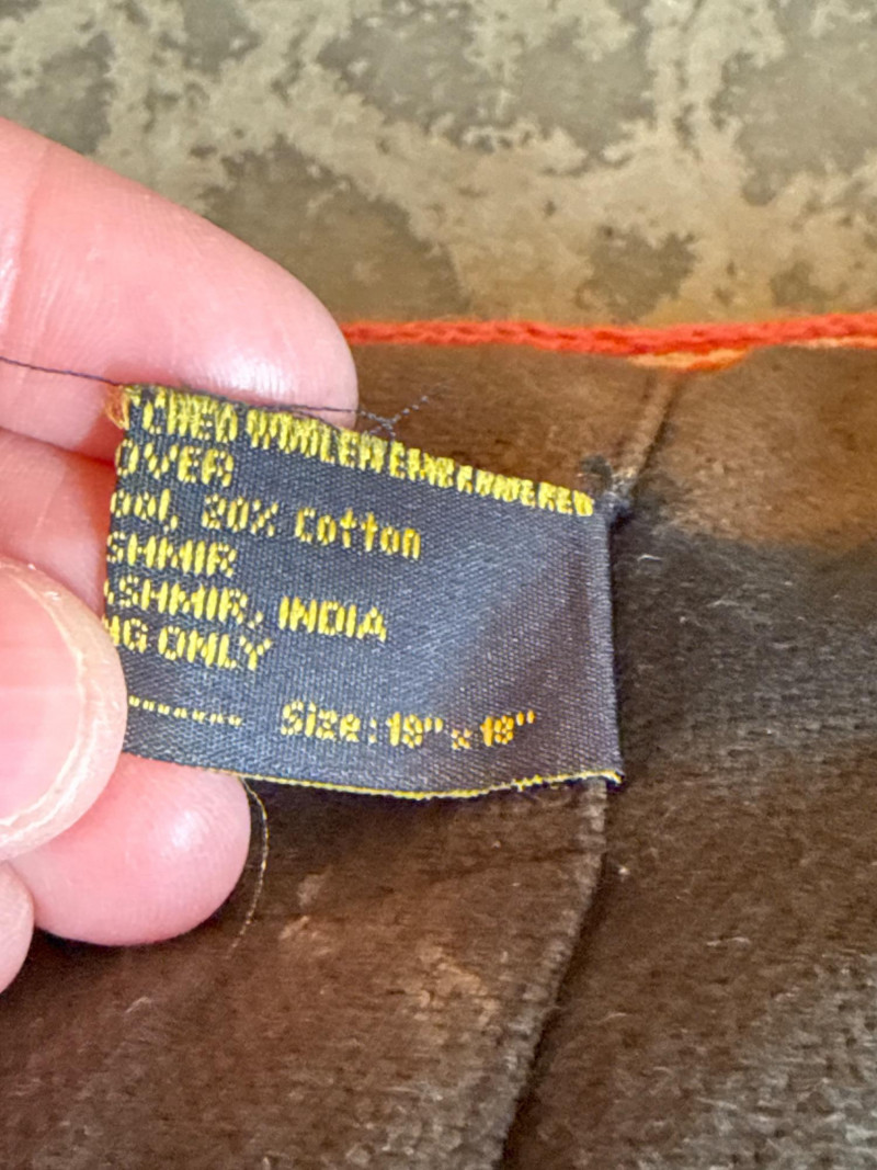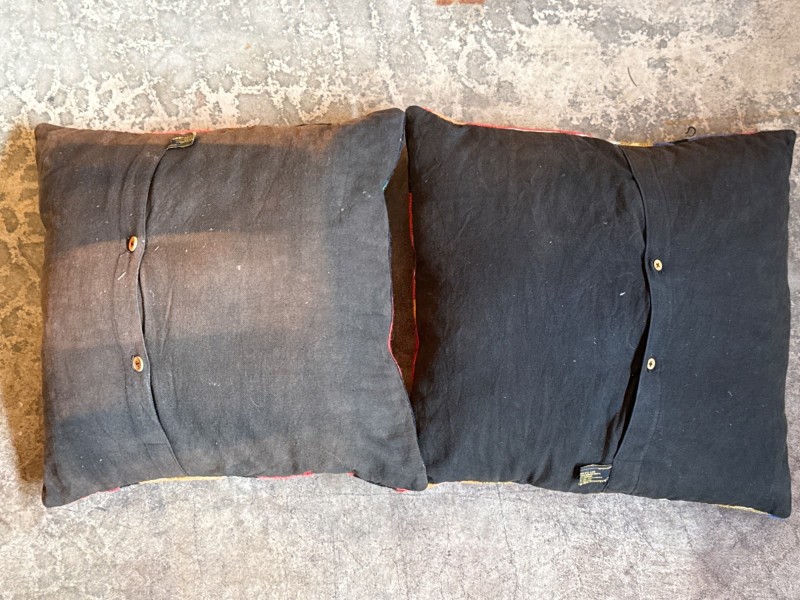 These Kashmir wool and cotton throw pillows are striking examples of traditional *please note close up photos there appears to be a slight stitch or two missing on the edge of one pillow, along with the back of one being sun faded. You can't tell when the pillow is in use. Cleaning is advisable.