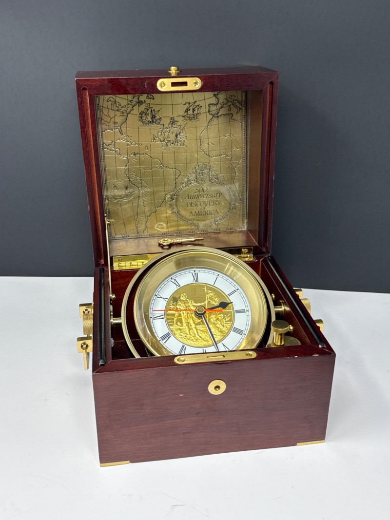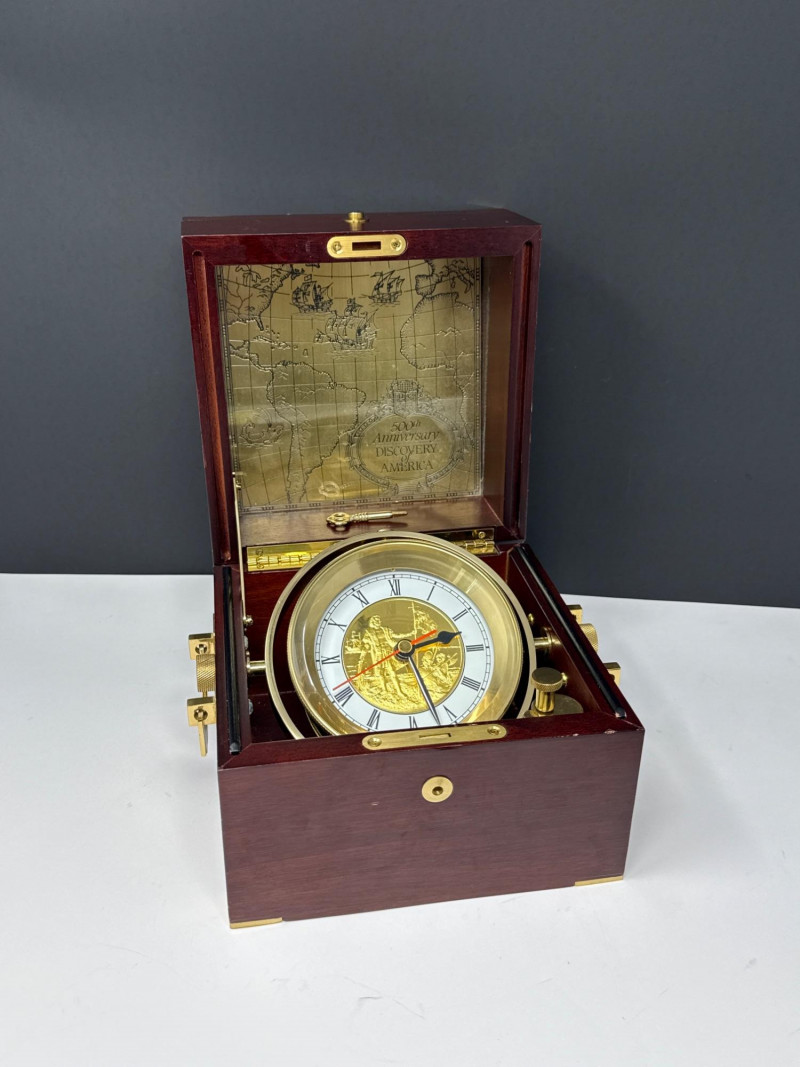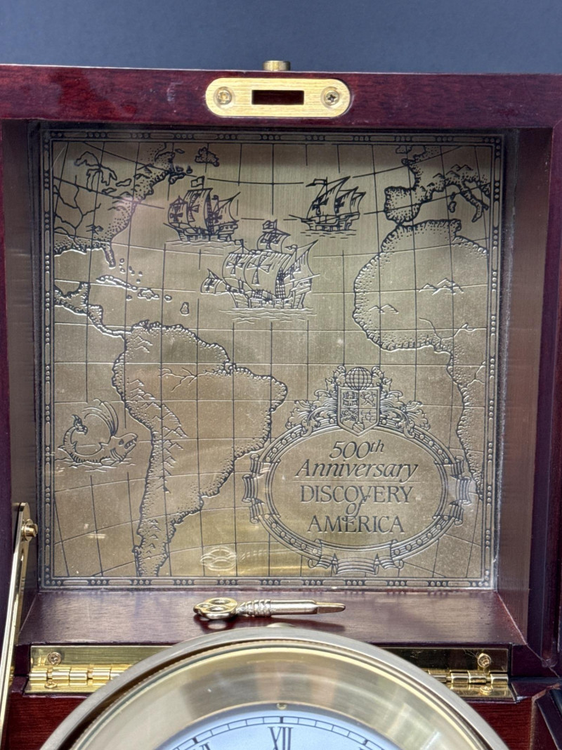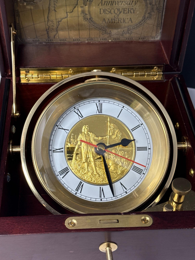 This Franklin Mint "500th Anniversary" Maritime Chronometer is a stunning tribute to the historic 1492 voyage of discovery. Encased in a rich wood display box, this gimbaled timepiece features elegant brass elements and a vintage-style map on the interior lid, capturing a true maritime and nautical-inspired design. While it remains a sophisticated collector's piece, it is in vintage, used condition, adding a sense of authentic character to its storied aesthetic. The box is pretty hefty! Possibly Mahogany wood?
