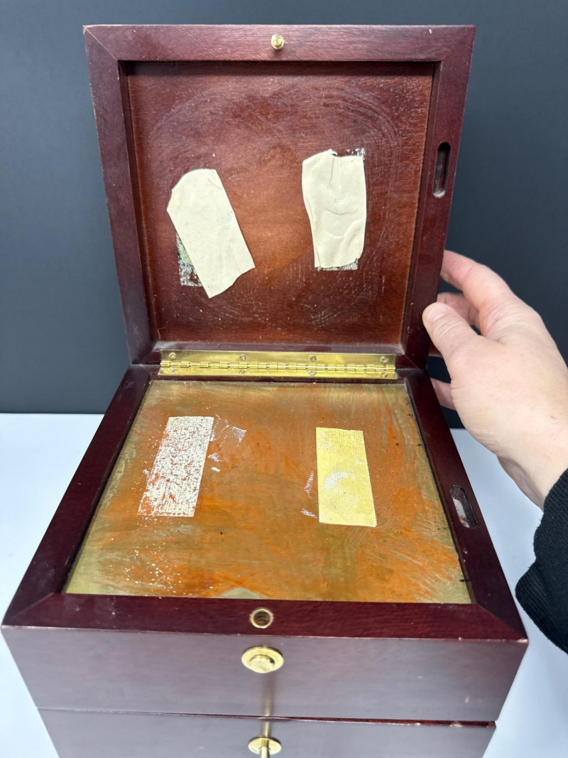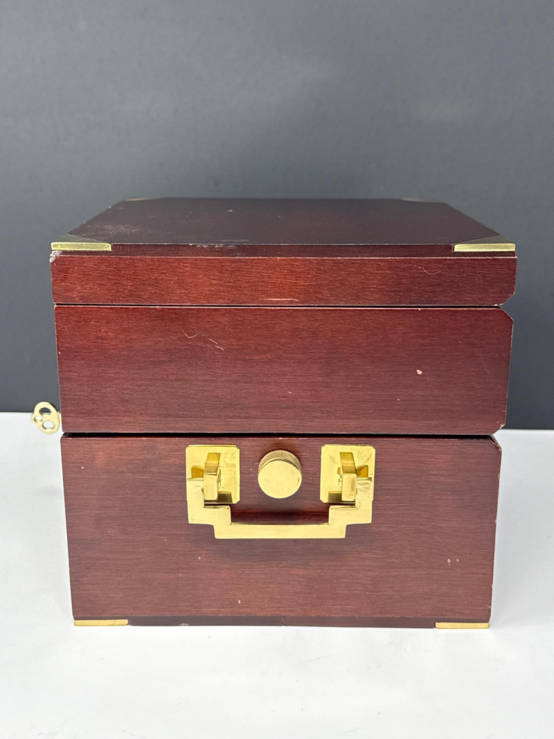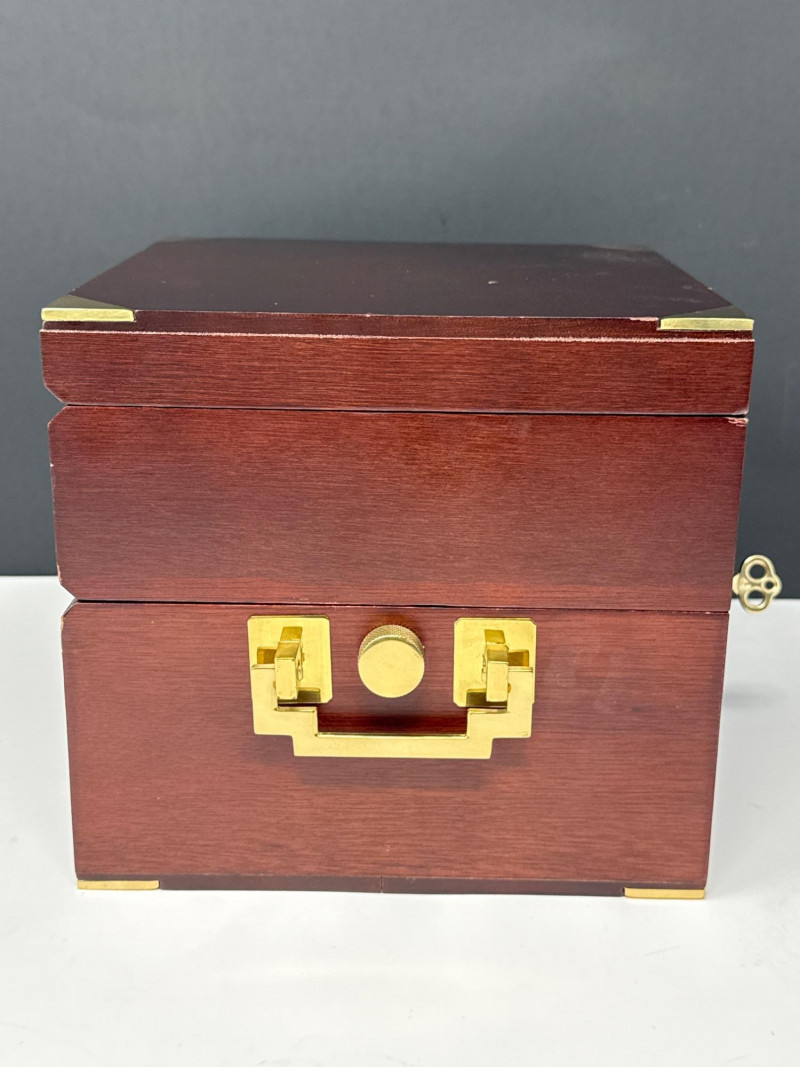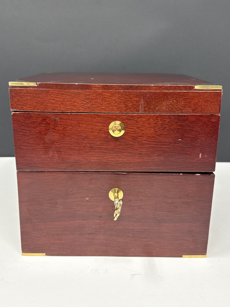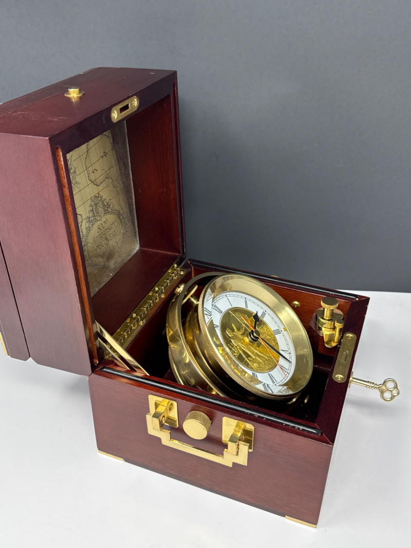 This Franklin Mint "500th Anniversary" Maritime Chronometer is a stunning tribute to the historic 1492 voyage of discovery. Encased in a rich wood display box, this gimbaled timepiece features elegant brass elements and a vintage-style map on the interior lid, capturing a true maritime and nautical-inspired design. While it remains a sophisticated collector's piece, it is in vintage, used condition, adding a sense of authentic character to its storied aesthetic. The box is pretty hefty! Possibly Mahogany wood?