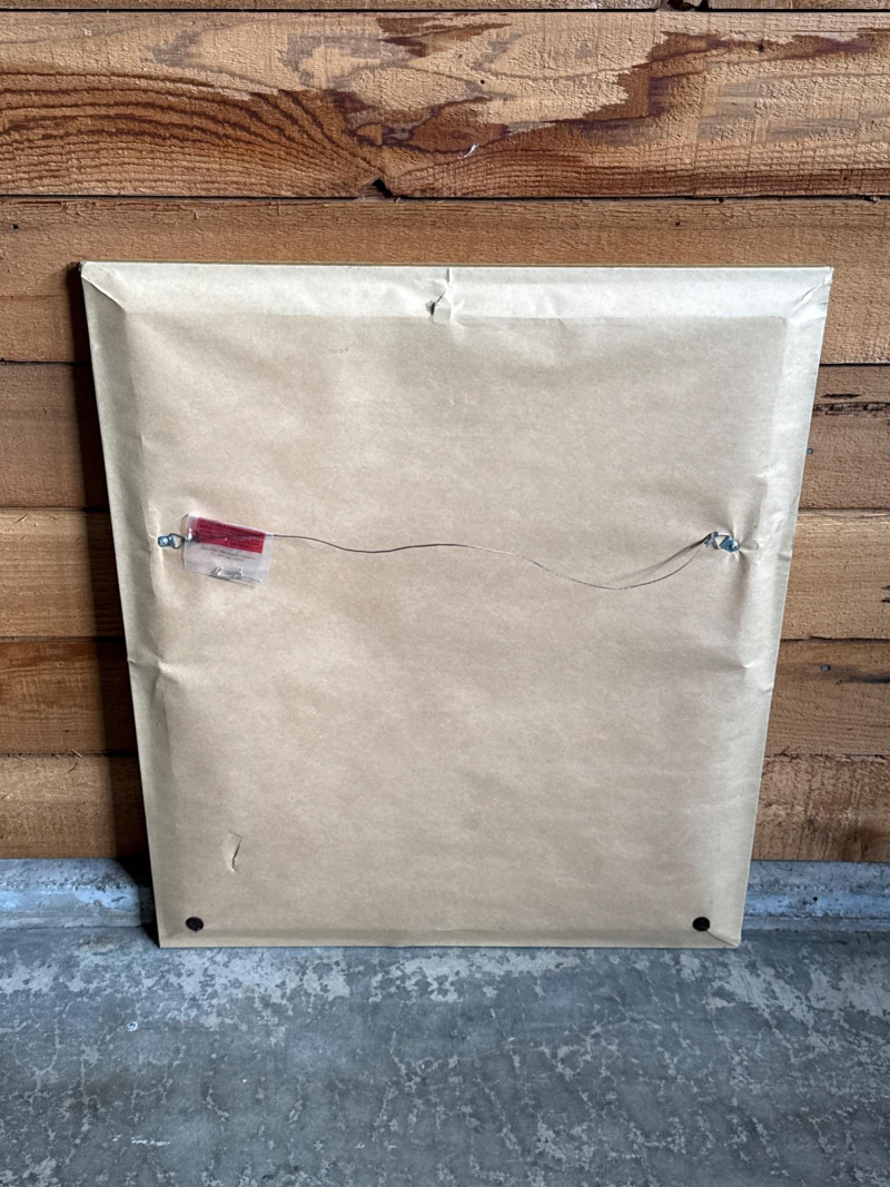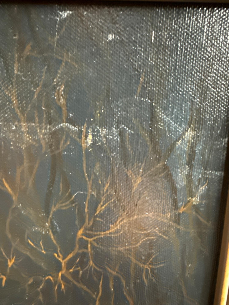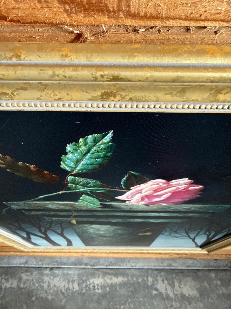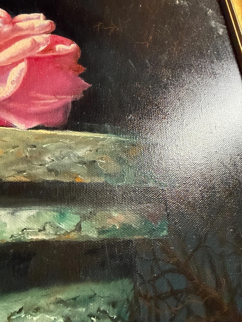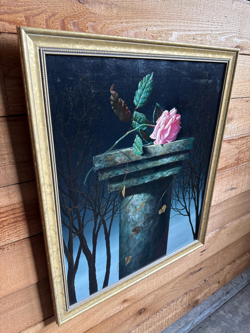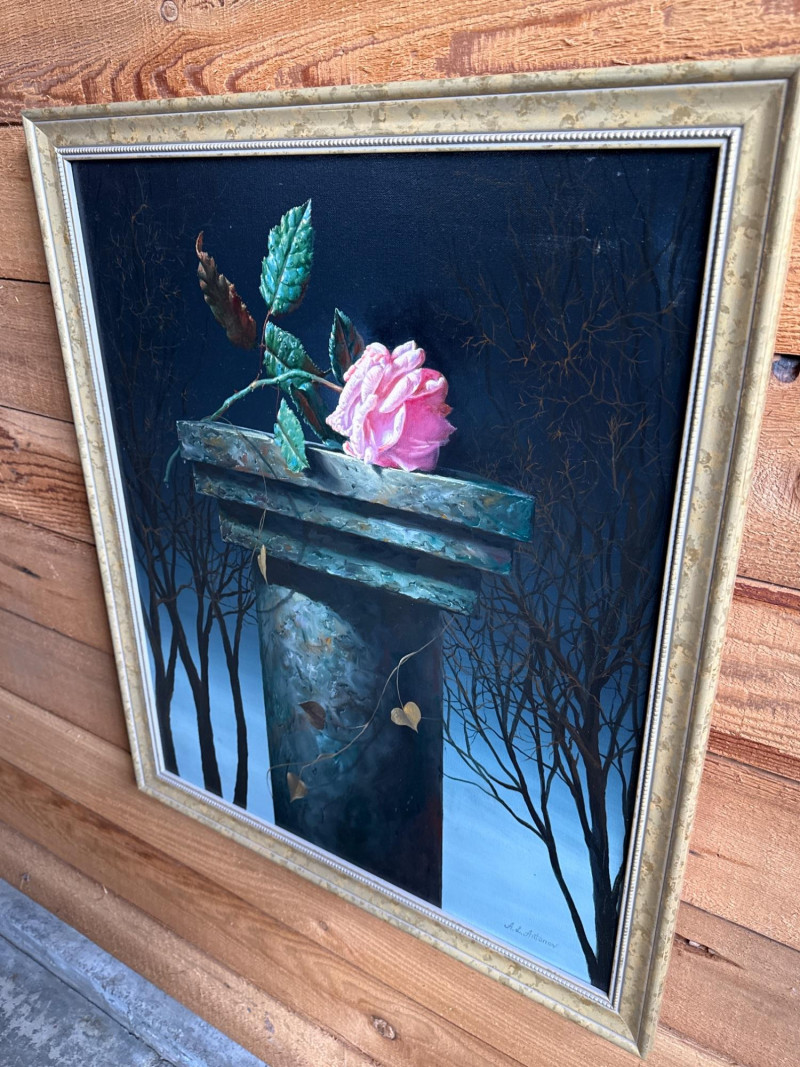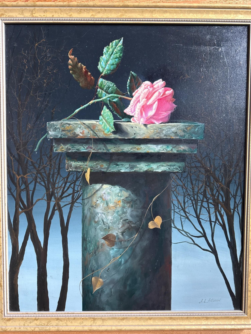 This painting by artist A. L. Antonov features a striking surrealist composition. The artwork depicts a single, vibrant pink rose resting upon a weathered stone pedestal, set against a dark, atmospheric background of silhouetted trees. *There appears to be a slight indent at the top right corner of the canvas. I tried to capture in third to last photo.