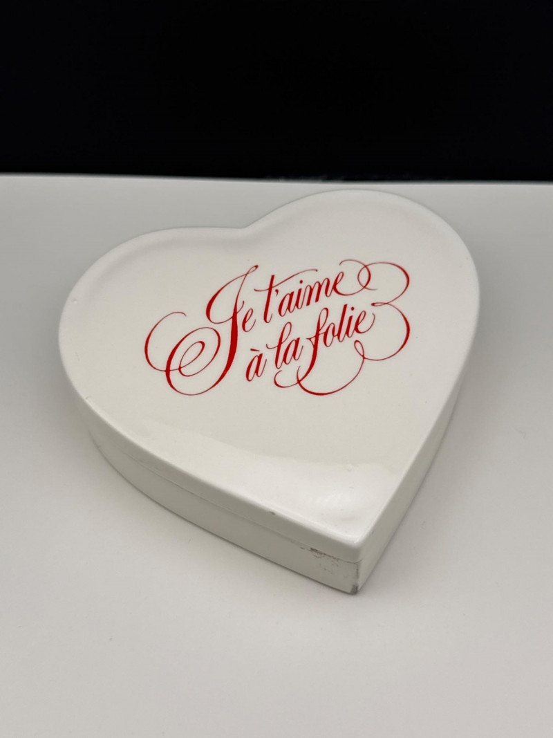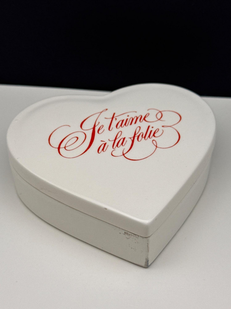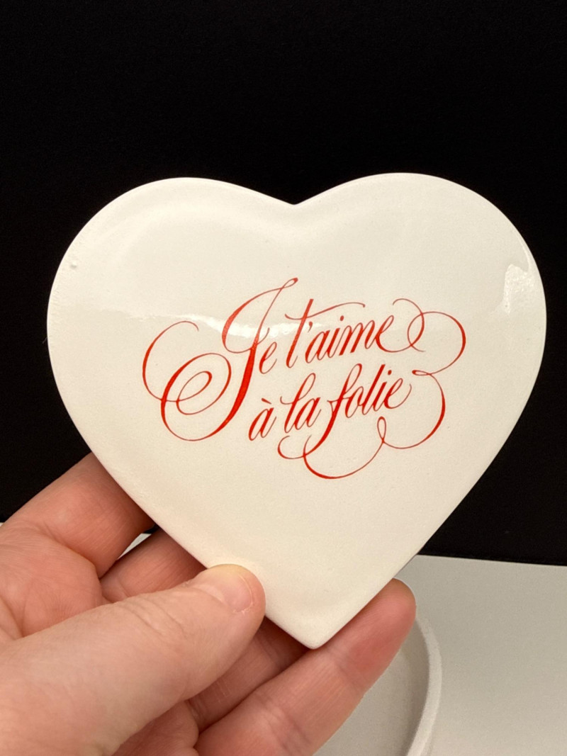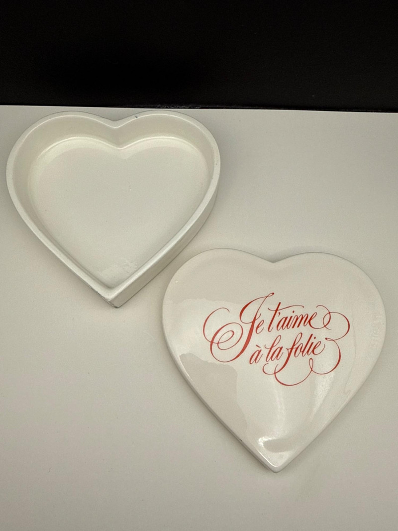 Tiffany & Co. Vintage Heart “Je t’aime à la folie” Box Adorable little box with lid. “Je t’aime à la folie” is French for I Love You Madly. Please note- a few imperfections to the glaze. I tried to take good close ups. Would be so adorable for Valentines Day!!