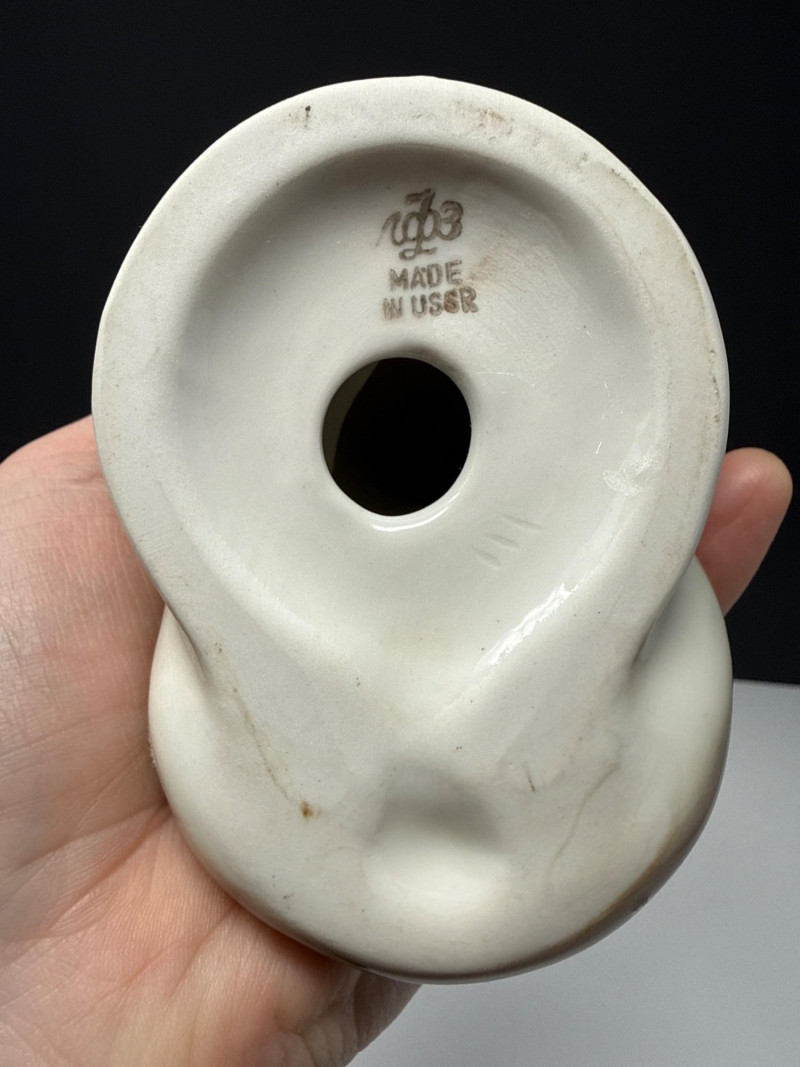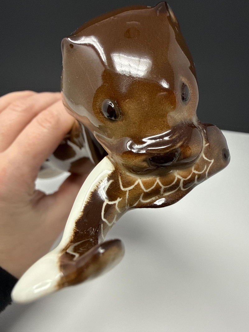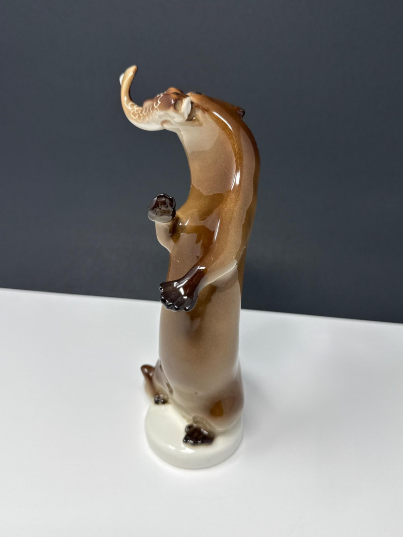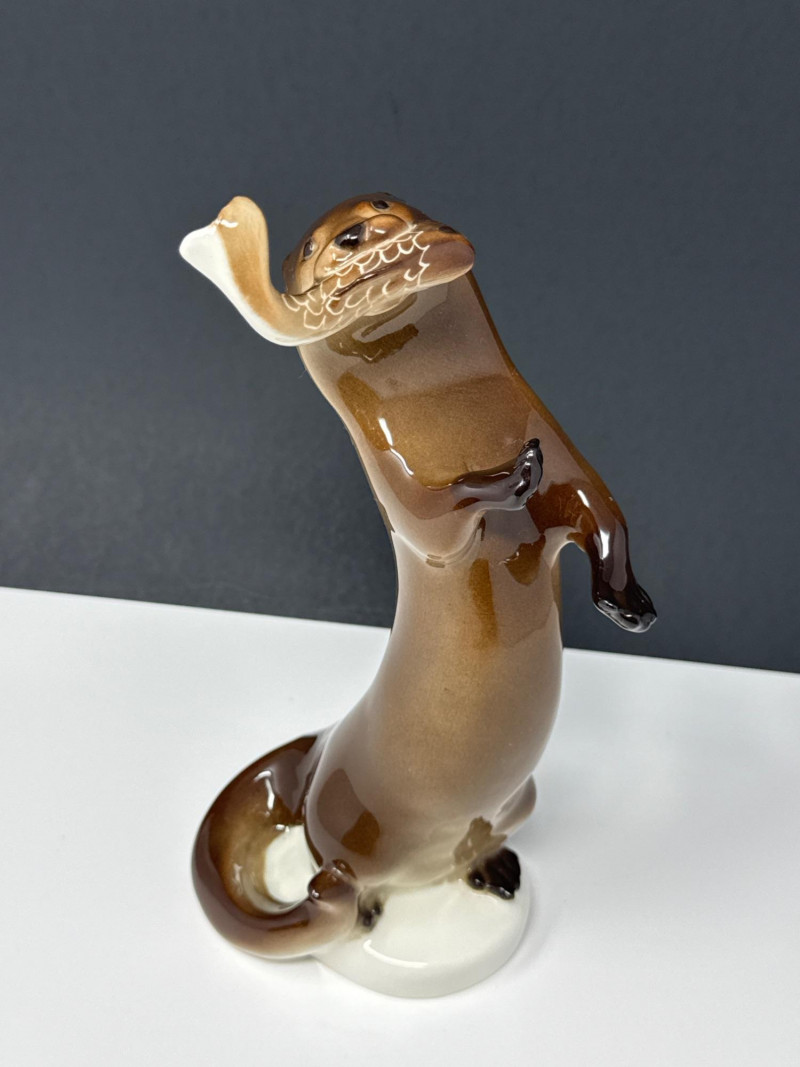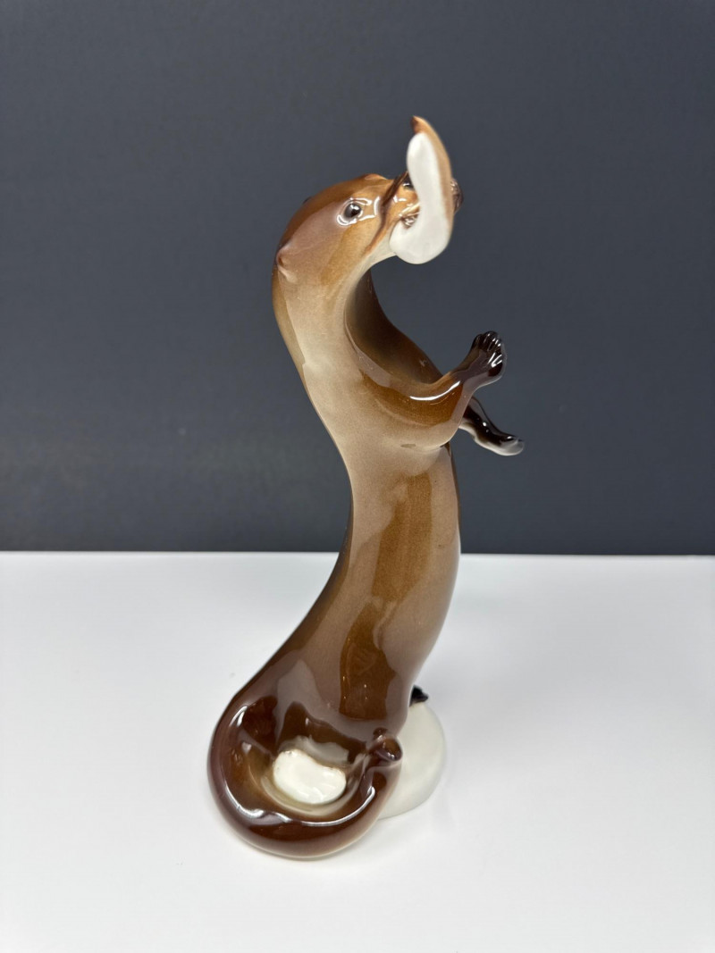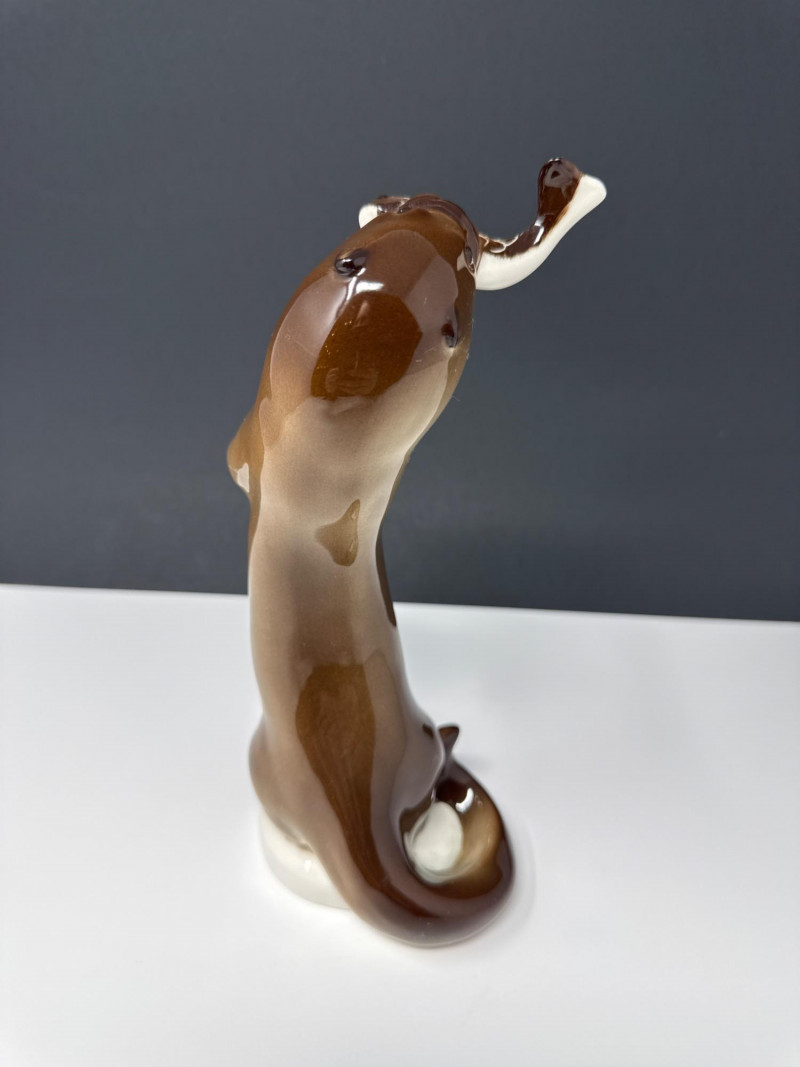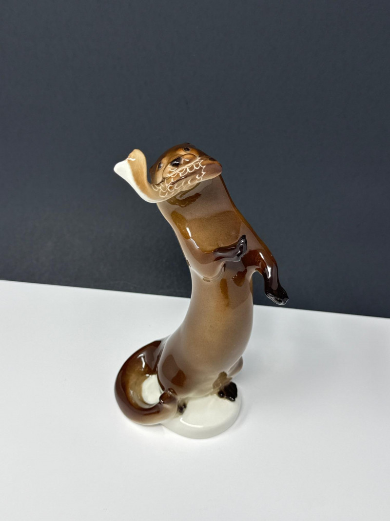 This vintage Lomonosov porcelain figurine is a classic work of Russian ceramic art, designed by the celebrated sculptor Boris Vorobyov in 1961. Portraying a graceful otter with a fish in its mouth, the piece is meticulously hand-painted with a beautiful underglaze finish that highlights the animal's naturalistic details. Standing approximately 8.5 inches tall, the figurine was produced at the Leningrad Porcelain Factory (LFZ) during the Soviet era and bears the red "MADE IN USSR" mark on the base. Now considered a retired and collectible model, this fine porcelain sculpture serves as both a charming tribute to wildlife and a piece of historical Imperial Russian heritage.
