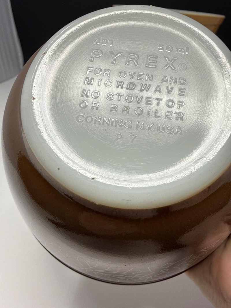 This vintage Pyrex mixing bowl set features the warm and rustic "Woodland" pattern, which was a staple of American kitchens throughout the 1970s and 80s. The collection includes a nested trio of bowls in alternating shades of cinnamon brown and ivory, adorned with a delicate white floral and leaf filigree. Crafted from Pyrex's legendary heat-resistant borosilicate glass, these bowls are designed for versatile use in mixing, baking, and serving. This set is a highly sought-after choice for collectors of mid-century kitchenware or anyone looking to add a touch of retro farmhouse charm to their home.
