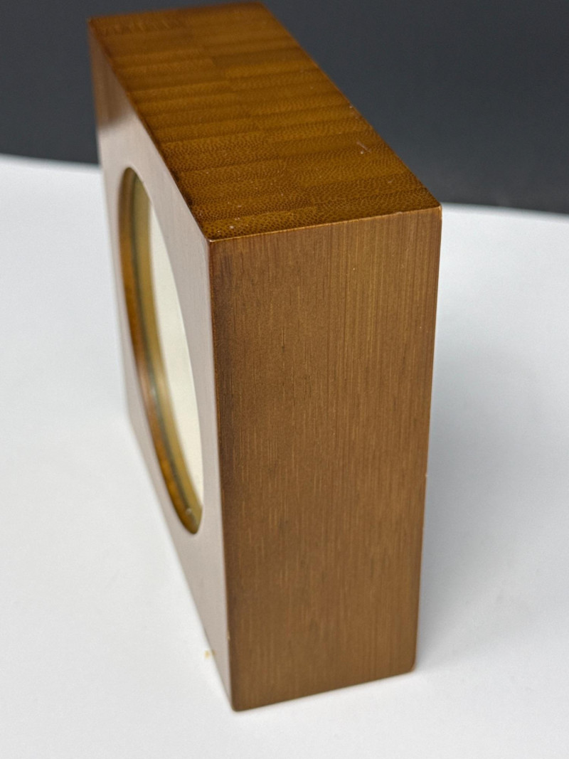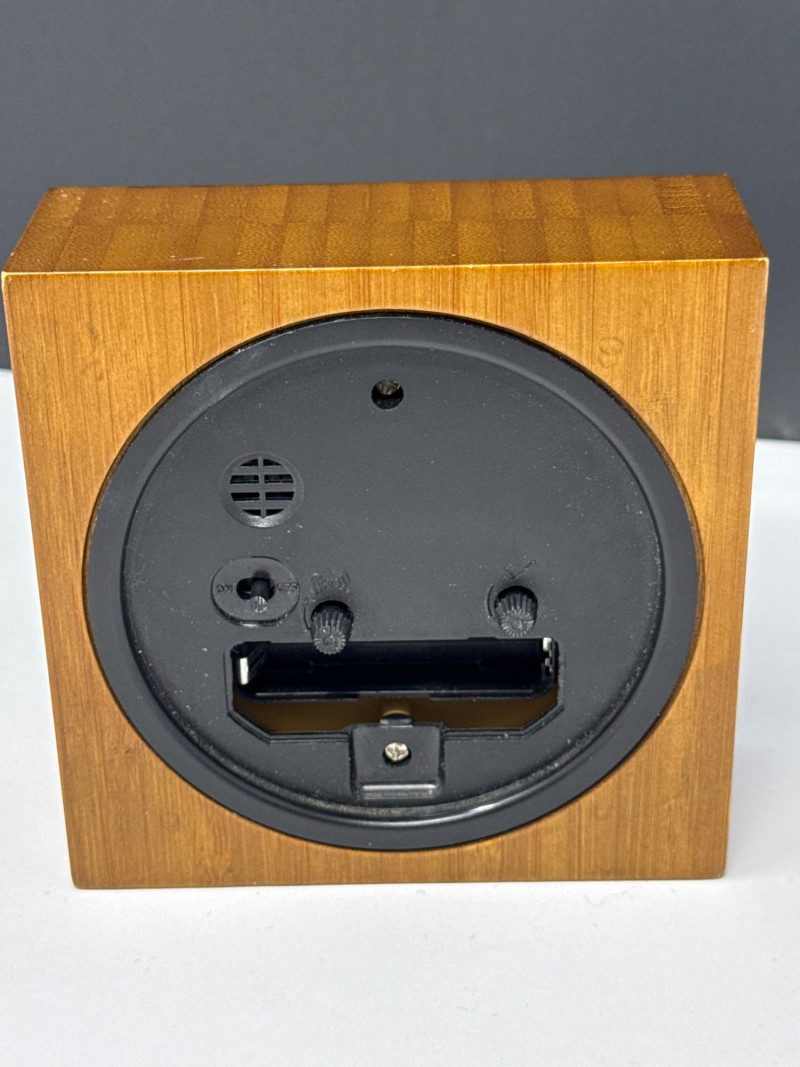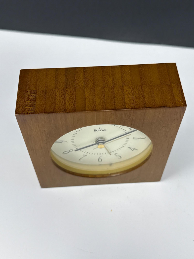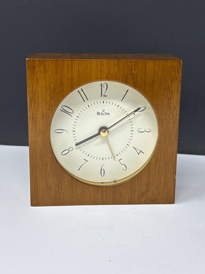 This vintage Bulova desk alarm clock is a classic piece of mid-century-inspired decor, likely dating to the late 1970s or early 1980s. It features a clean, square design with a wood-grain finish and a traditional analog face with gold-tone hands and black Arabic numerals. Brand: Movement: This model typically features a mechanical wind-up movement. Dimensions: Approximately 4.25" L x 4.25" W x 1.5" H. Operational Status: The clock is currently untested. Maintenance Required: There are bugs inside the casing, and it will require a thorough cleaning by the buyer.Key Details: