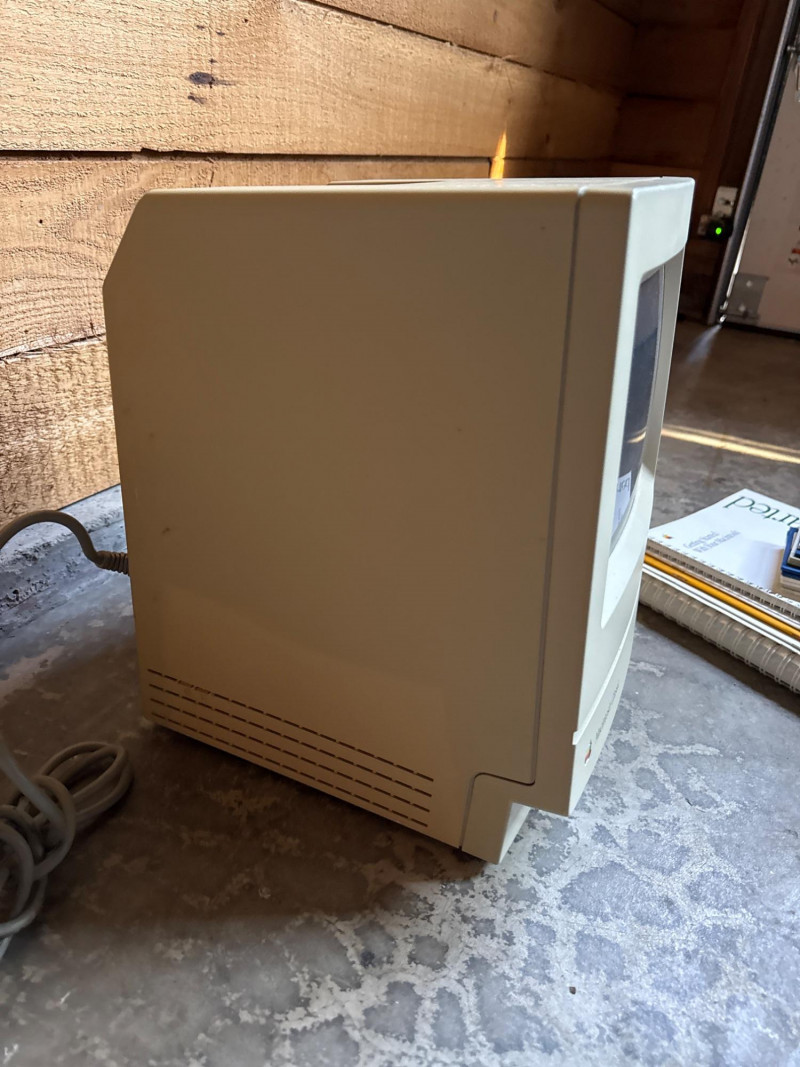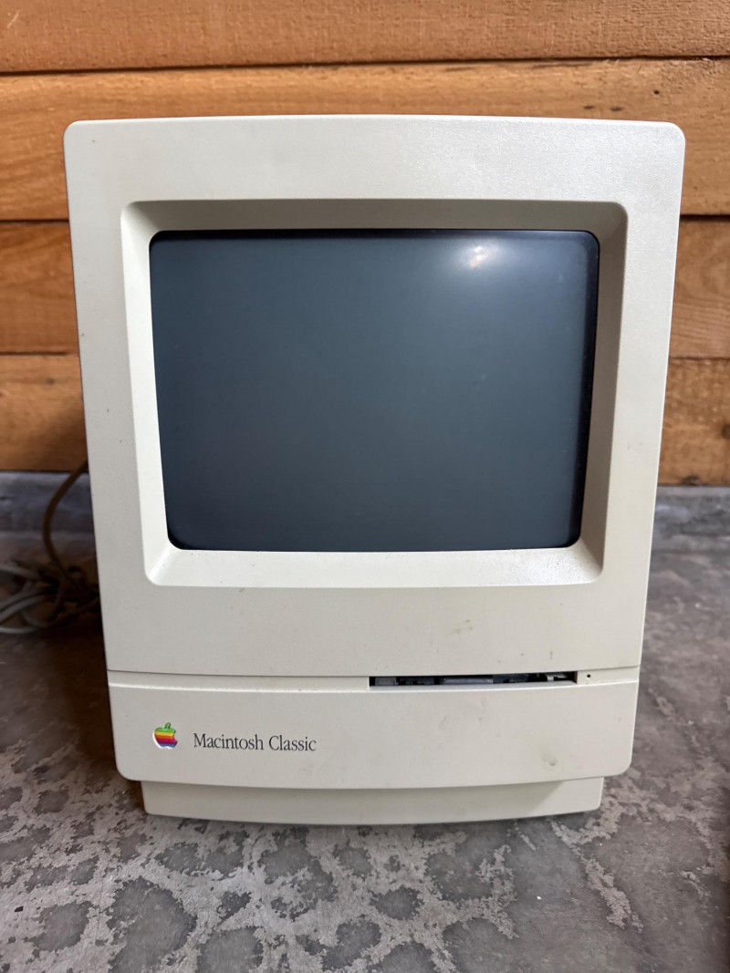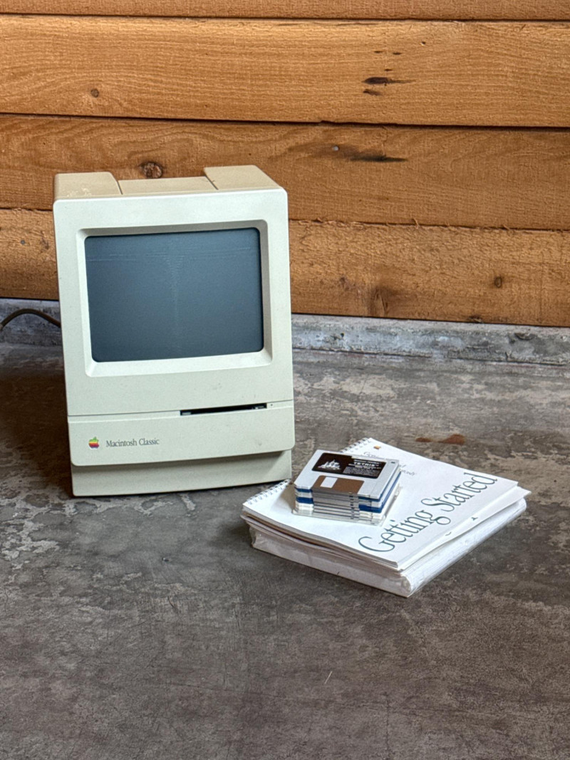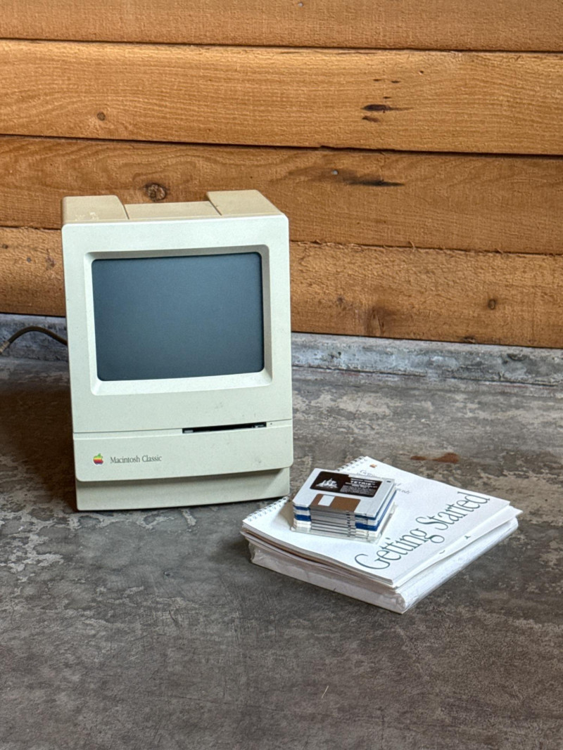 This lot features a vintage 1991 Apple Macintosh Classic computer, a quintessential piece of computing history from the early 90s. The unit includes the original computer tower and a "Getting Started" manual. Please note that this listing is for the computer only and does not include a keyboard or mouse. A few floppy disks are included. Please note photos. Power: The computer does power up when plugged in. Screen: The internal display is currently non-functional. Visuals: Upon powering, slight white squiggles flash on and off the screen, suggesting it may require repair or restoration. Cosmetic: The casing shows some expected vintage wear and slight yellowing consistent with its age. Brand: Apple. Model: Dimensions: Approximately 13.5” Height x 10” Width x 10” Depth.Condition & Technical Notes: