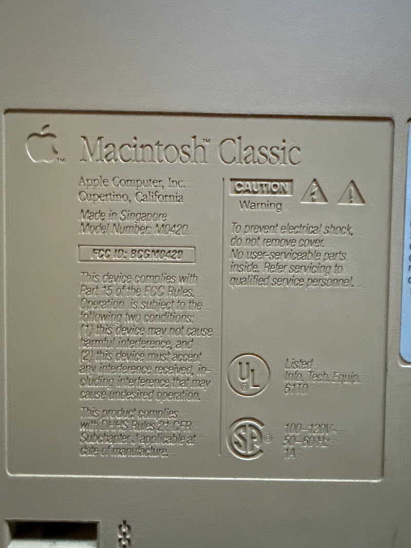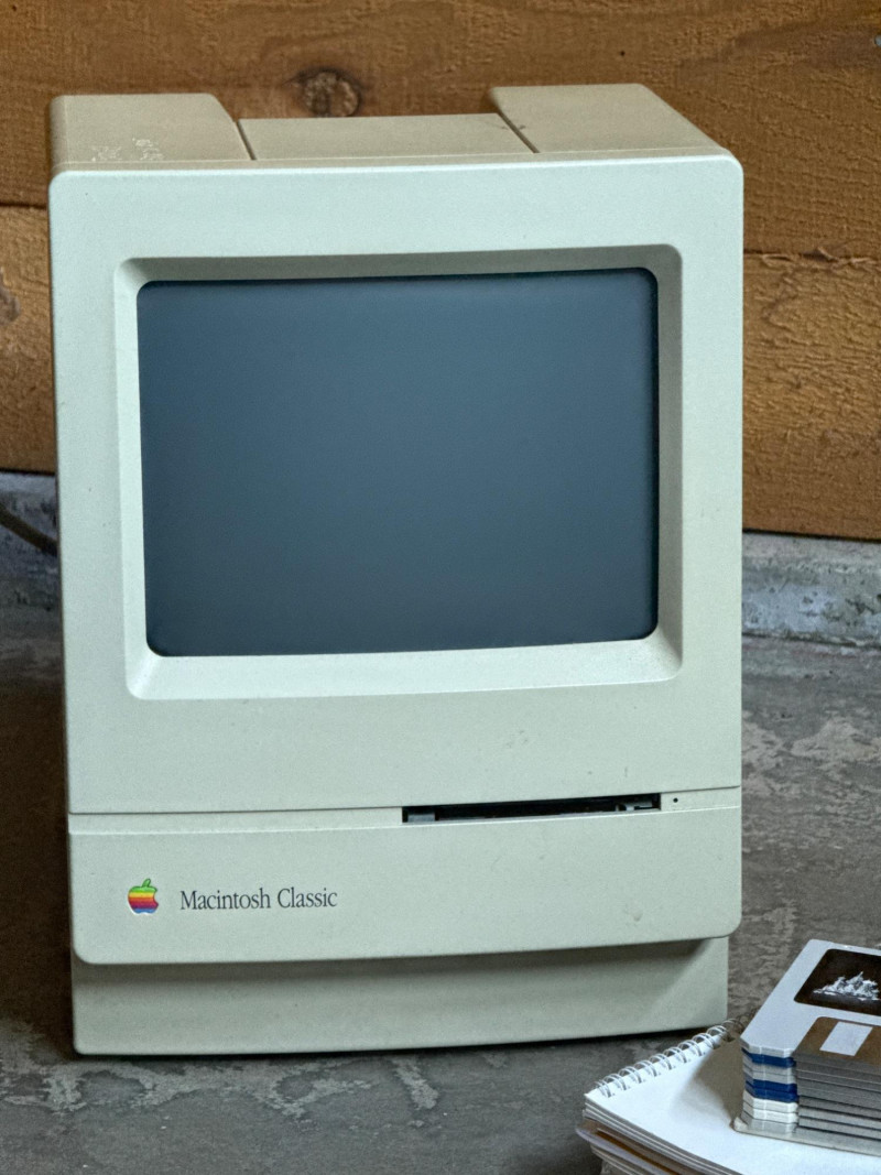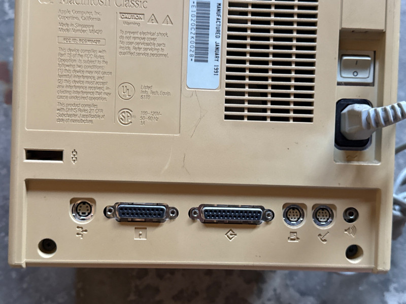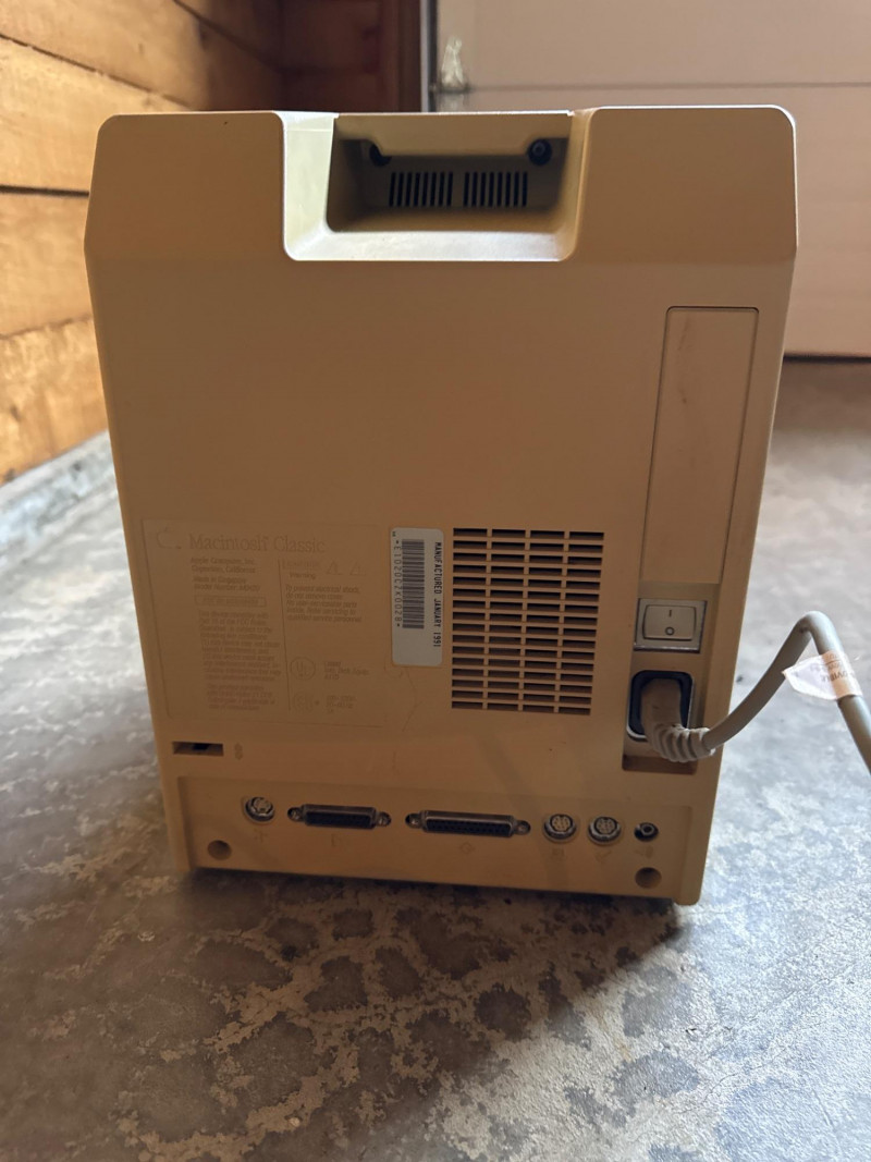 This lot features a vintage 1991 Apple Macintosh Classic computer, a quintessential piece of computing history from the early 90s. The unit includes the original computer tower and a "Getting Started" manual. Please note that this listing is for the computer only and does not include a keyboard or mouse. A few floppy disks are included. Please note photos. Power: The computer does power up when plugged in. Screen: The internal display is currently non-functional. Visuals: Upon powering, slight white squiggles flash on and off the screen, suggesting it may require repair or restoration. Cosmetic: The casing shows some expected vintage wear and slight yellowing consistent with its age. Brand: Apple. Model: Dimensions: Approximately 13.5” Height x 10” Width x 10” Depth.Condition & Technical Notes: