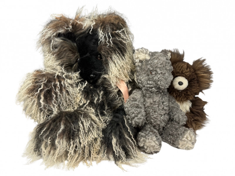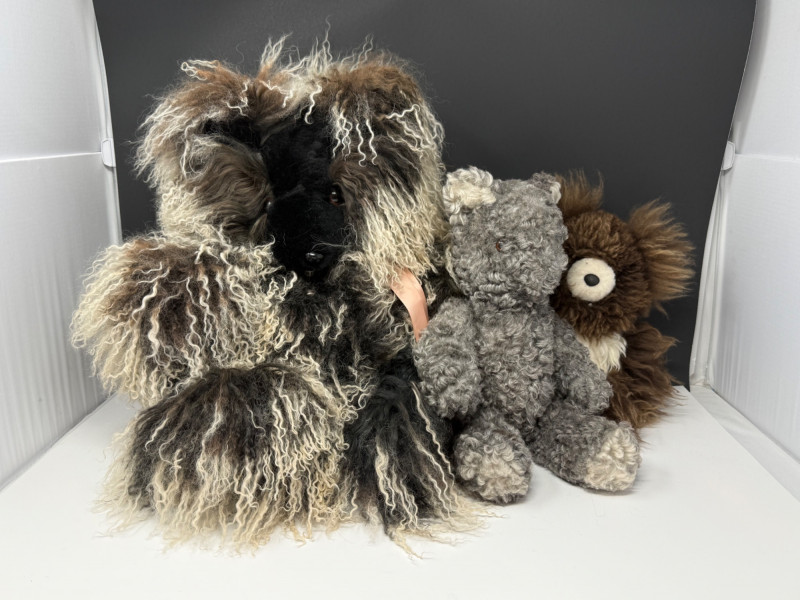 This lot features a charming "Teddy Trio" collection, consisting of three high-quality plush bears crafted from unique natural materials. Each bear offers a distinct texture and artisanal quality that makes this set a standout for collectors. Large White Bear: Hand-crafted from premium Mongolian fur. It measures approximately 15” high while sitting and 16” wide. Medium Brown Bear: Crafted from soft Llama fur. It measures approximately 14” long. Small Grey Bear: Features a plush, natural fur-style finish. It measures approximately 15” long.Item Details & Materials:
