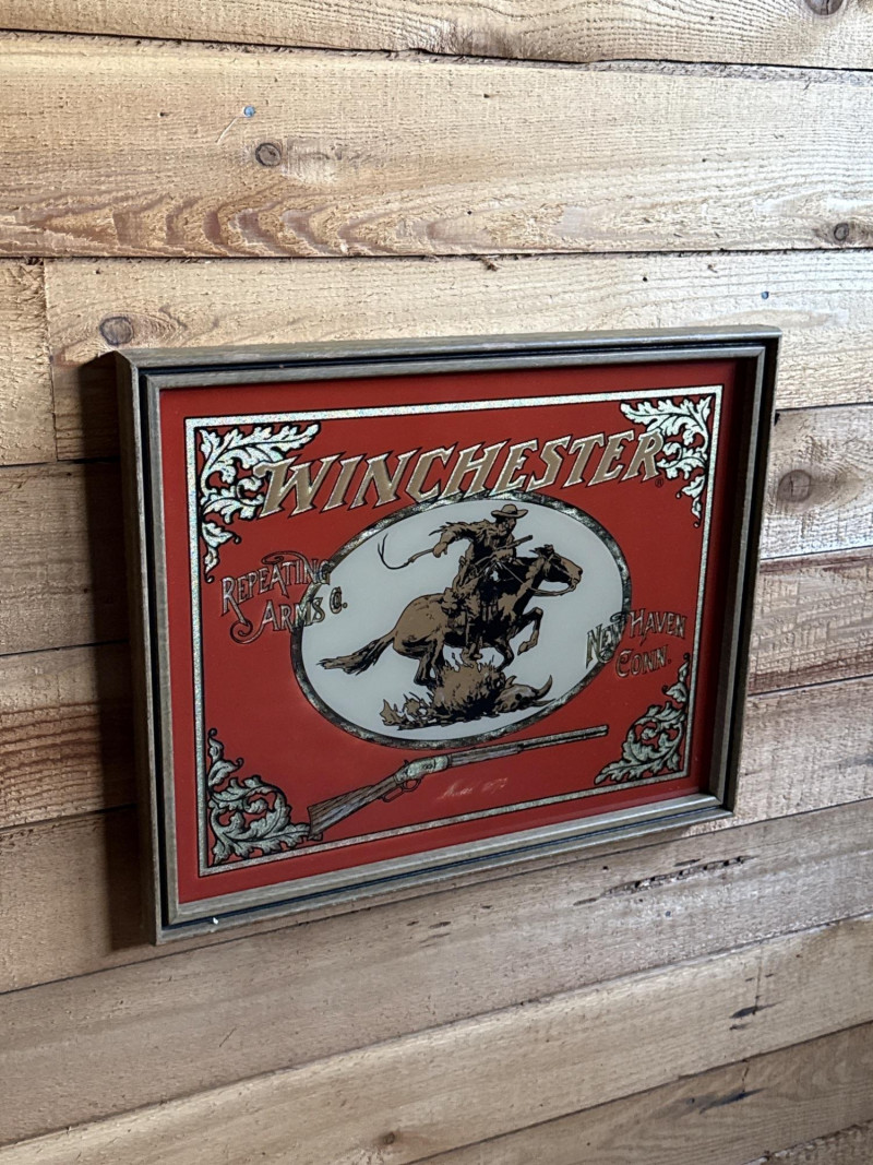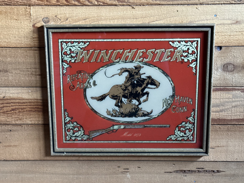 This lot features a vintage-style Winchester Advertising Glass Sign, ideal for collectors of sporting memorabilia or rustic decor. The sign depicts the classic Winchester "Rider" logo at its center, surrounded by a vibrant red border with ornate corner details and the iconic Winchester brand name.