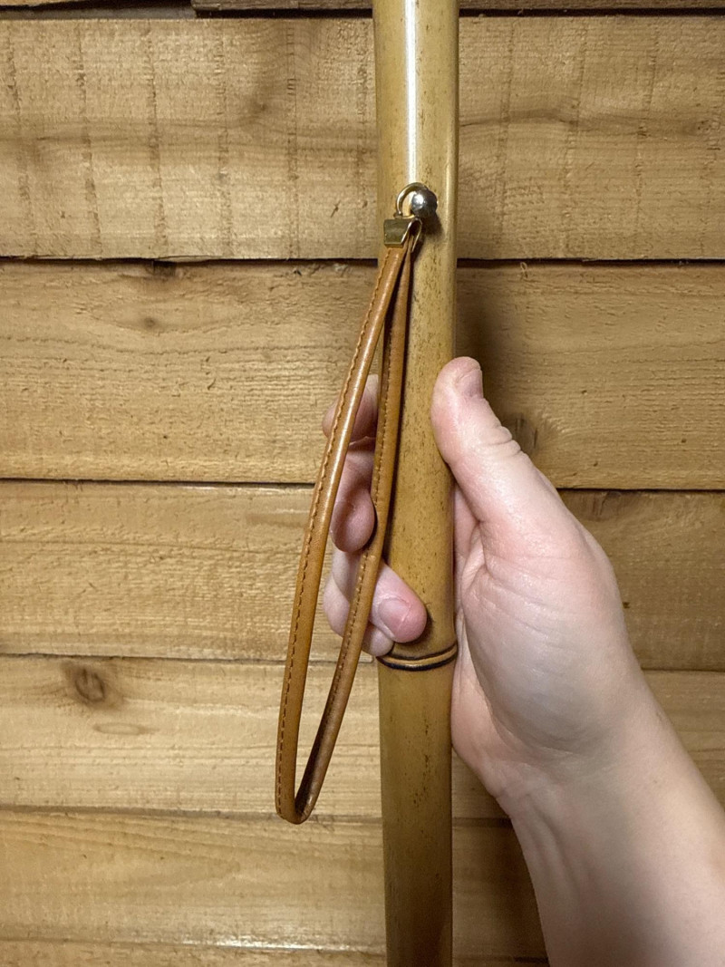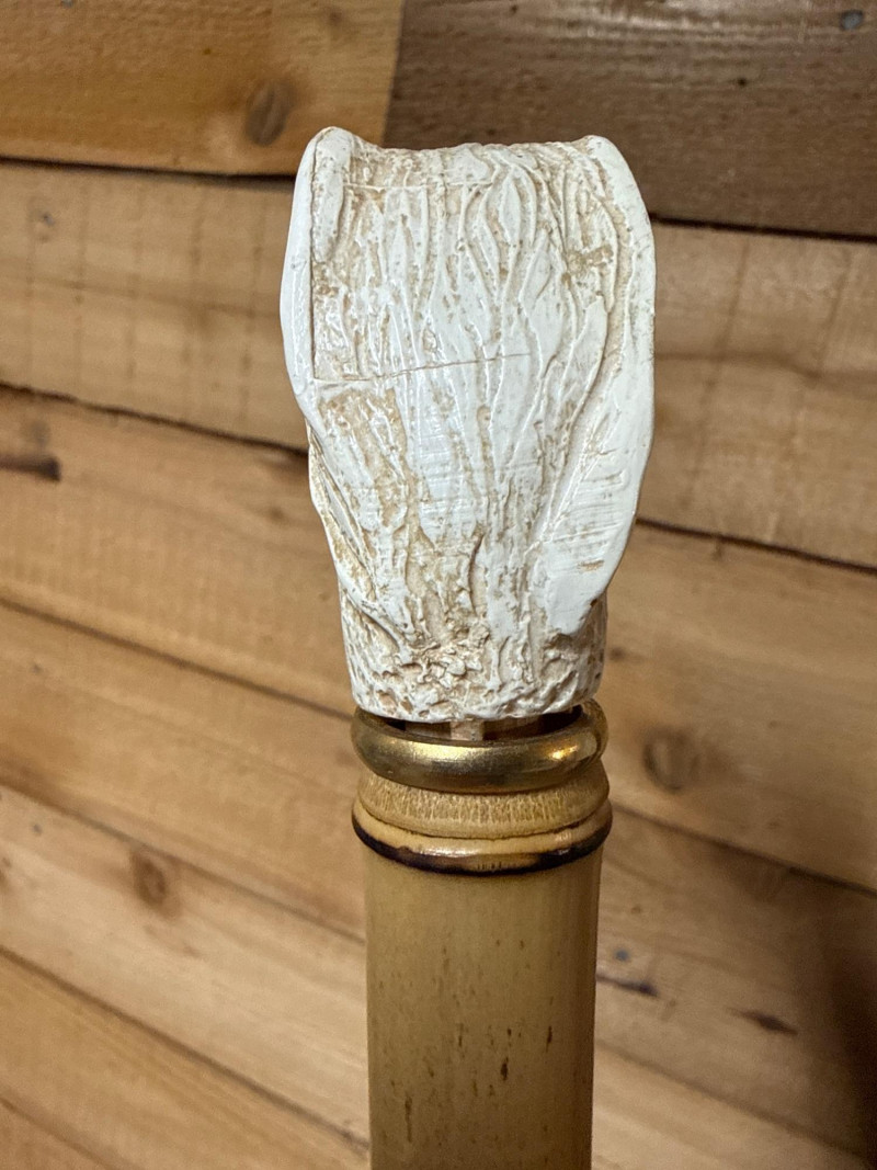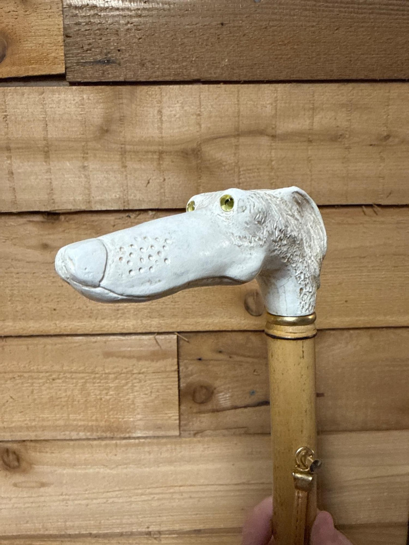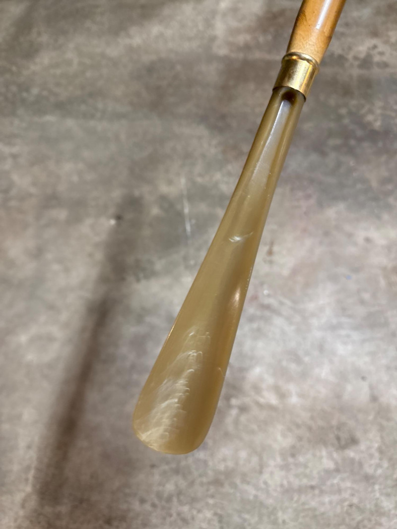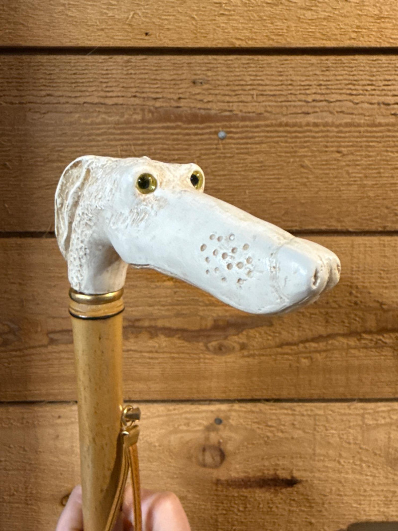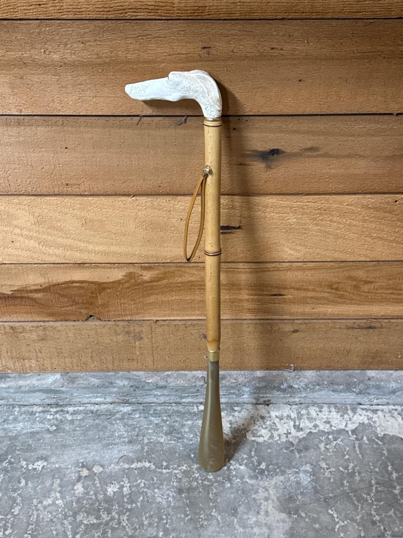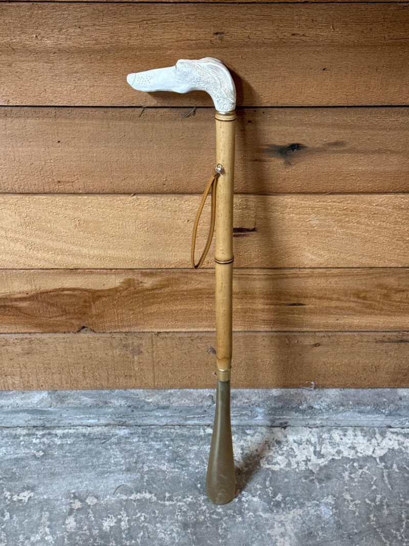 This lot features a unique Vintage Bakelite and Bamboo Shoe Horn, combining natural materials with mid-century style. The piece is highly decorative, featuring a handle carved into the shape of a dog's head. The eyes are glittery glass.
