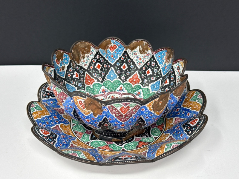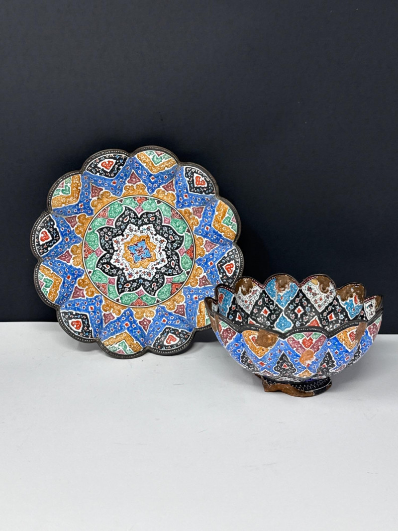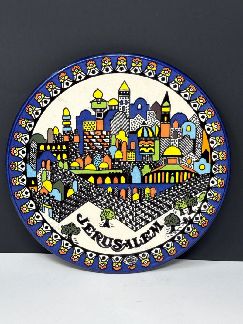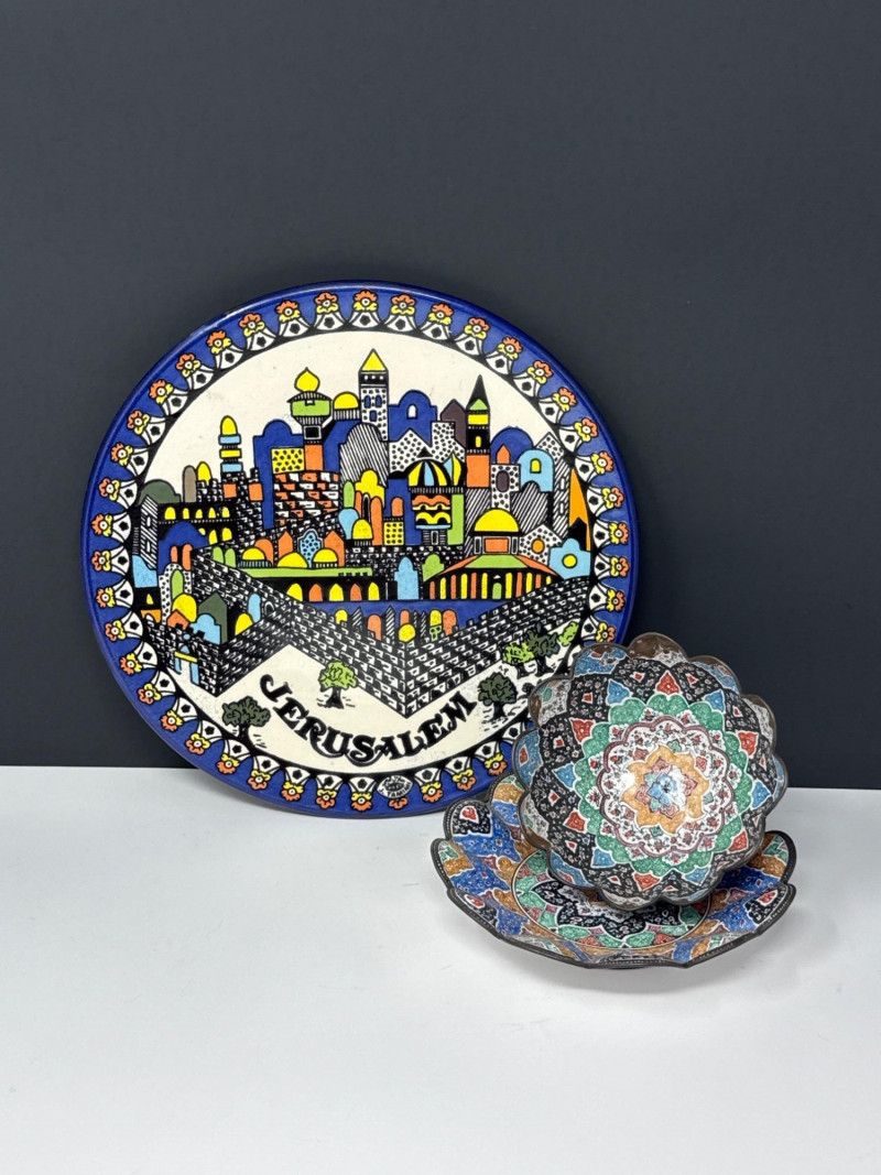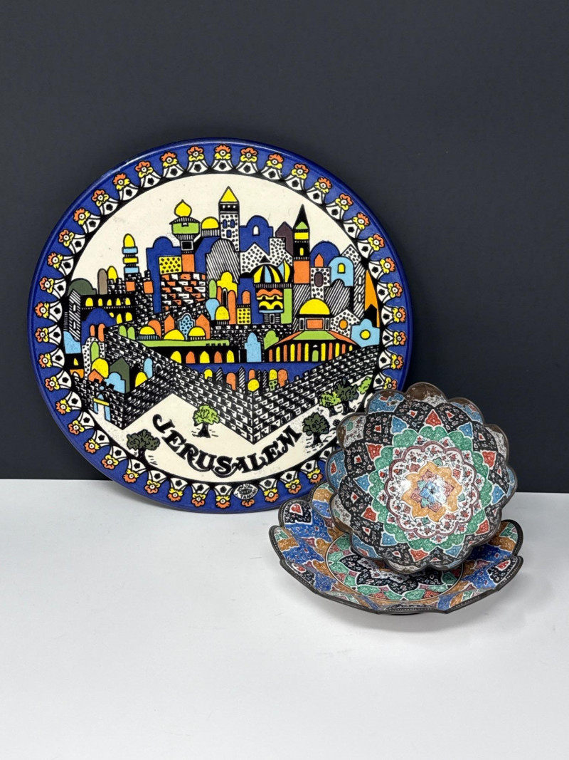 This lot features a vibrant three-piece collection of Middle Eastern decorative pottery and metalware, highlighted by a beautifully detailed Jerusalem souvenir plate. The set is perfect for collectors of global art or as unique display pieces. Jerusalem Plate: A colorful ceramic plate featuring a hand-painted architectural skyline and ornate border. Measures 10.5” Wide. Metal Scalloped Saucer: An intricate metal saucer with a scalloped edge and detailed patterning. Measures 6.5” Wide. Matching Bowl: A coordinating bowl that complements the metalwork design. Measures 5” Wide x 2.5” High. Category: Auction: Lot Number: 69. The pieces appear to be in good overall condition with bright colors and intact details. The metal bowl is in vintage condition, showing characteristic wear and patina consistent with its age. The back of the Jerusalem plate includes a hanging wire for easy wall display.Item Details:
