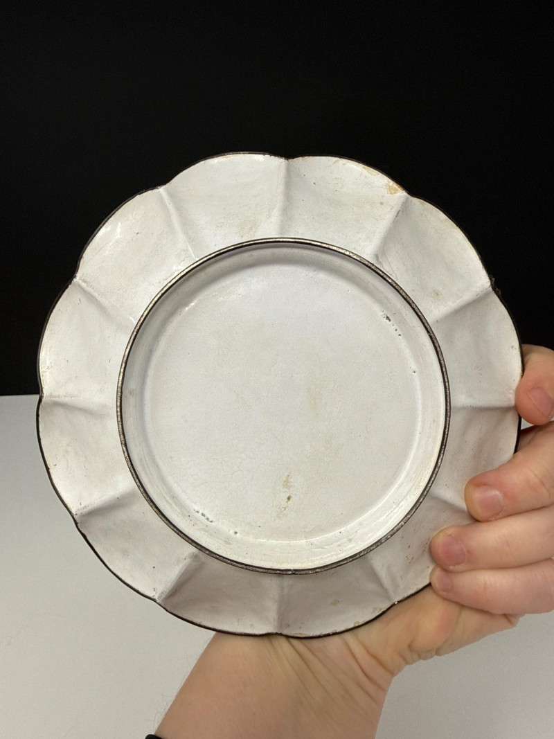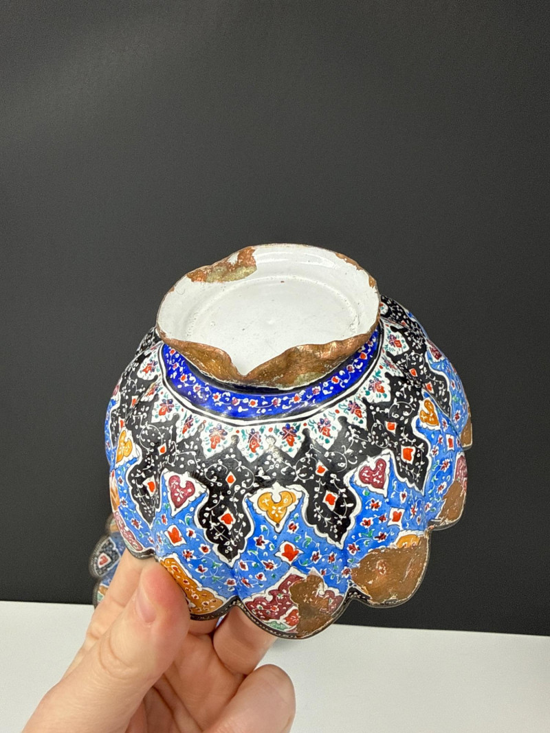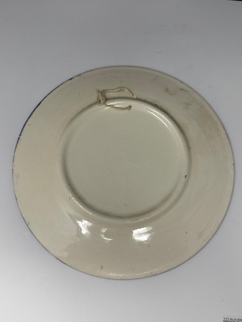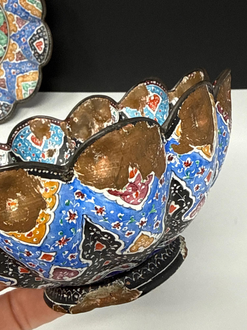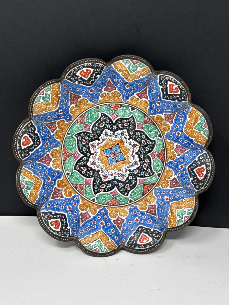 This lot features a vibrant three-piece collection of Middle Eastern decorative pottery and metalware, highlighted by a beautifully detailed Jerusalem souvenir plate. The set is perfect for collectors of global art or as unique display pieces. Jerusalem Plate: A colorful ceramic plate featuring a hand-painted architectural skyline and ornate border. Measures 10.5” Wide. Metal Scalloped Saucer: An intricate metal saucer with a scalloped edge and detailed patterning. Measures 6.5” Wide. Matching Bowl: A coordinating bowl that complements the metalwork design. Measures 5” Wide x 2.5” High. Category: Auction: Lot Number: 69. The pieces appear to be in good overall condition with bright colors and intact details. The metal bowl is in vintage condition, showing characteristic wear and patina consistent with its age. The back of the Jerusalem plate includes a hanging wire for easy wall display.Item Details: