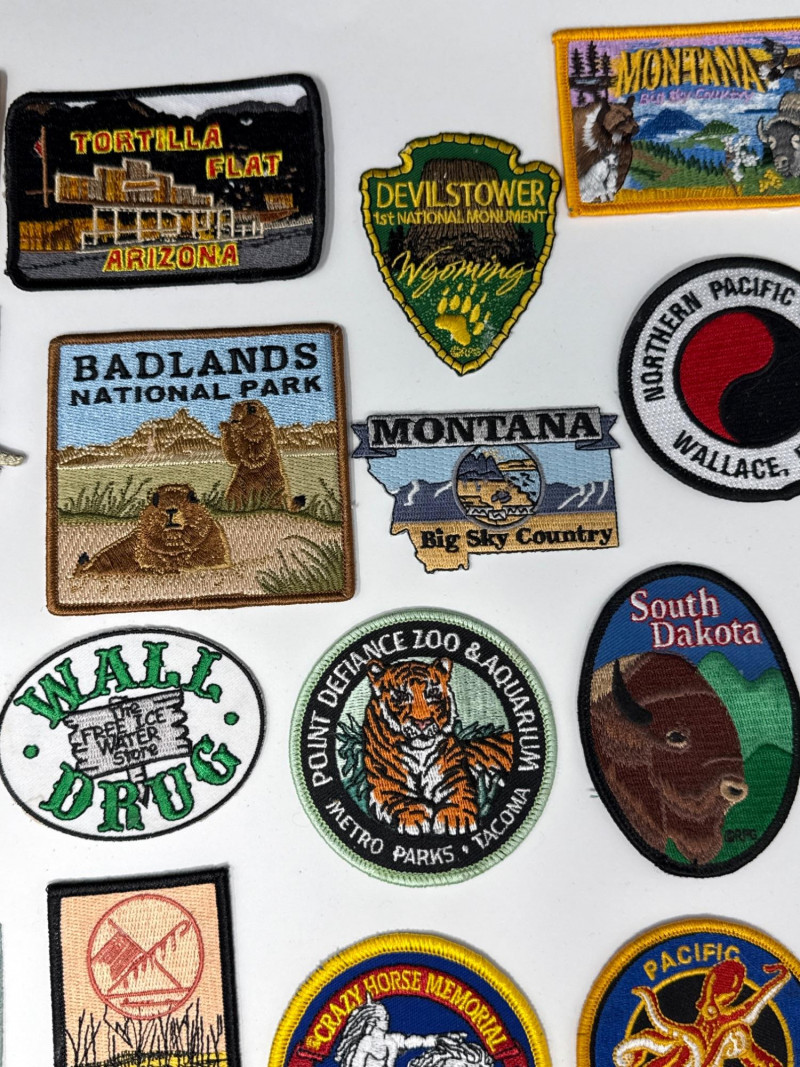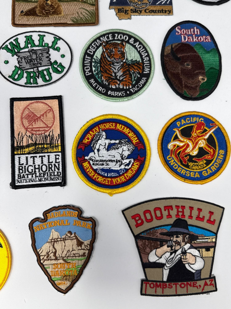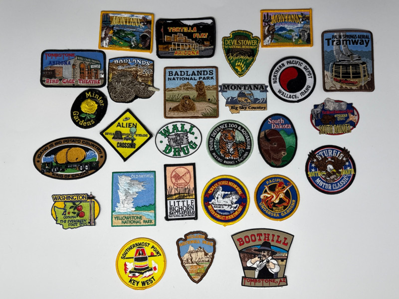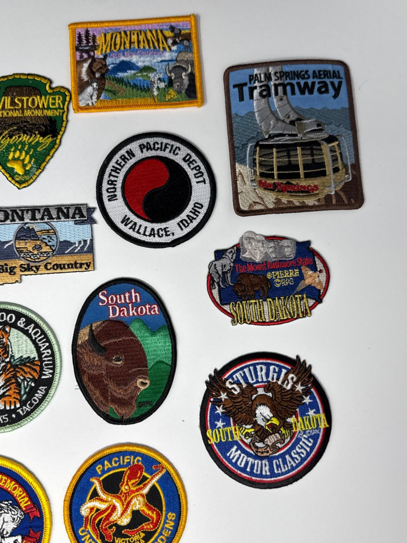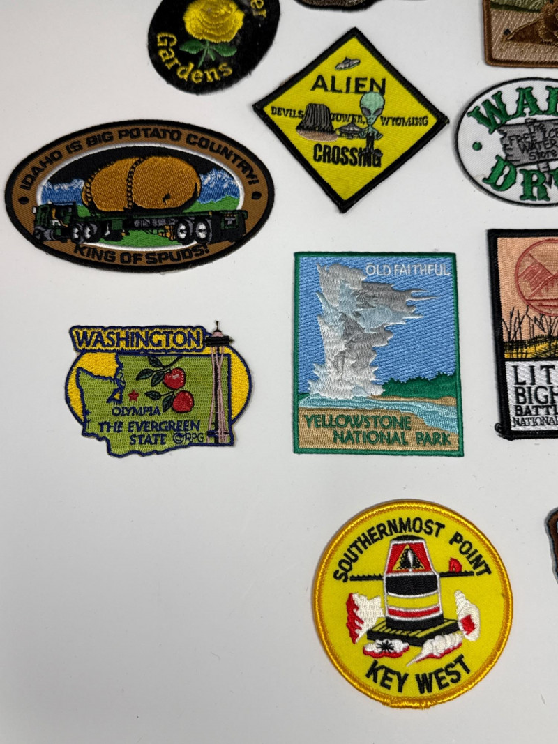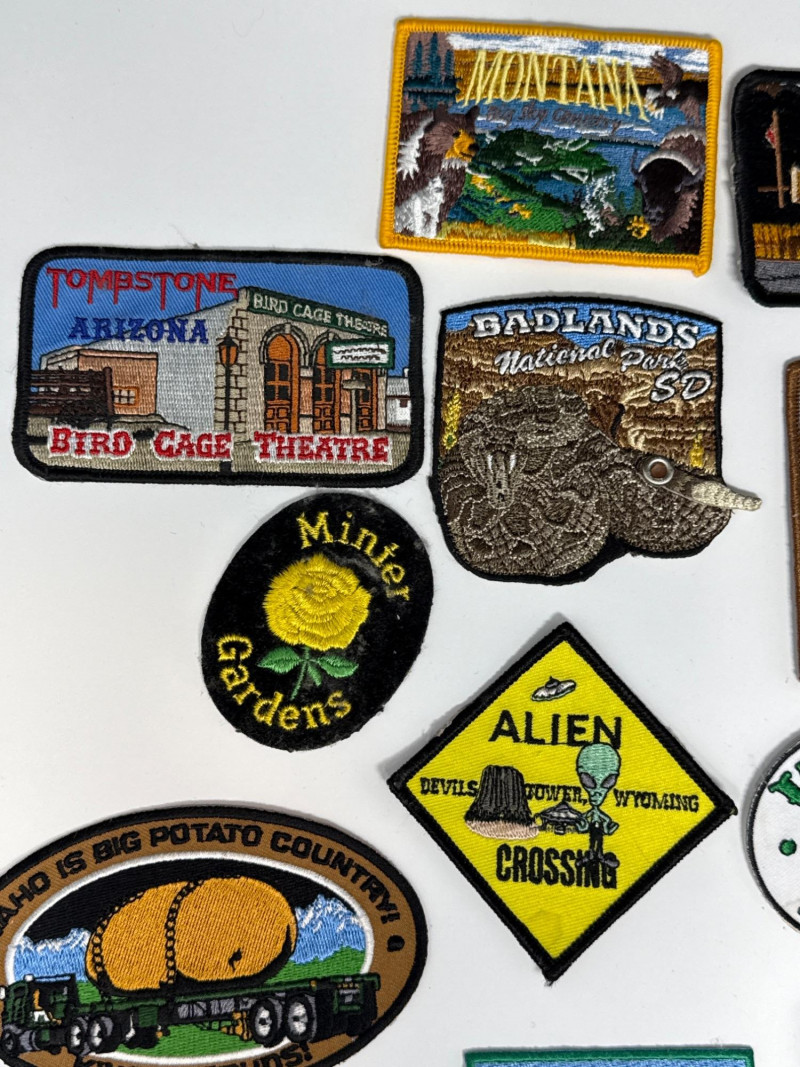This lot features a diverse and vibrant collection of souvenir and commemorative patches, perfect for travelers, collectors, or DIY enthusiasts looking to personalize gear. The set includes a wide variety of embroidered designs celebrating various destinations, activities, and historical events.