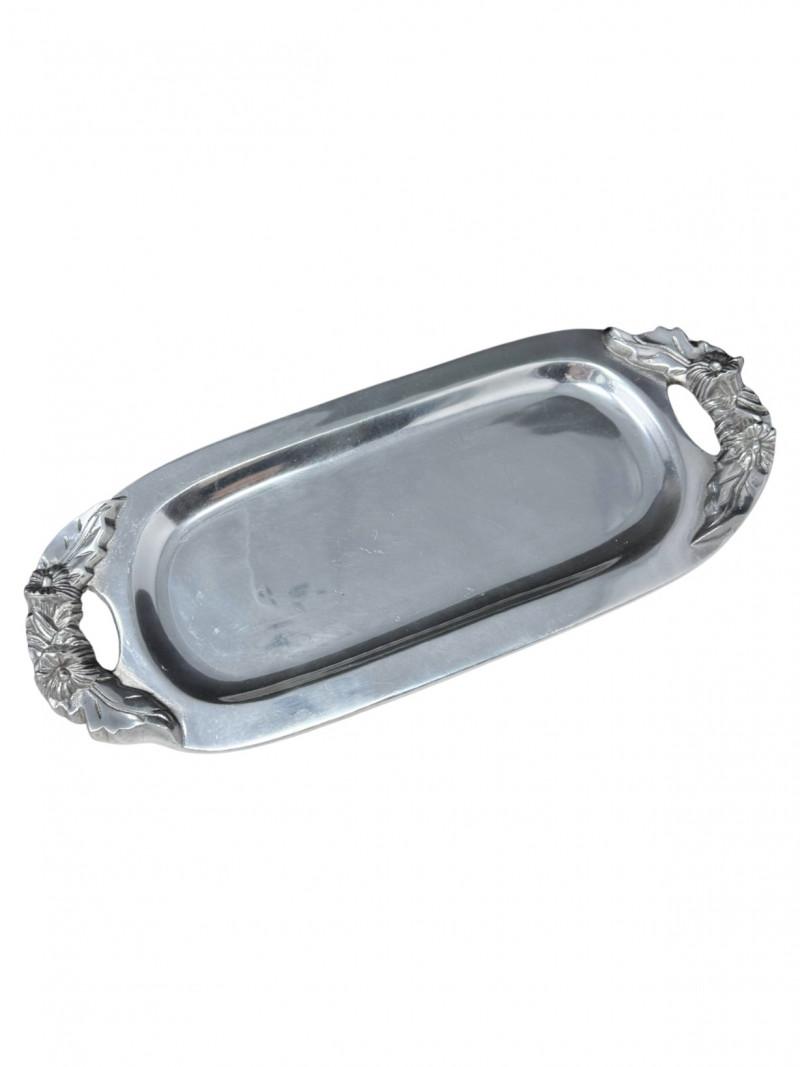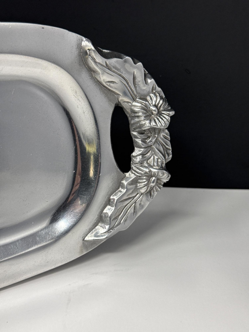 This lot features an elegant cast aluminum serving tray, attributed to the signature style of Arthur Court. The piece combines a classic polished finish with intricate organic detailing, making it a functional yet decorative addition to any table setting.