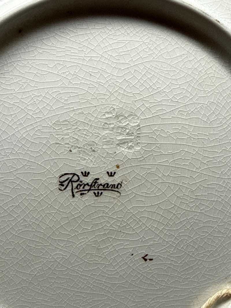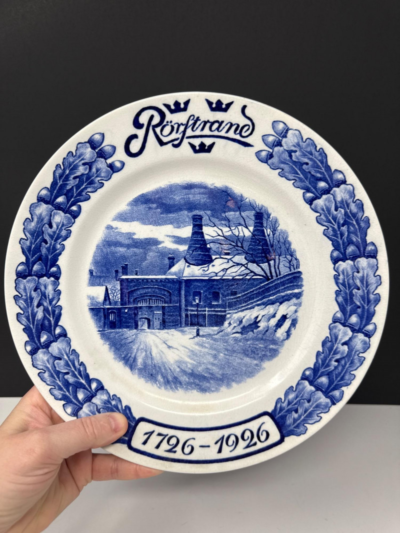 This lot features a curated collection of antique Swedish Rorstrand plates, celebrating the historic legacy of one of Europe's oldest ceramics manufacturers. The set includes both commemorative and decorative pieces showcasing traditional artistry. Brand: Commemorative Plate: Features a classic blue and white design commemorating the years 1726–1926, depicting a historic factory or estate scene. Decorative Scenic Plates: Two smaller plates featuring vibrant, multi-colored pastoral scenes of figures in a landscape. Dimensions: The set includes plates measuring 10” and 8.25”. These items are in antique, used condition. The large blue and white plate includes the official Item Details: