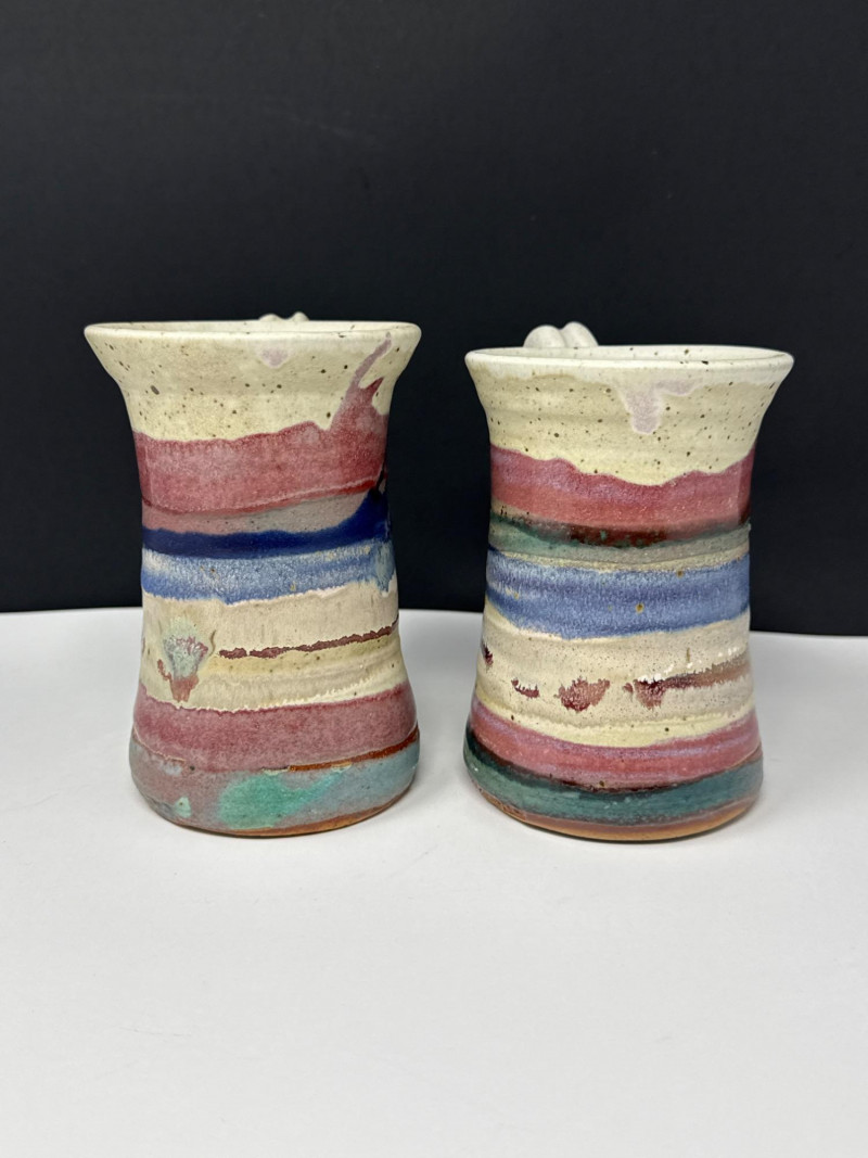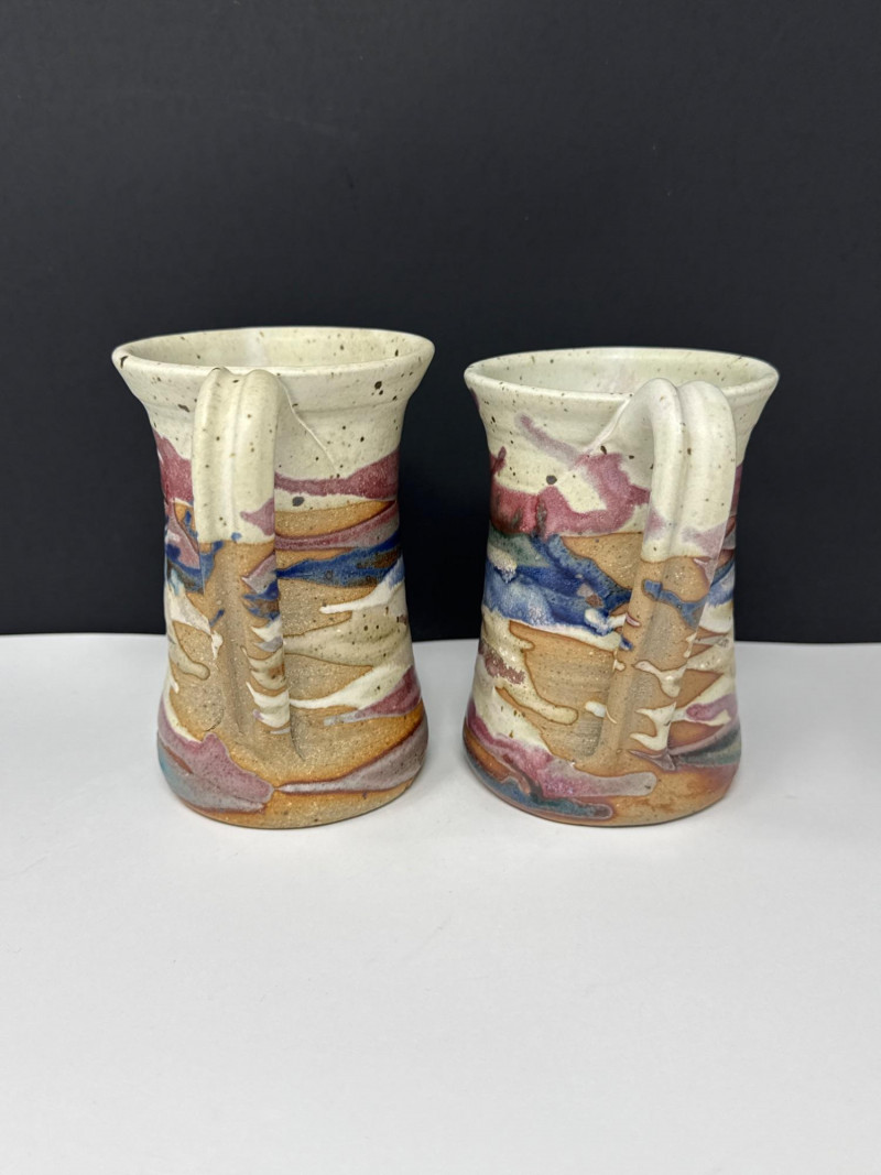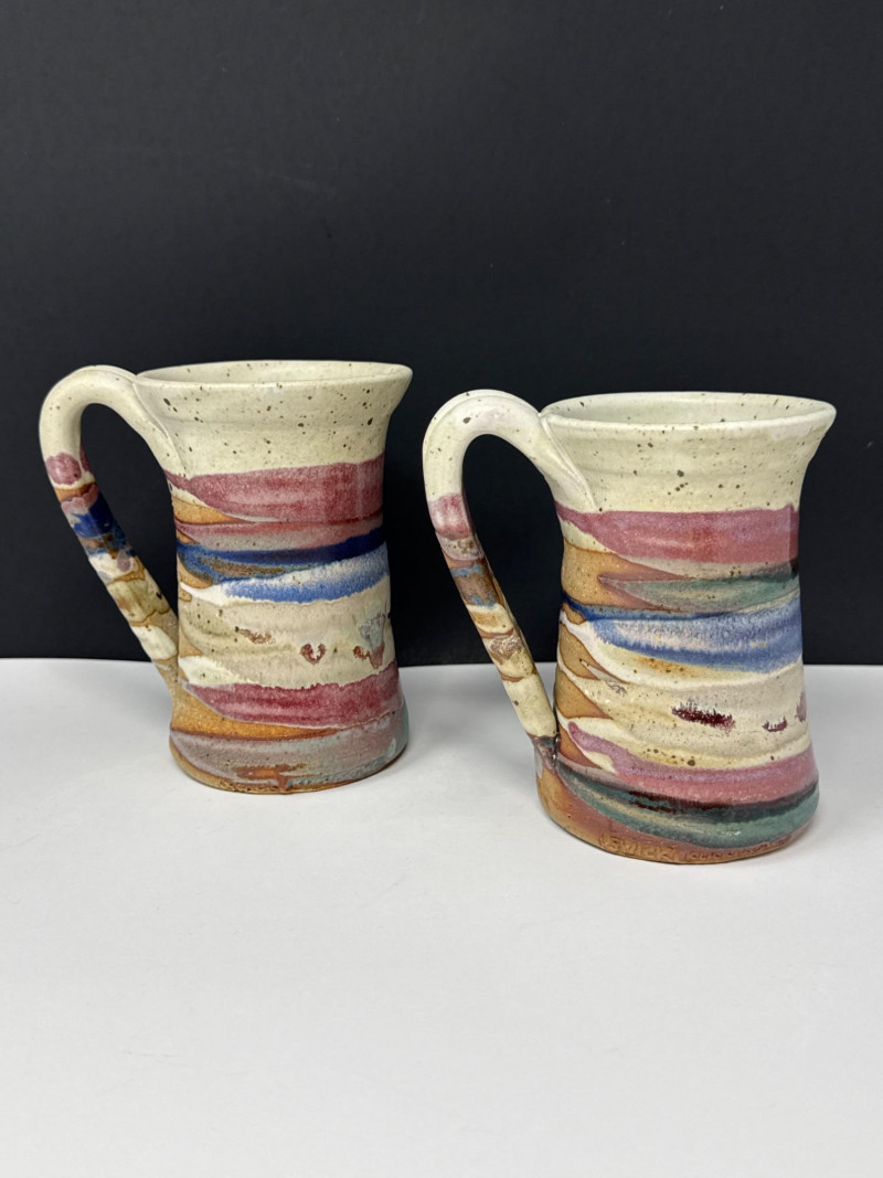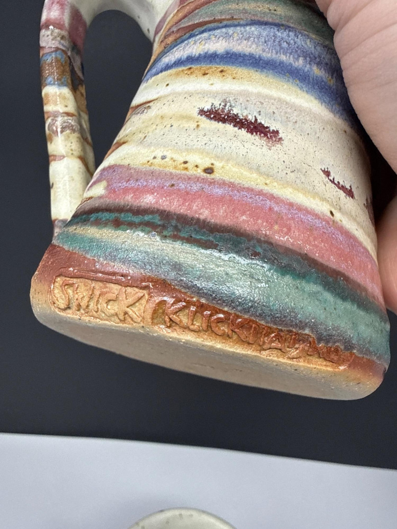 This lot features a set of two handcrafted Klickitat Studio pottery mugs, characterized by their artistic, multi-colored glaze and rustic stoneware construction. These pieces are functional works of art,