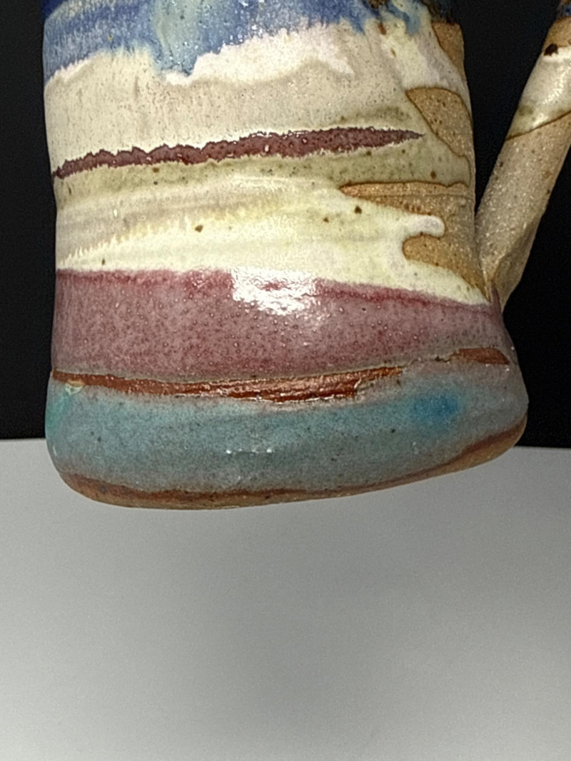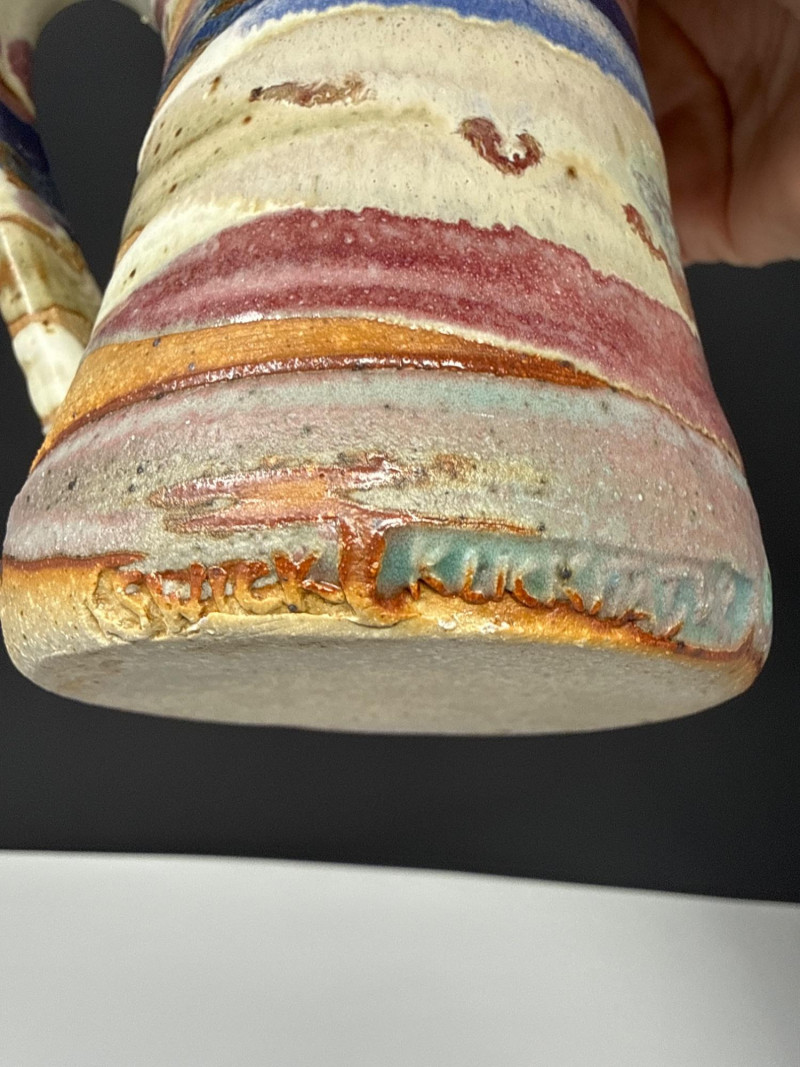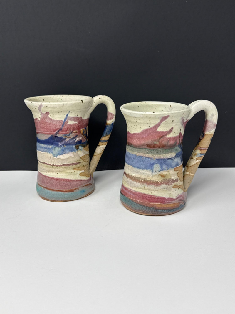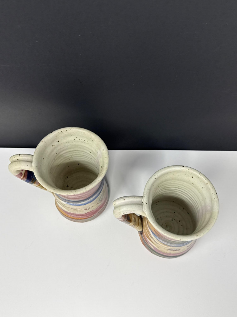 This lot features a set of two handcrafted Klickitat Studio pottery mugs, characterized by their artistic, multi-colored glaze and rustic stoneware construction. These pieces are functional works of art,