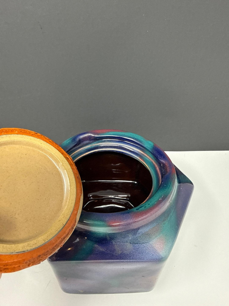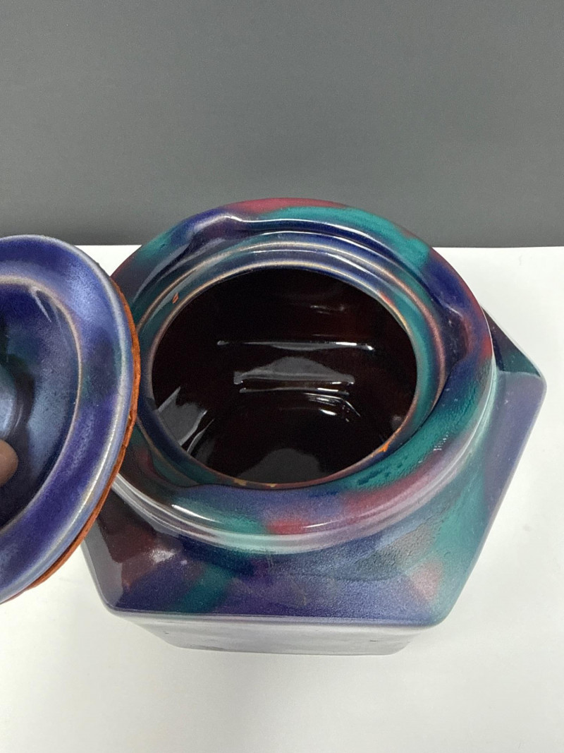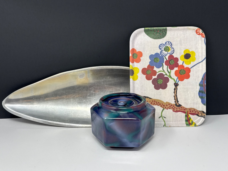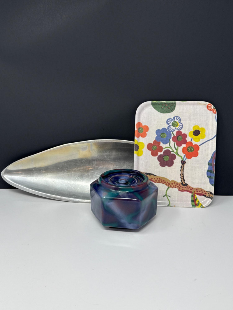 This lot features a sophisticated three-piece collection of vintage decor, blending metallic elegance with artisanal ceramic craftsmanship. The set includes a large silver-tone tray, a smaller Swedish-style patterned tray, and a unique iridescent pottery jar. Large Silver-Tone Tray: A long, sleek serving tray with a polished metallic finish. It measures 19.5” Wide x 6.5” Deep. Swedish Decorative Tray: A rectangular tray featuring a vibrant floral and botanical pattern. It measures 10.25” x 7.75”. Iridescent Pottery Jar: A hexagonal-shaped jar with a stunning metallic, iridescent glaze that shifts in color. It includes a matching lid and measures 6.25” Wide x 4” Height.Item Details: